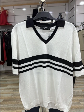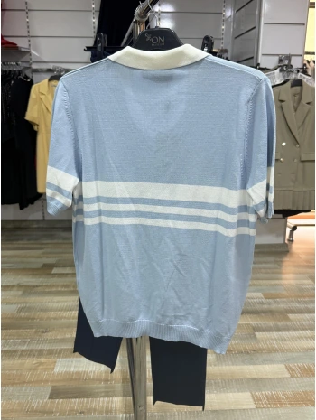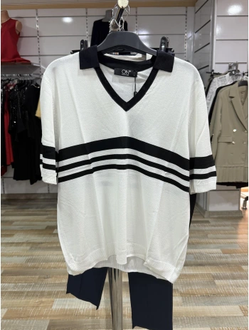 On Fashion Çizgi Detaylı Polo Yaka Kısa Kol Bluz 53300