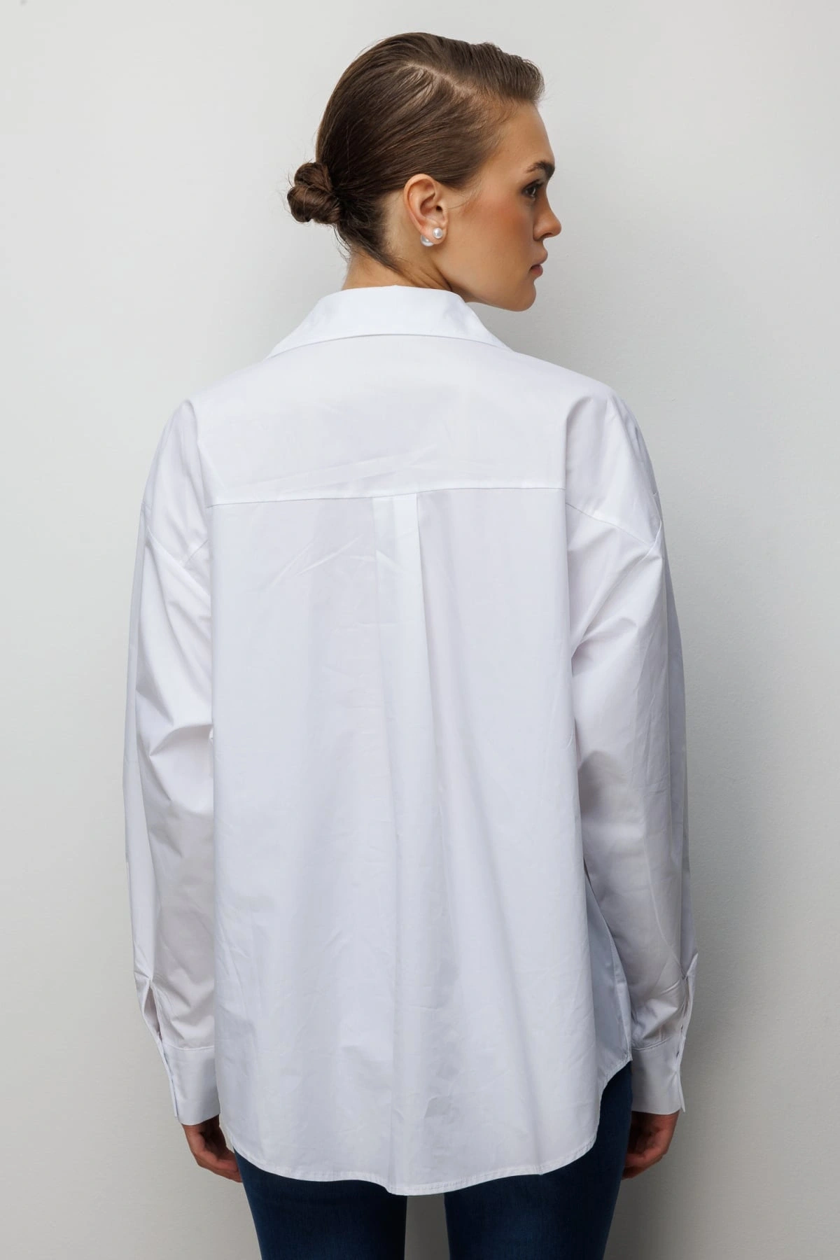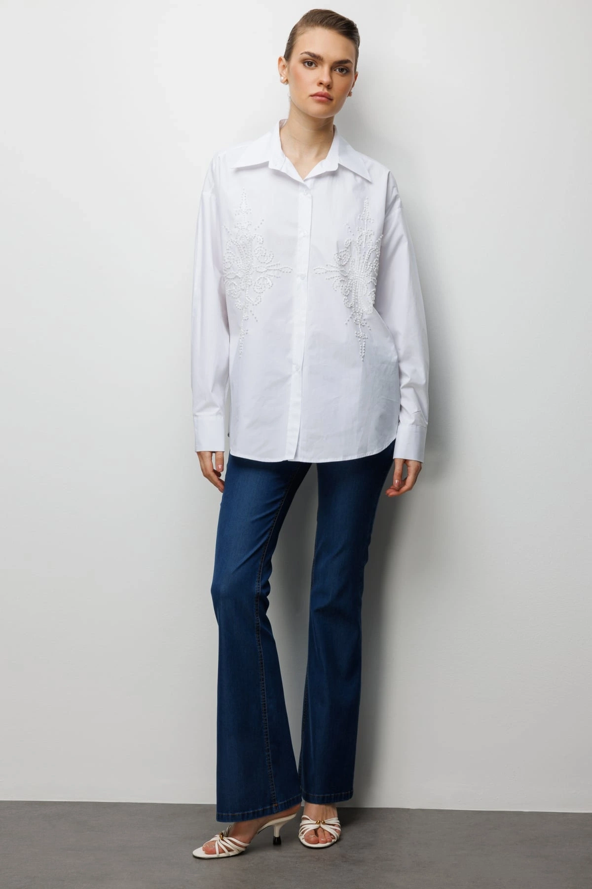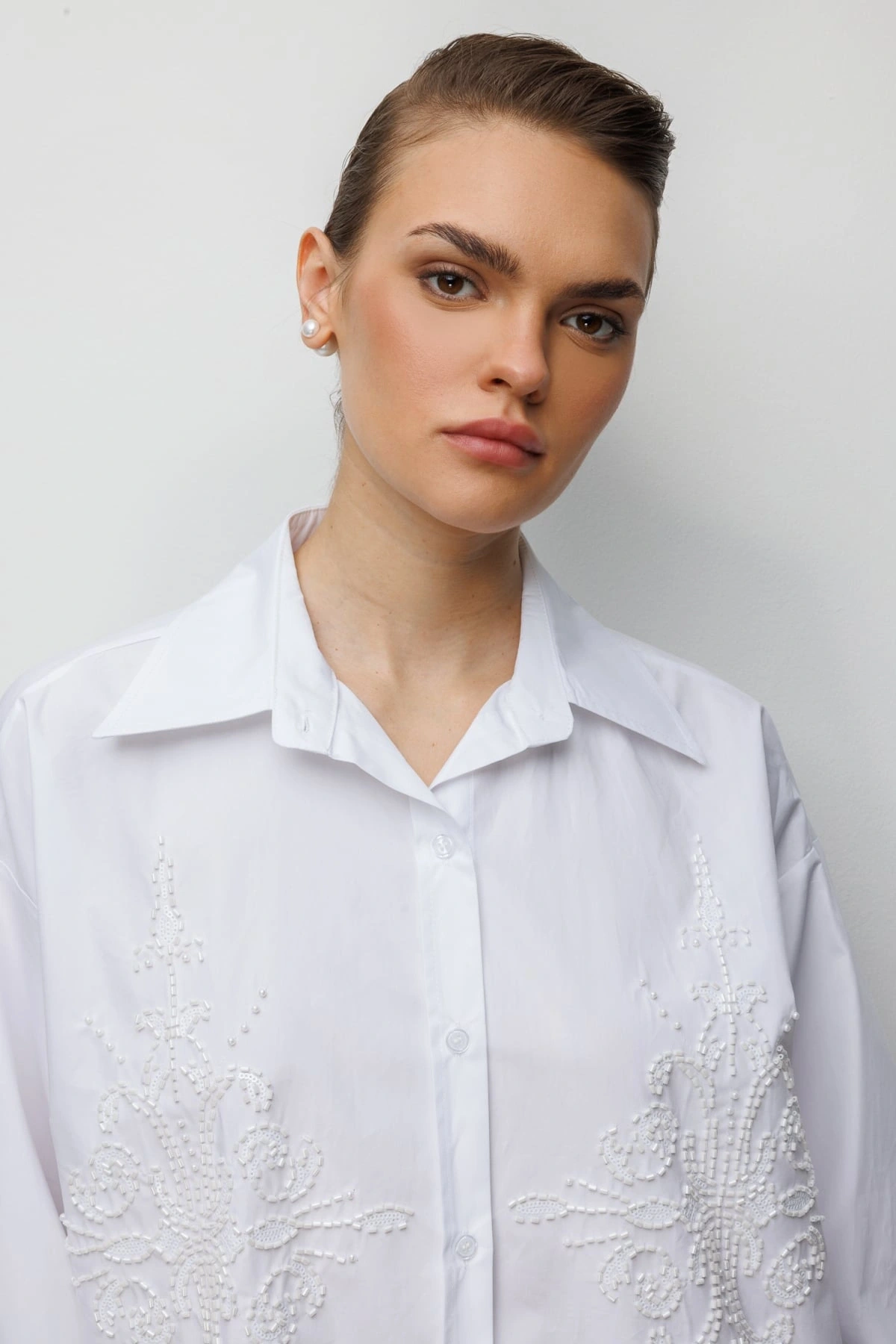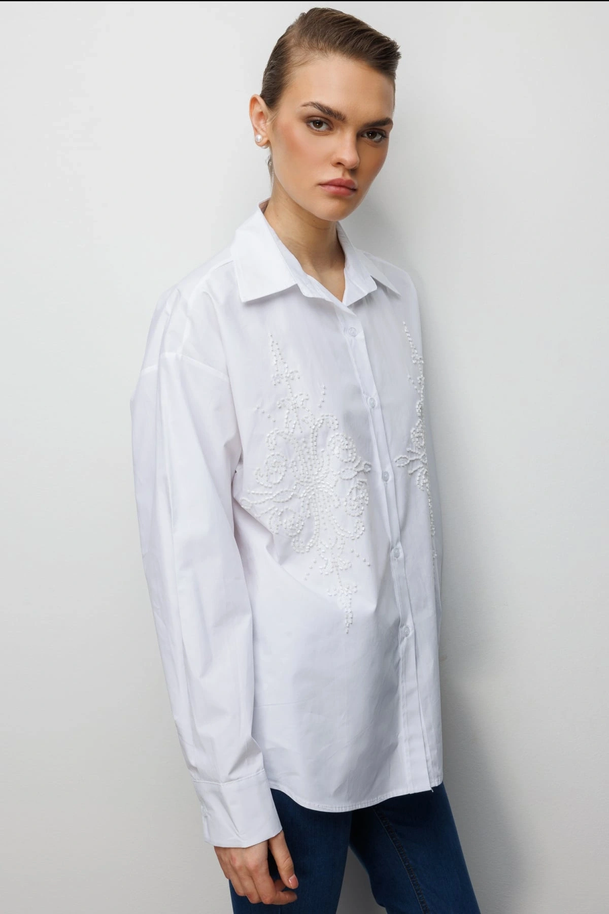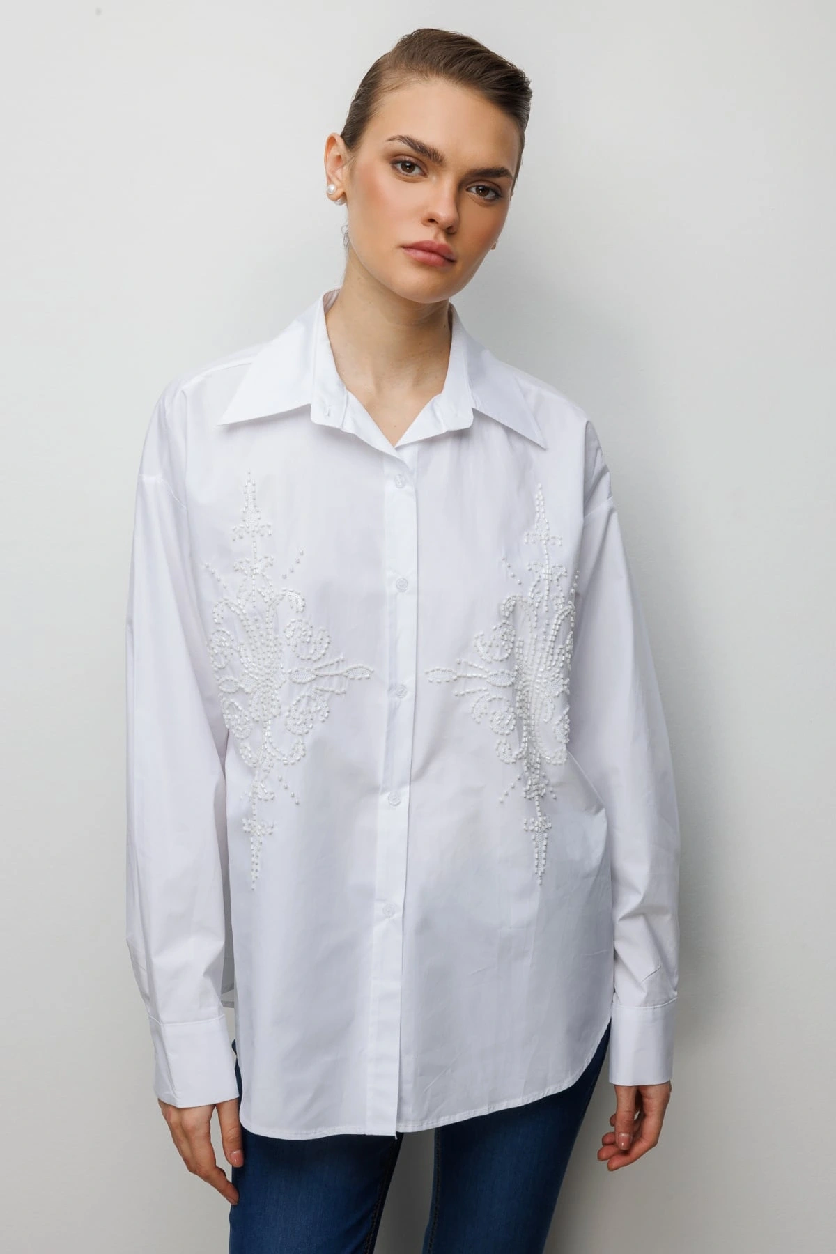 Ekol Boncuk İşlemeli Oversize Pamuk Gömlek 02808