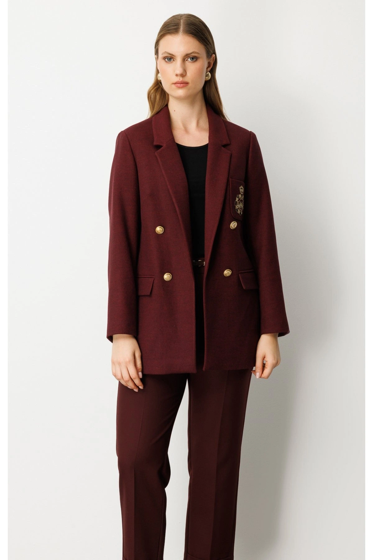 Ekol Büyük Beden Cebi Armalı Bordo Kadın Ceket 05571