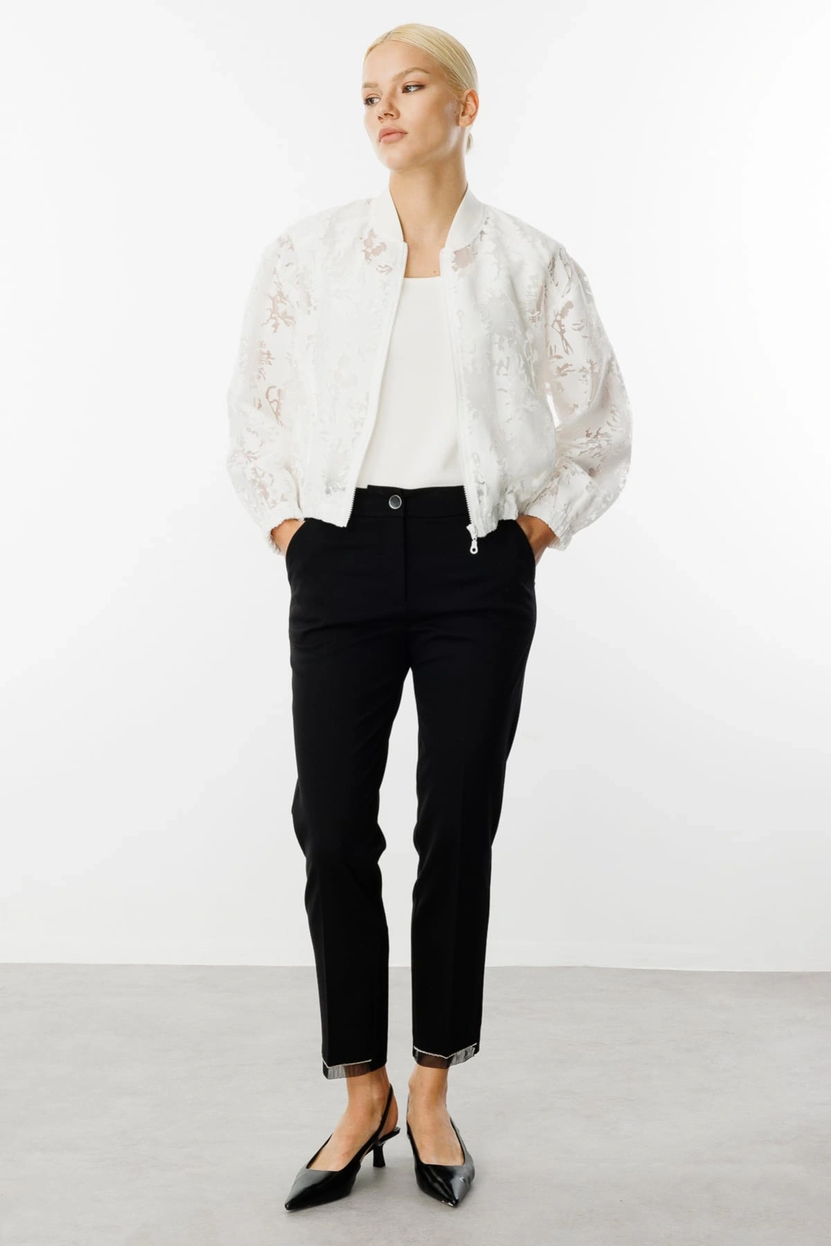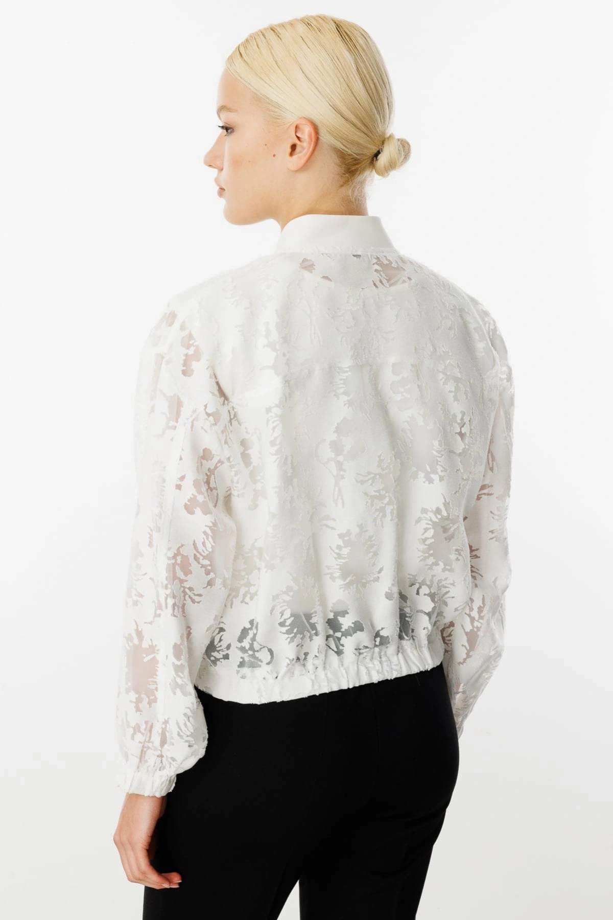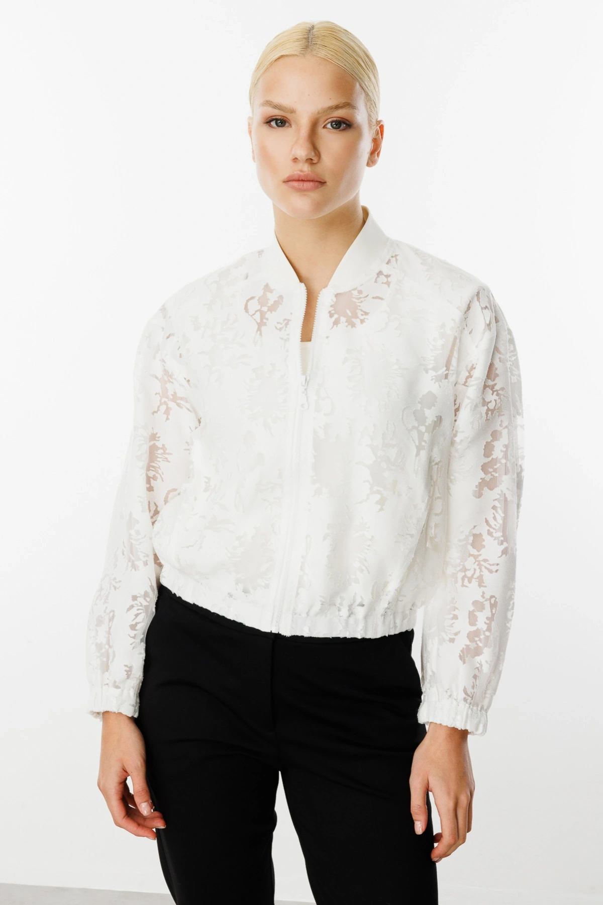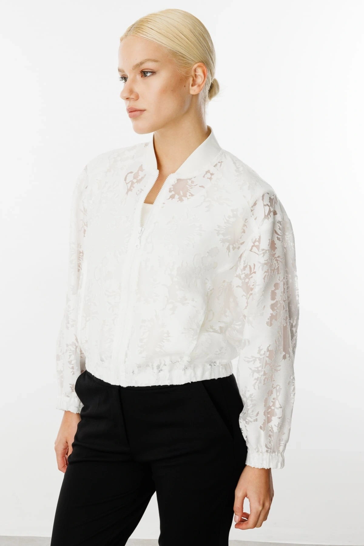 Dik yaka detayı, modele sportif ve modern bir karakter kazandırırken uzun ve standart kol yapısı, klasik bomber siluetini tamamlar. Astarlı yapısı, tül dokulu tasarıma konfor eklerken fermuarlı kapama şekli, pratik ve kullanışlı bir deneyim sunar. Yan cep detayları, hem işlevsellik hem de günlük kullanım kolaylığı sağlar.