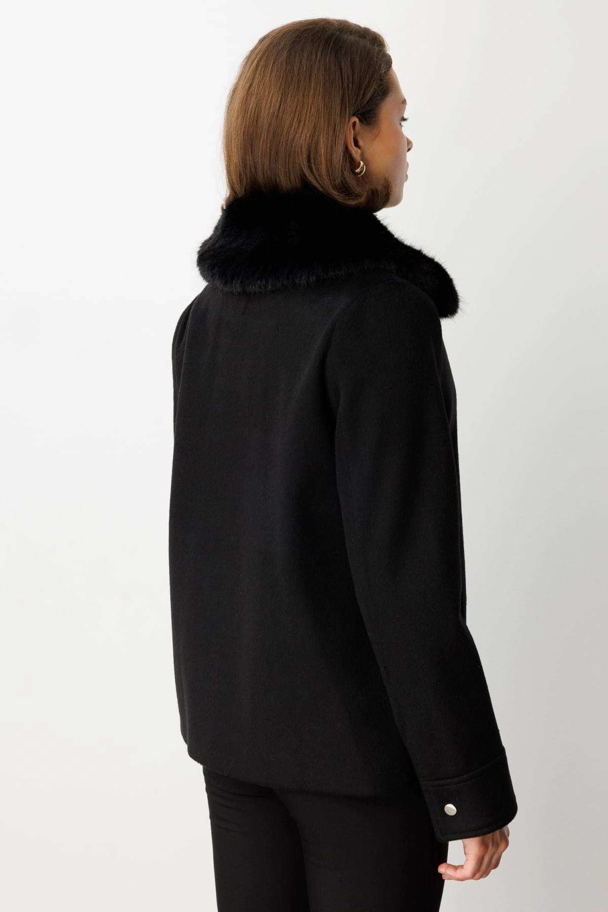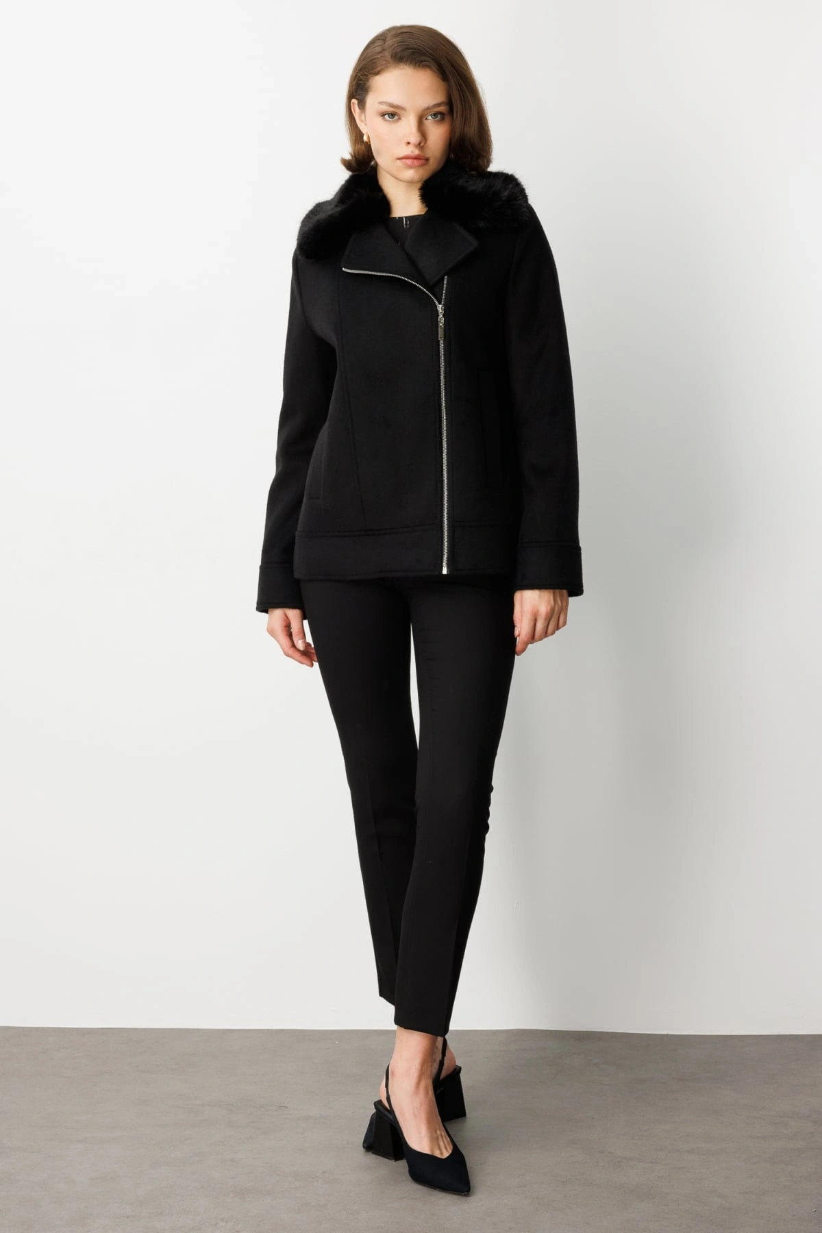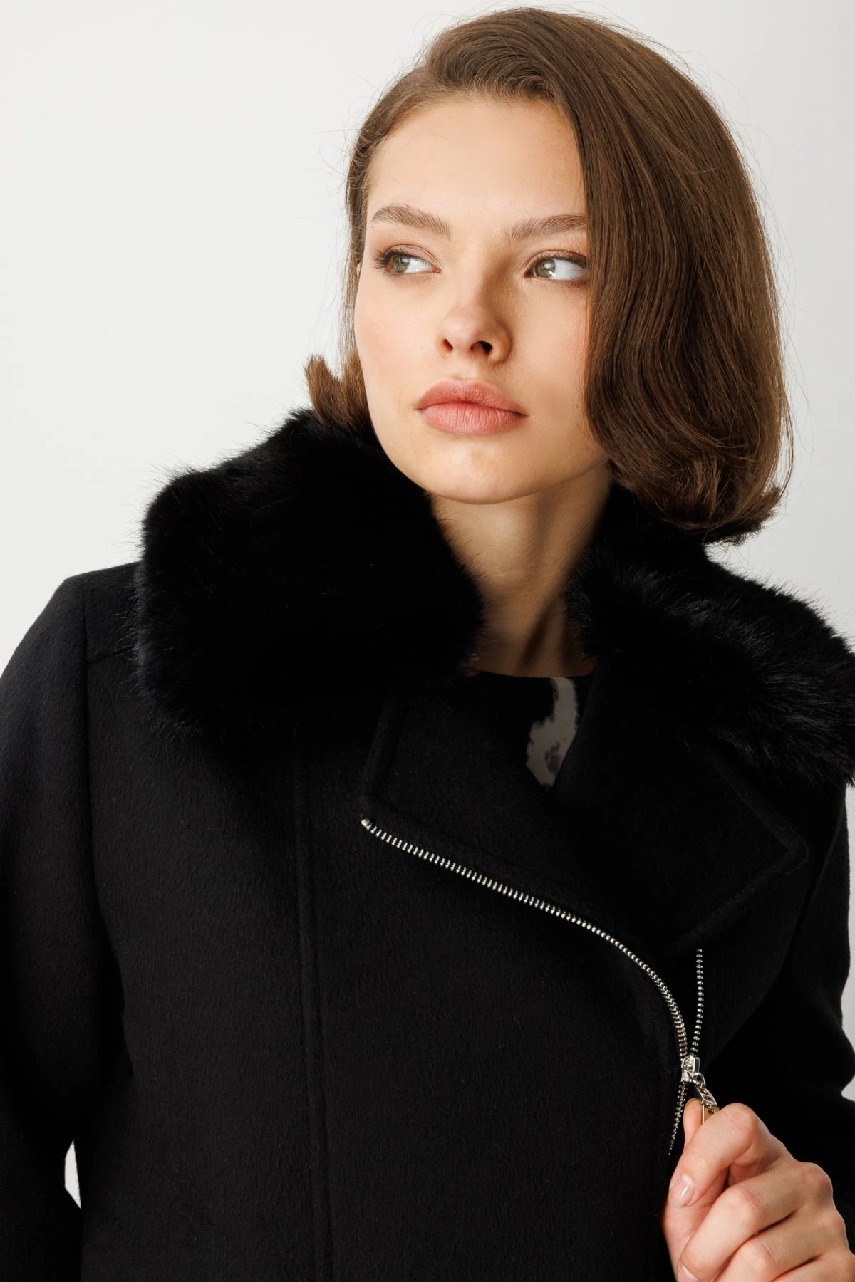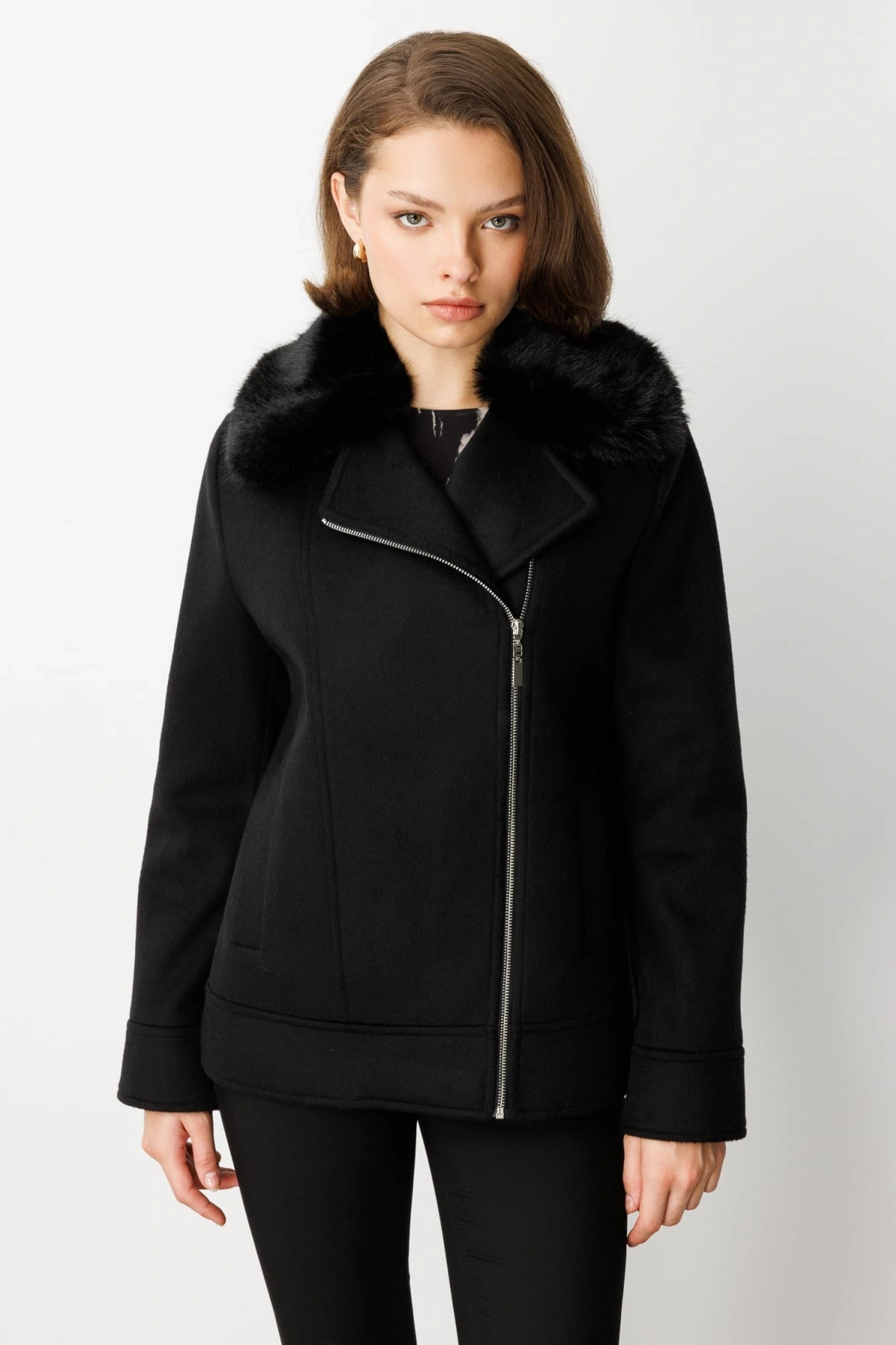 Ekol Kadın Yan Fermuarlı Yakası Peluş Siyah Kadın Manto 06085