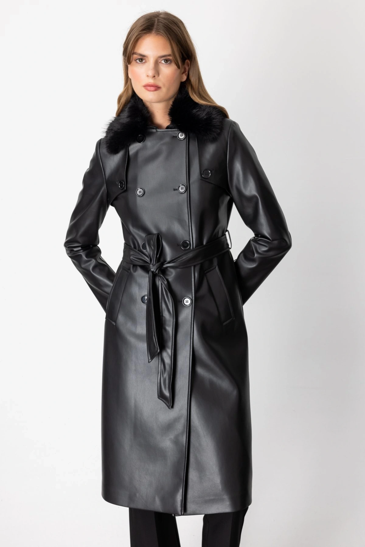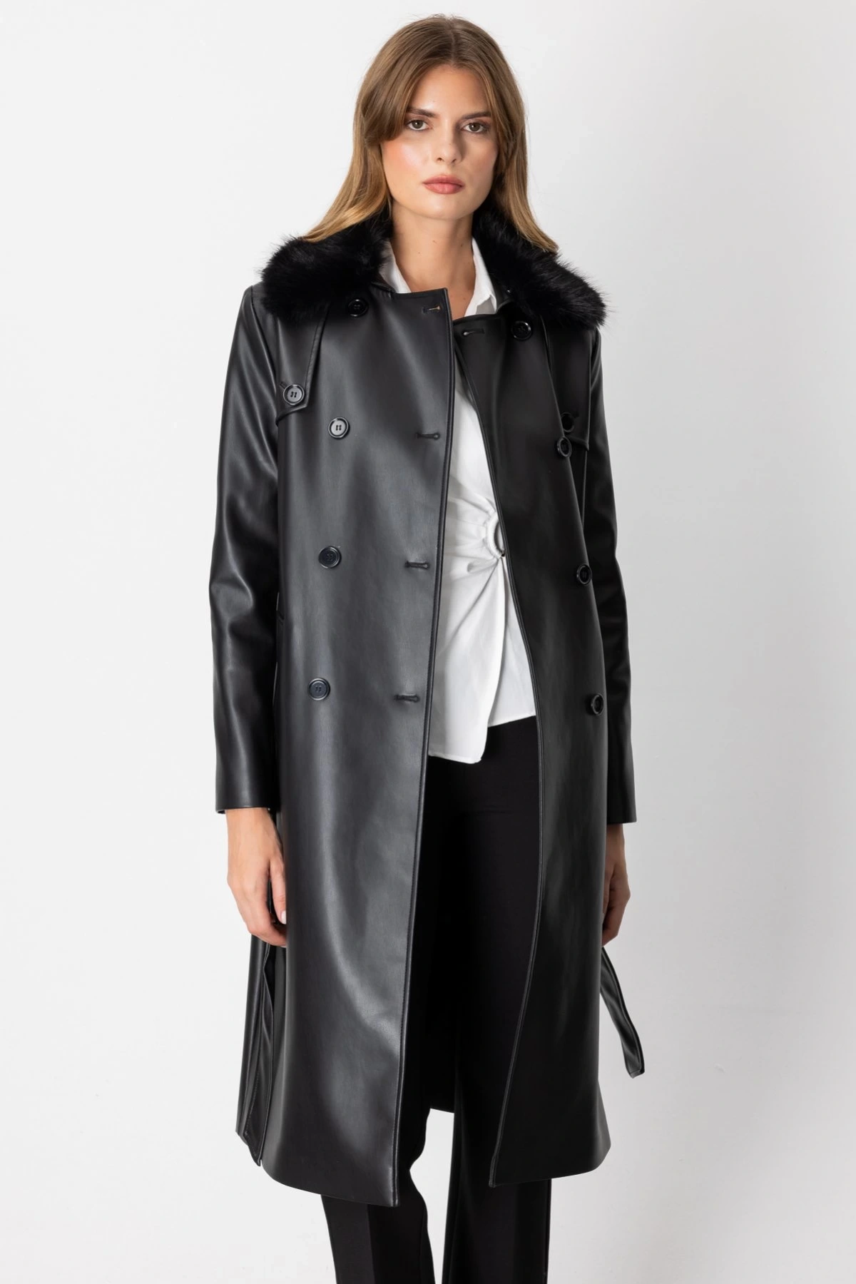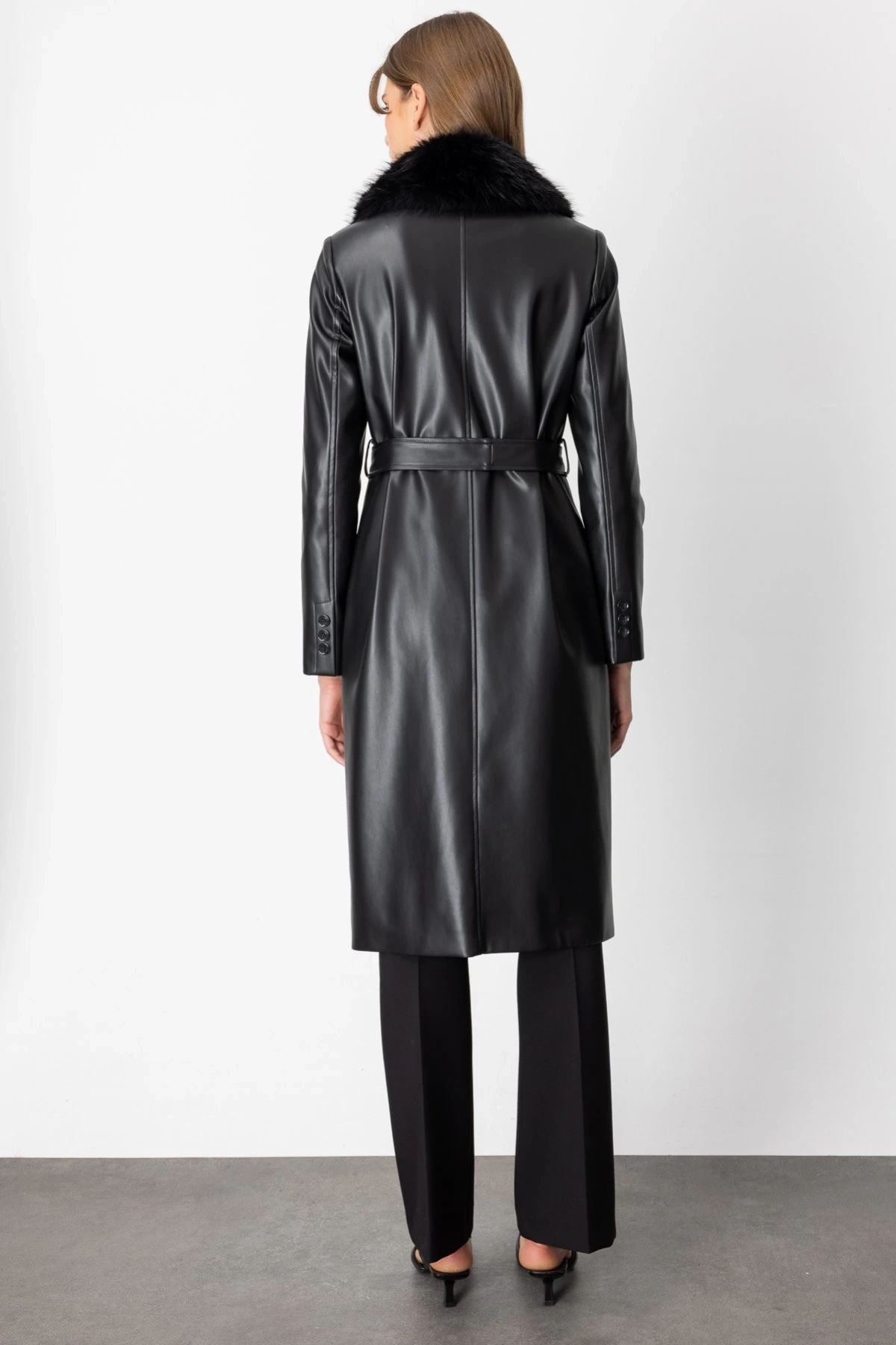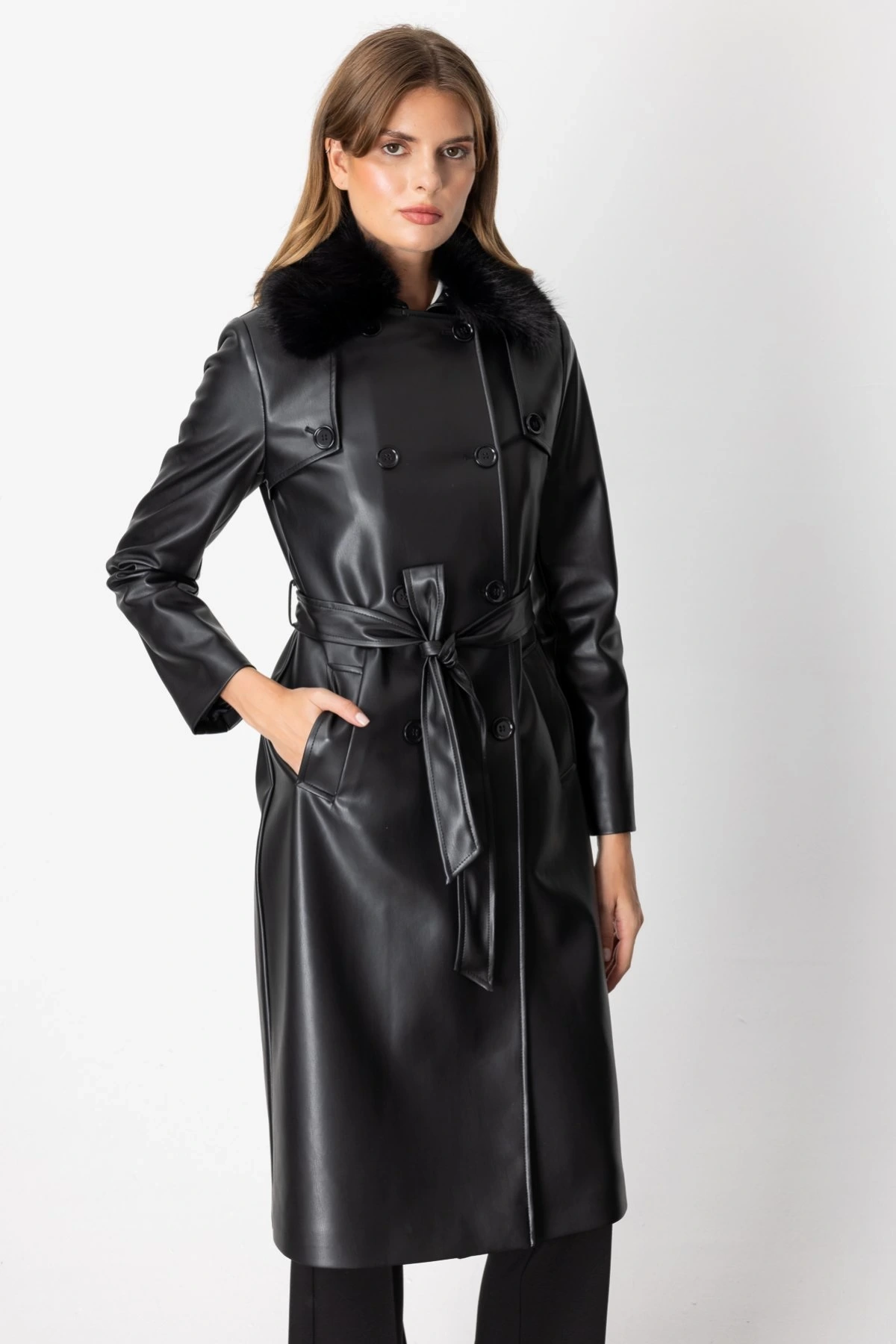 Ekol Yakası Kürklü Deri Trençkot 07007