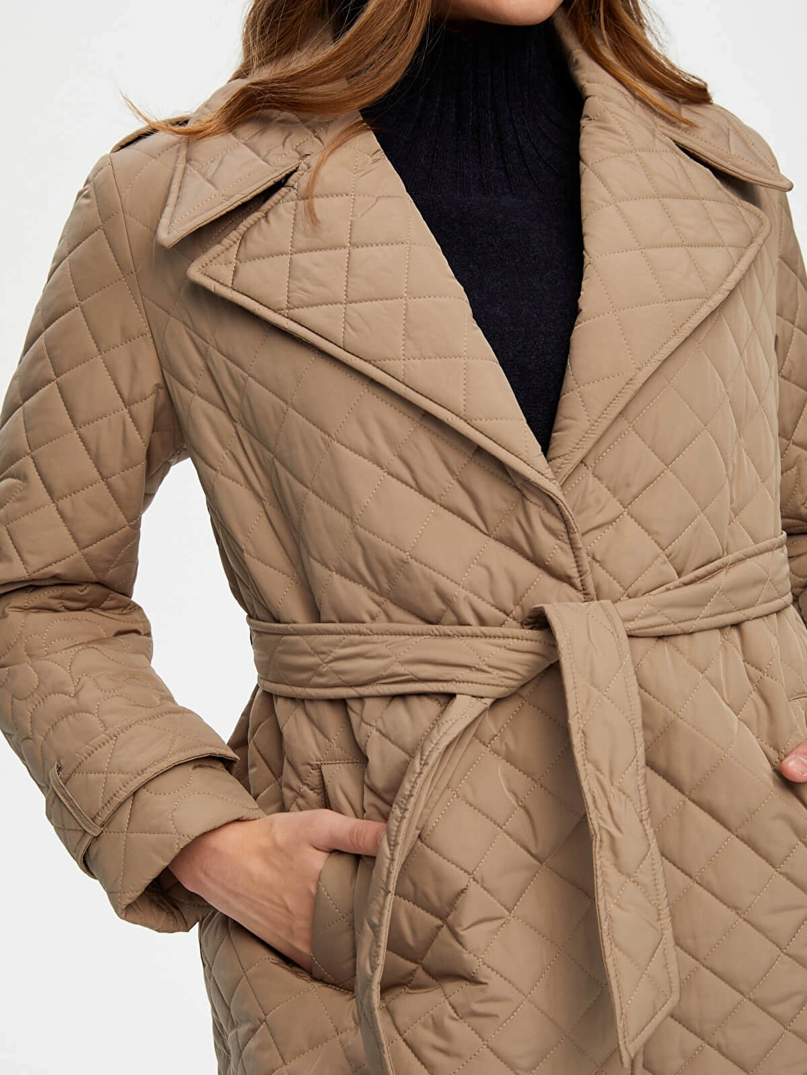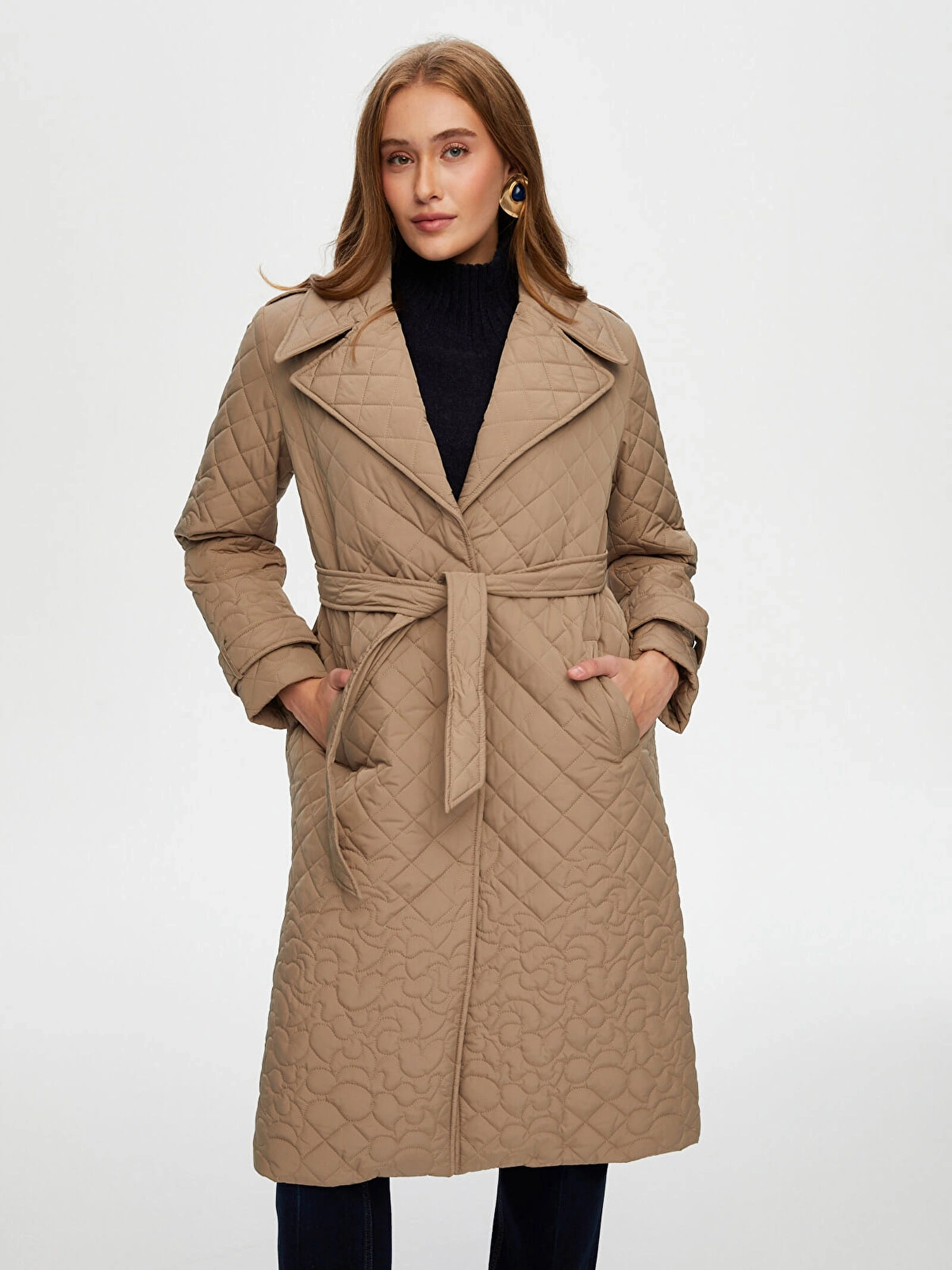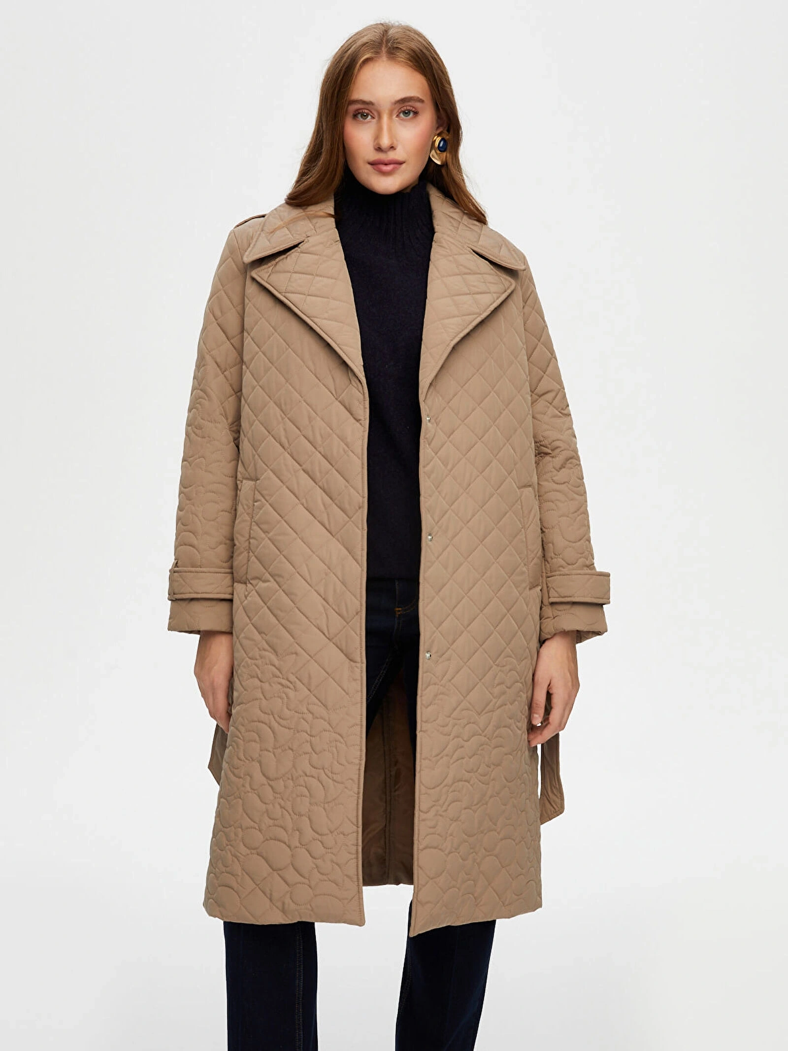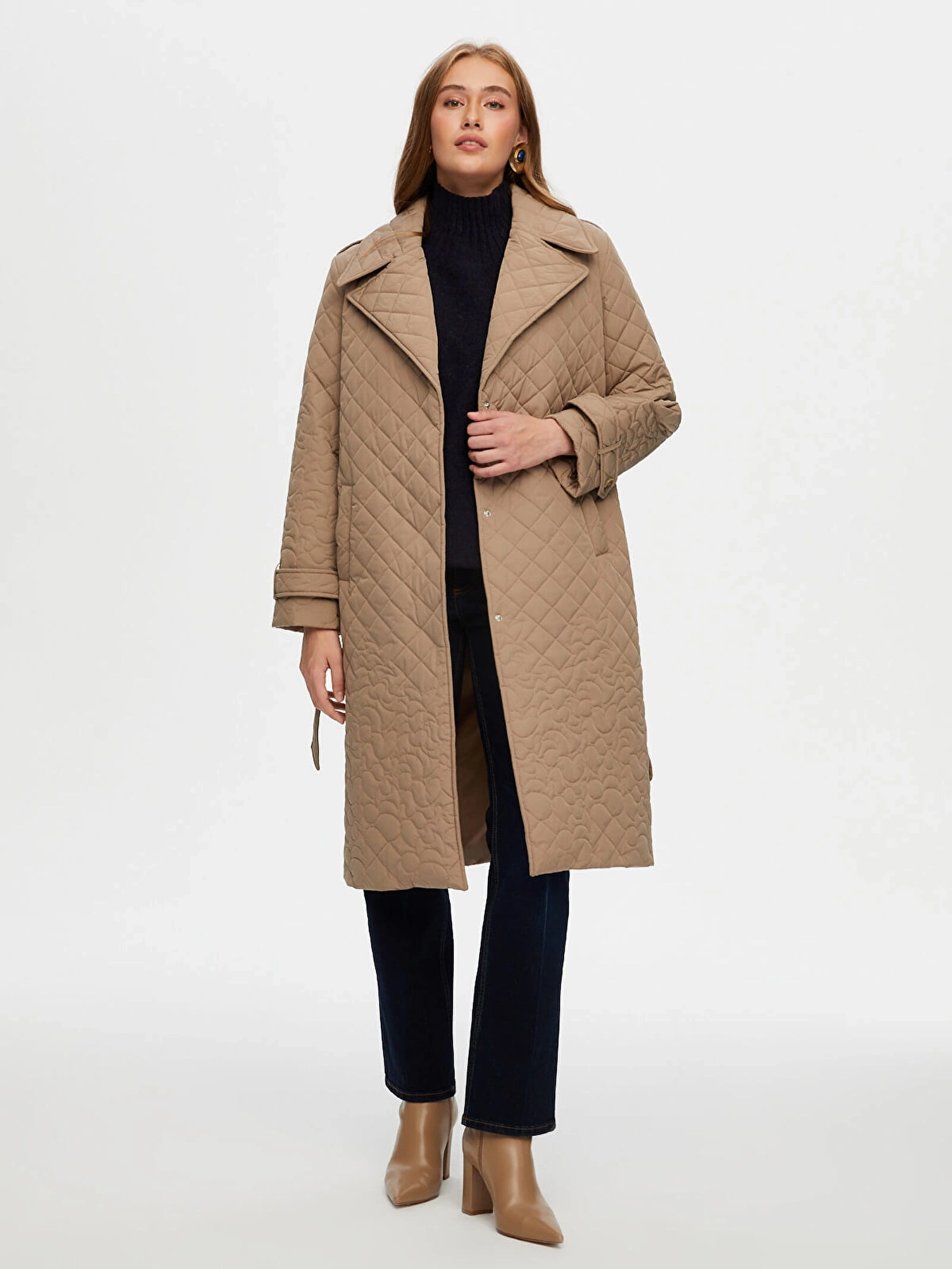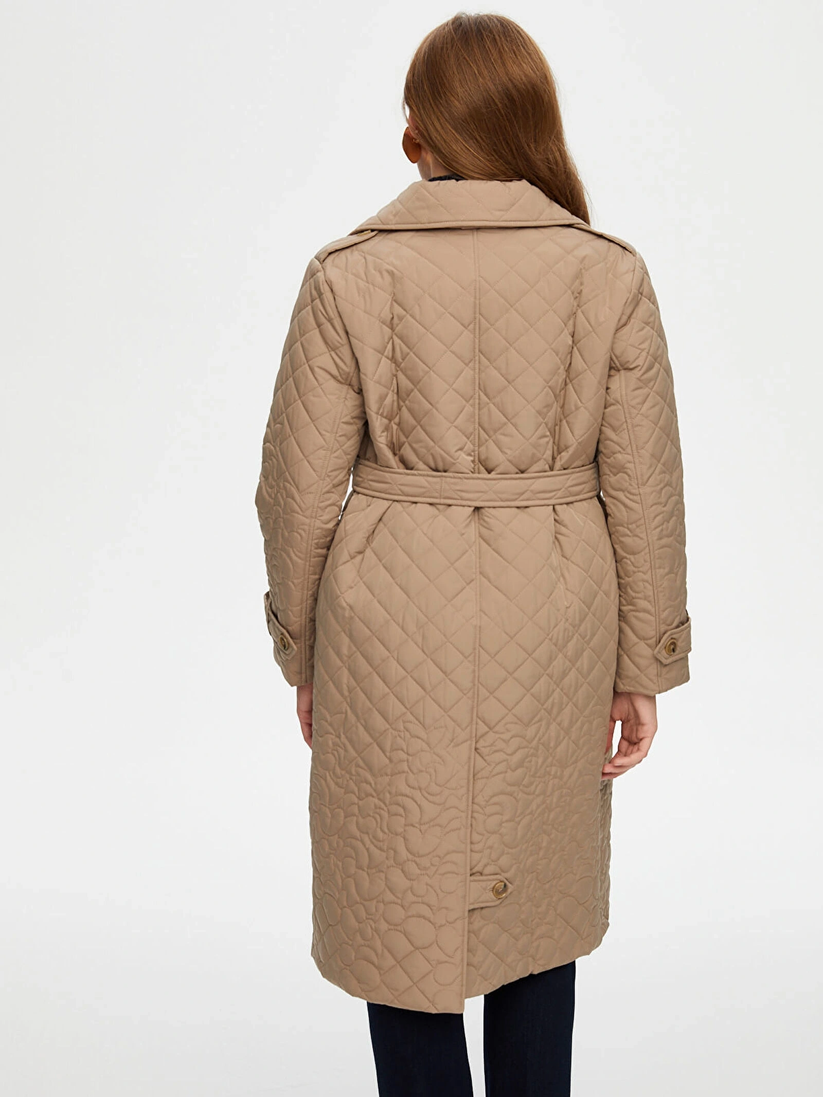 Faik Sönmez Kadın Çiçek ve Baklava Desen Uzun Kapitone Bej Kaban W26KKB008