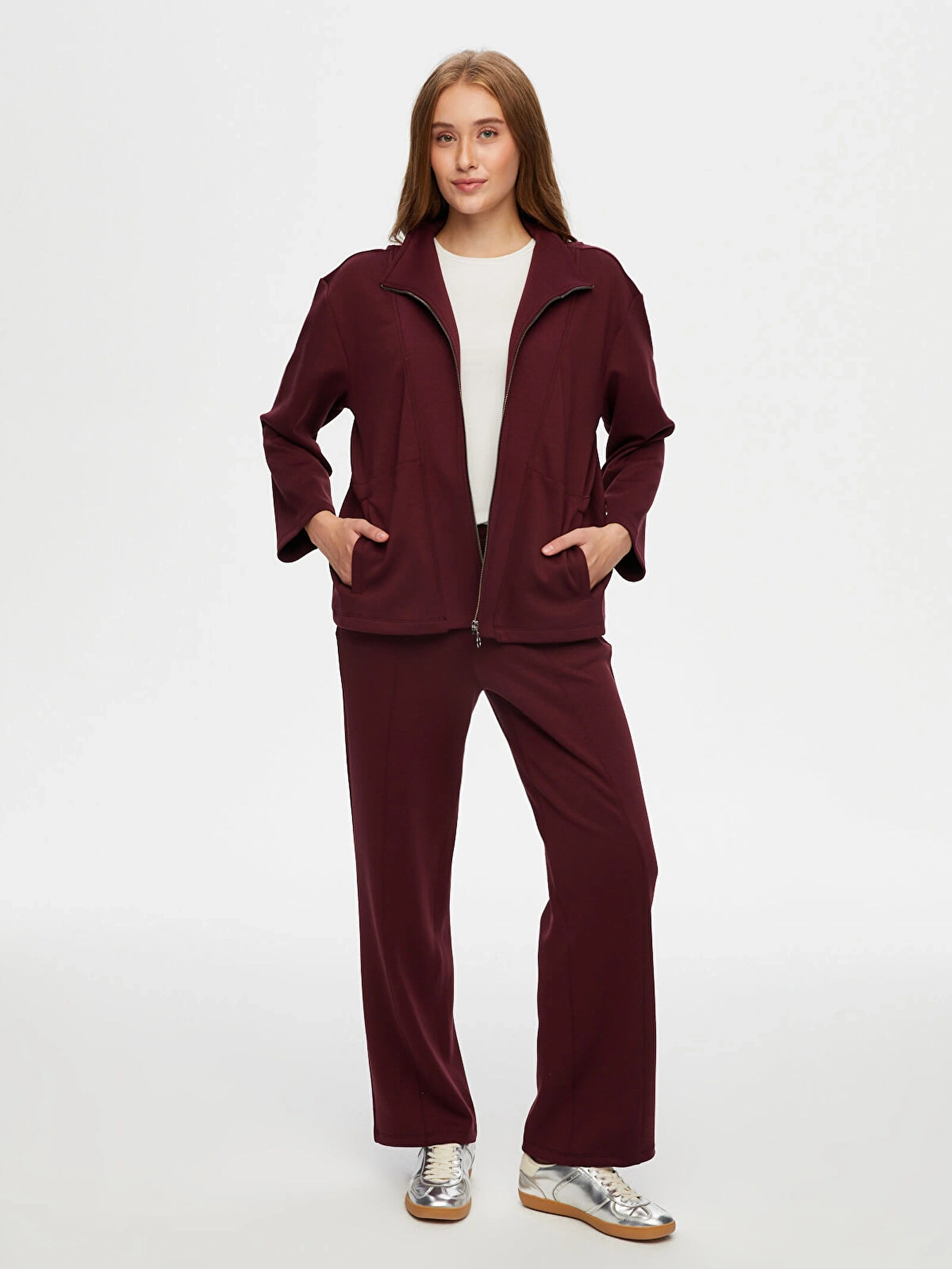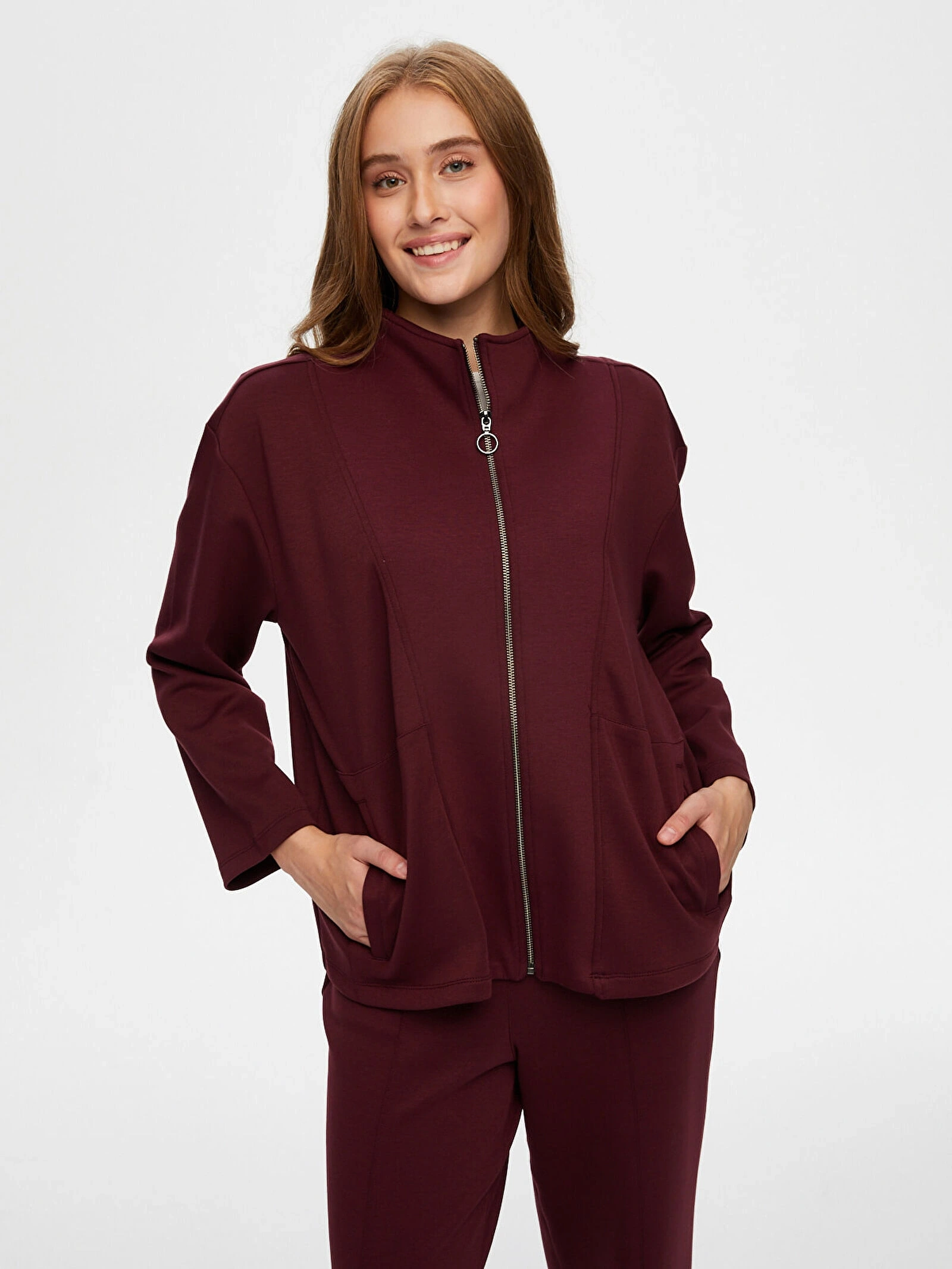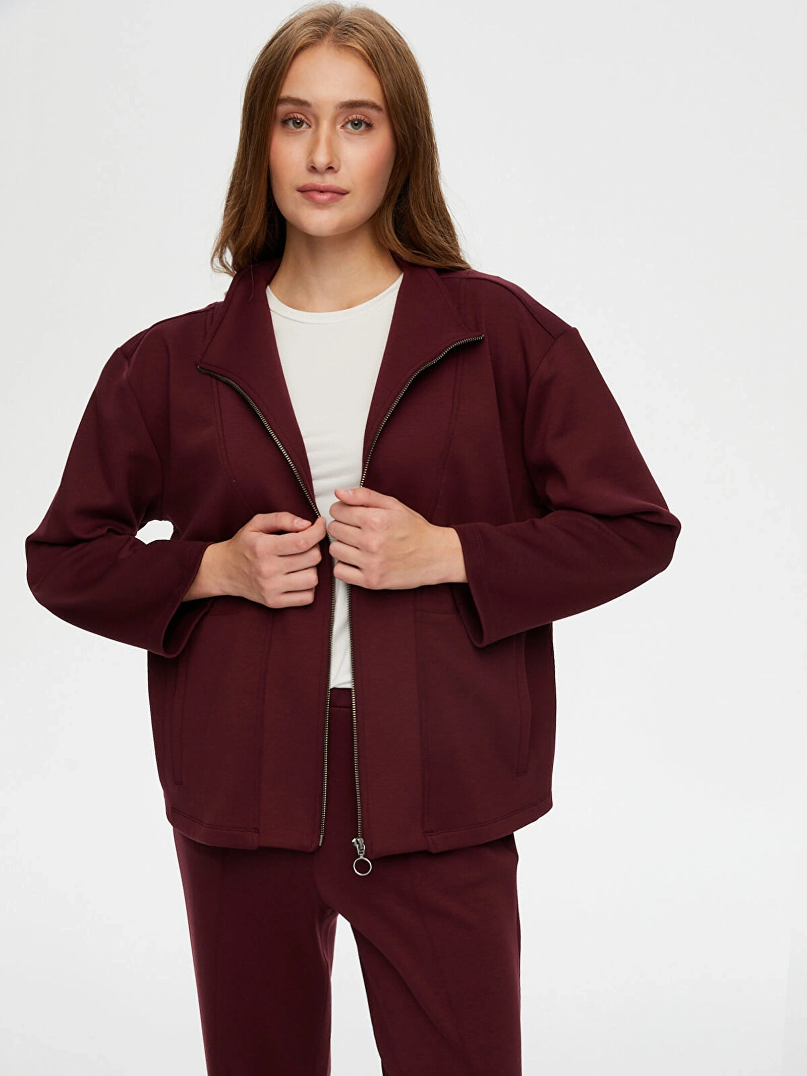 Faik Sönmez Kadın Dik Yaka Modallı Mürdüm Eşofman Üstü UW26ESU005, modern ve rahat tasarımıyla günlük stilinize konforlu bir şıklık kazandırır. Mürdüm rengin güçlü ve sofistike görünümü, spor ve casual kombinlerinize zarif bir dokunuş katar.