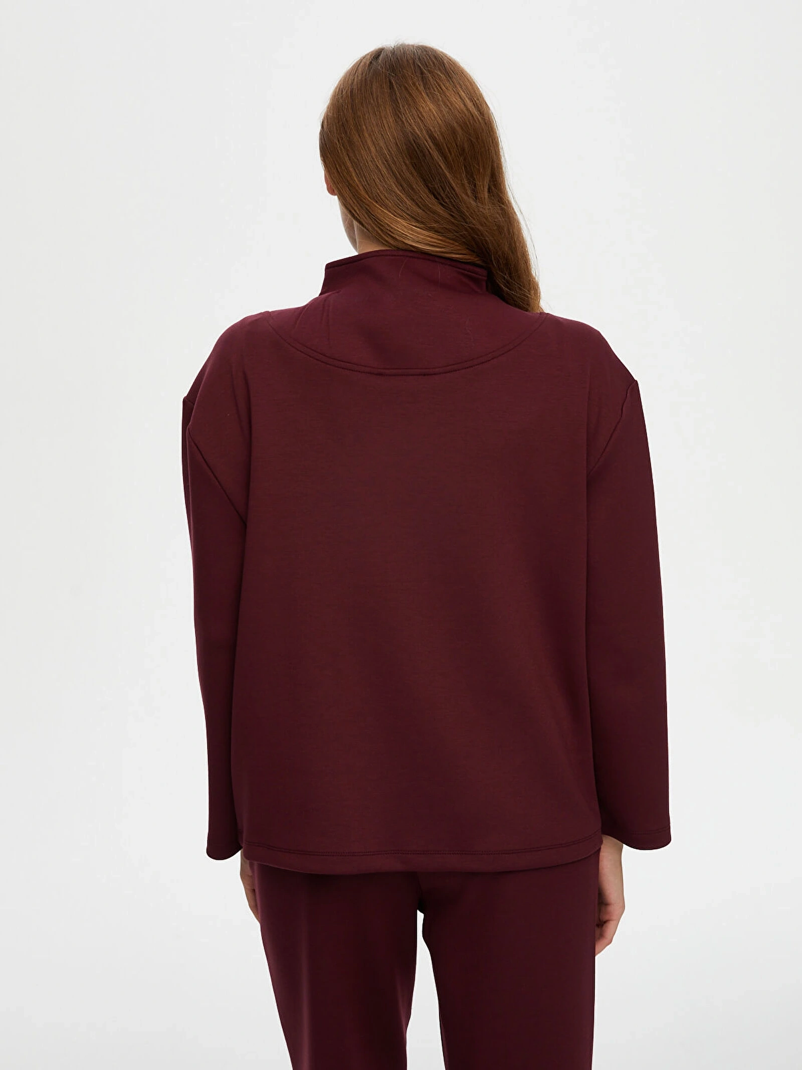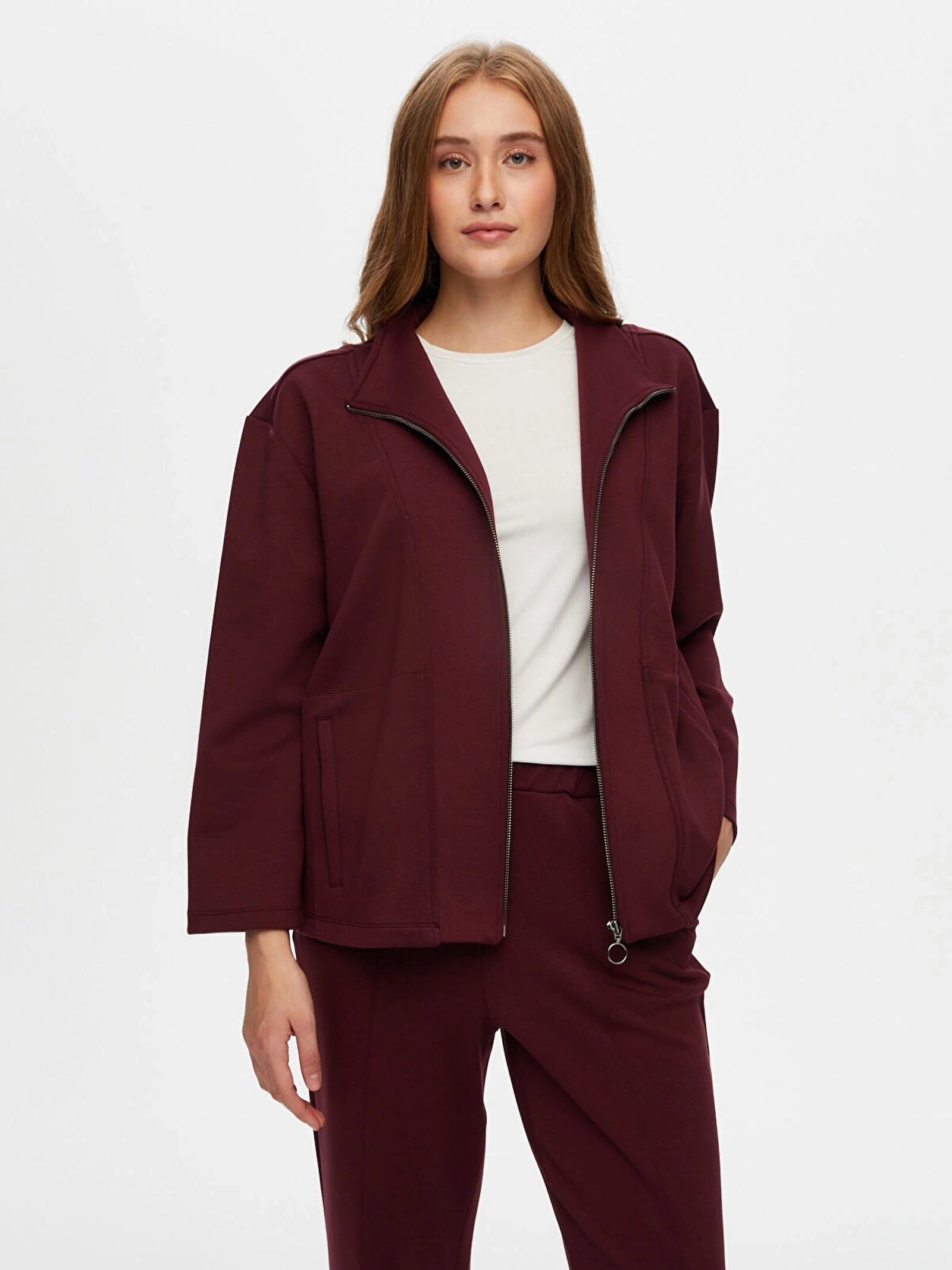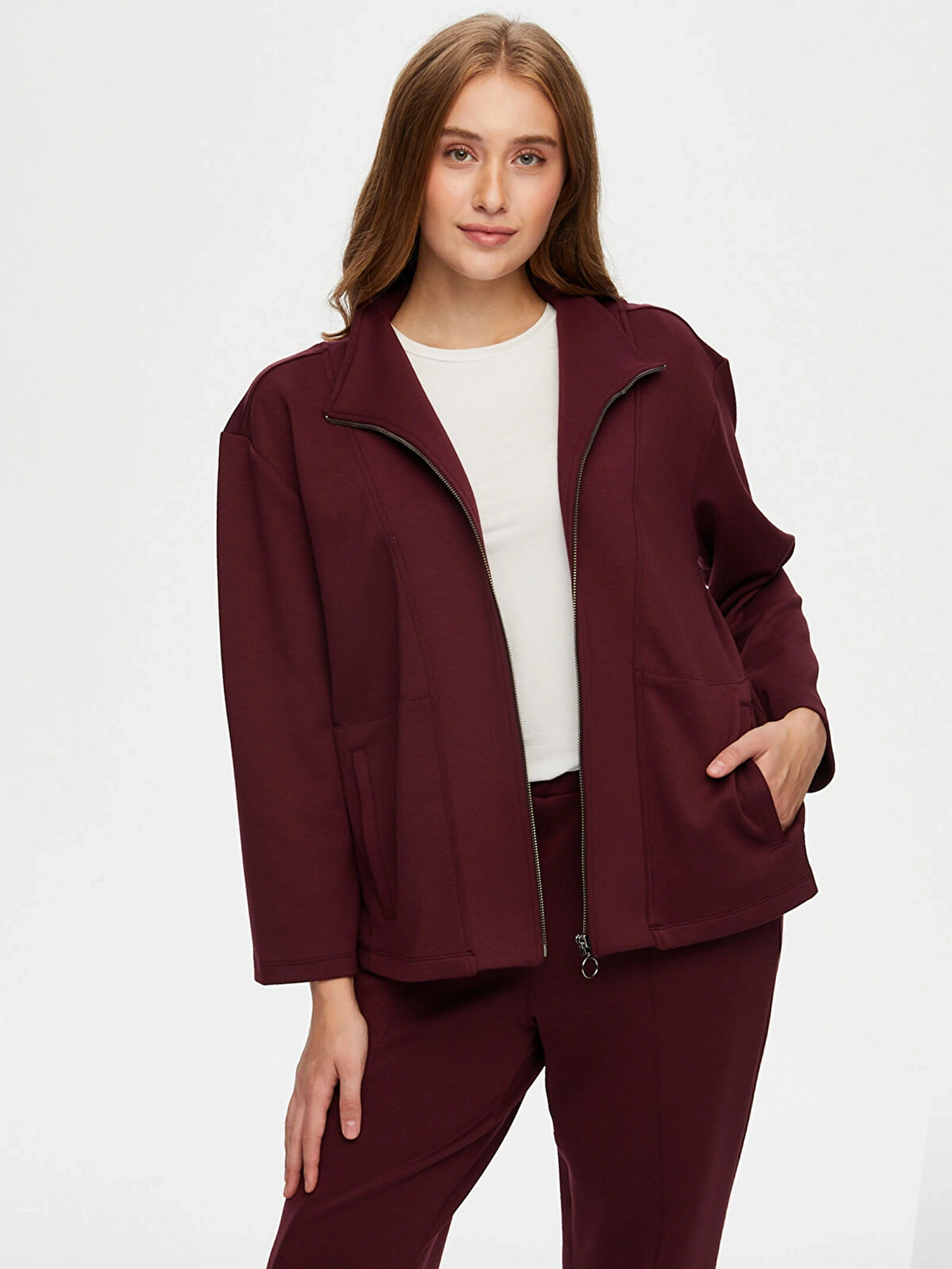 Faik Sönmez Kadın Dik Yaka Modallı Mürdüm Eşofman Üstü UW26ESU005, modern ve rahat tasarımıyla günlük stilinize konforlu bir şıklık kazandırır. Mürdüm rengin güçlü ve sofistike görünümü, spor ve casual kombinlerinize zarif bir dokunuş katar.