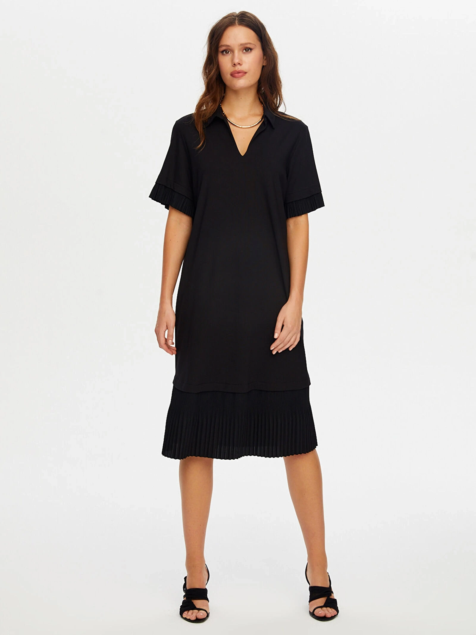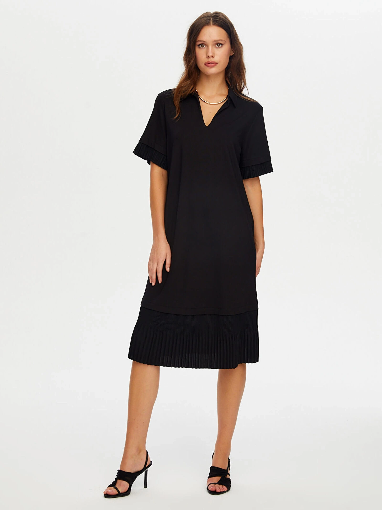 Faik Sönmez Kadın Eteği Piliseli Kısa Kol Örme Siyah Elbise UW26ELB022, zarif kesimi ve hareketli formuyla stilinize modern bir şıklık kazandırır. Eteği piliseli kısa kol örme tasarımı, elbiseye akıcı bir görünüm katarken siyah rengi ile zamansız ve elegan bir stil sunar.