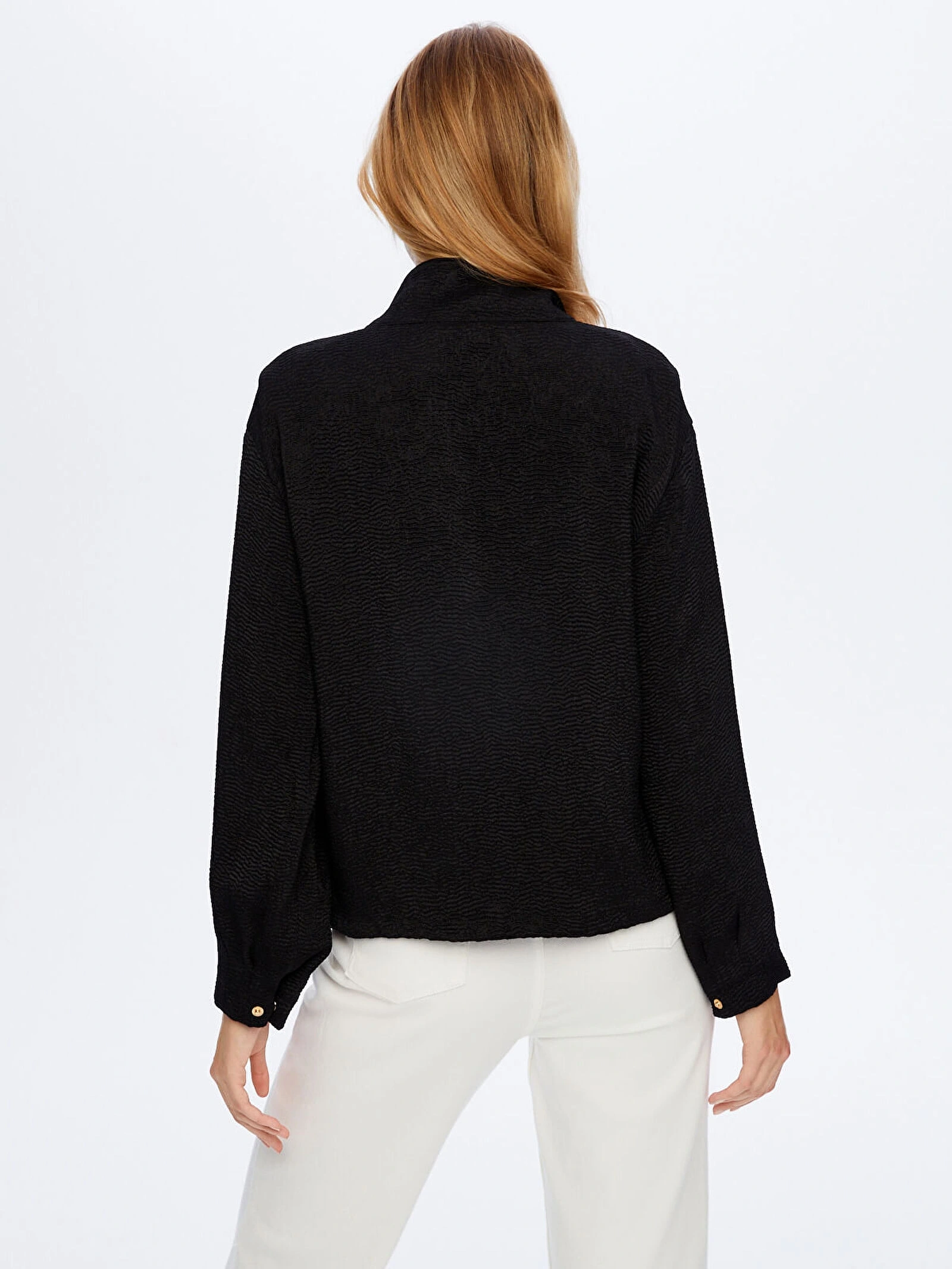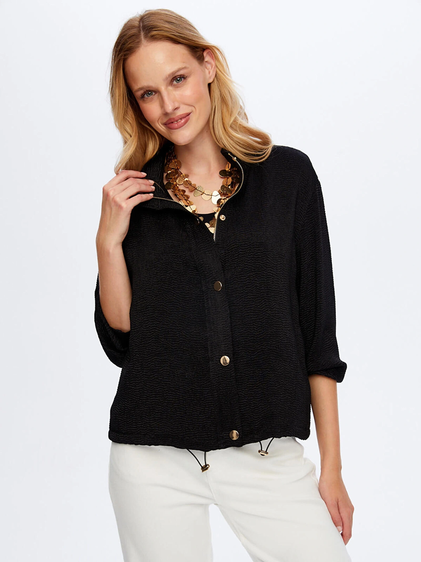 Faik Sönmez Kadın Gold Çıtçıt Detaylı Kendinden Dokulu Saten Siyah Bomber Ceket UW26BMB002, modern ve şık tasarımıyla stilinize iddialı bir dokunuş kazandırır. Gold çıtçıt detayları ve kendinden dokulu saten yüzeyi, cekete zarif bir ışıltı ve sofistike bir karakter kazandırırken siyah rengi ile zamansız bir şıklık sunar.