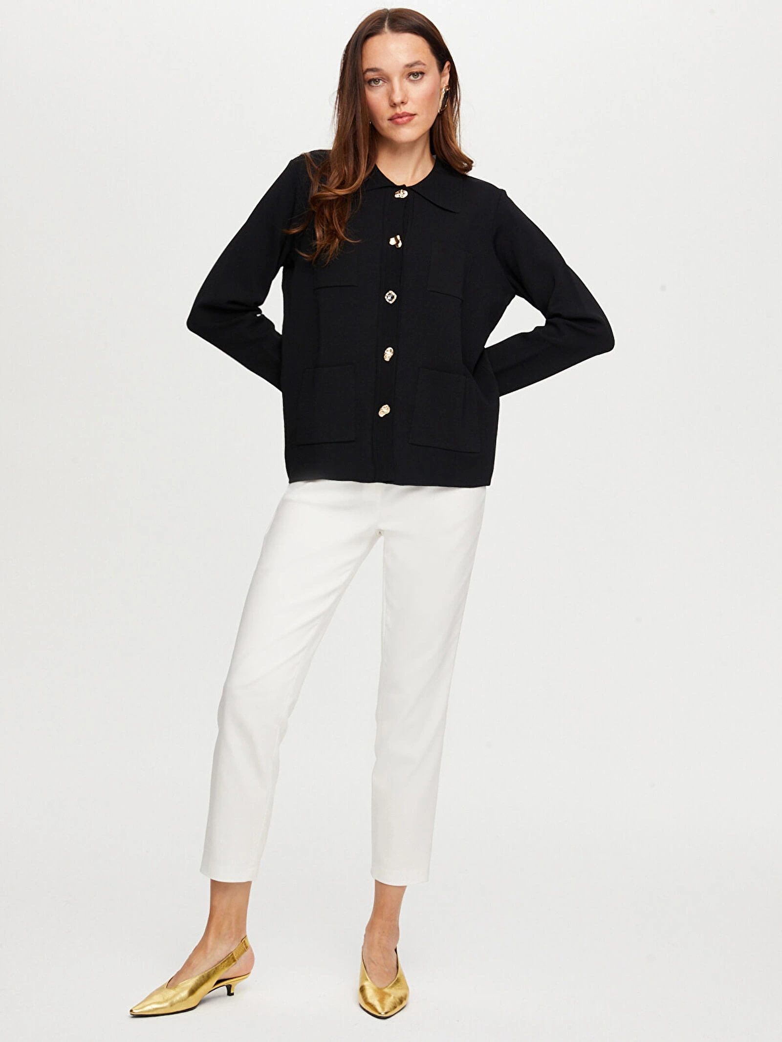 Gold düğme detayları ile şık ve zarif görünüm