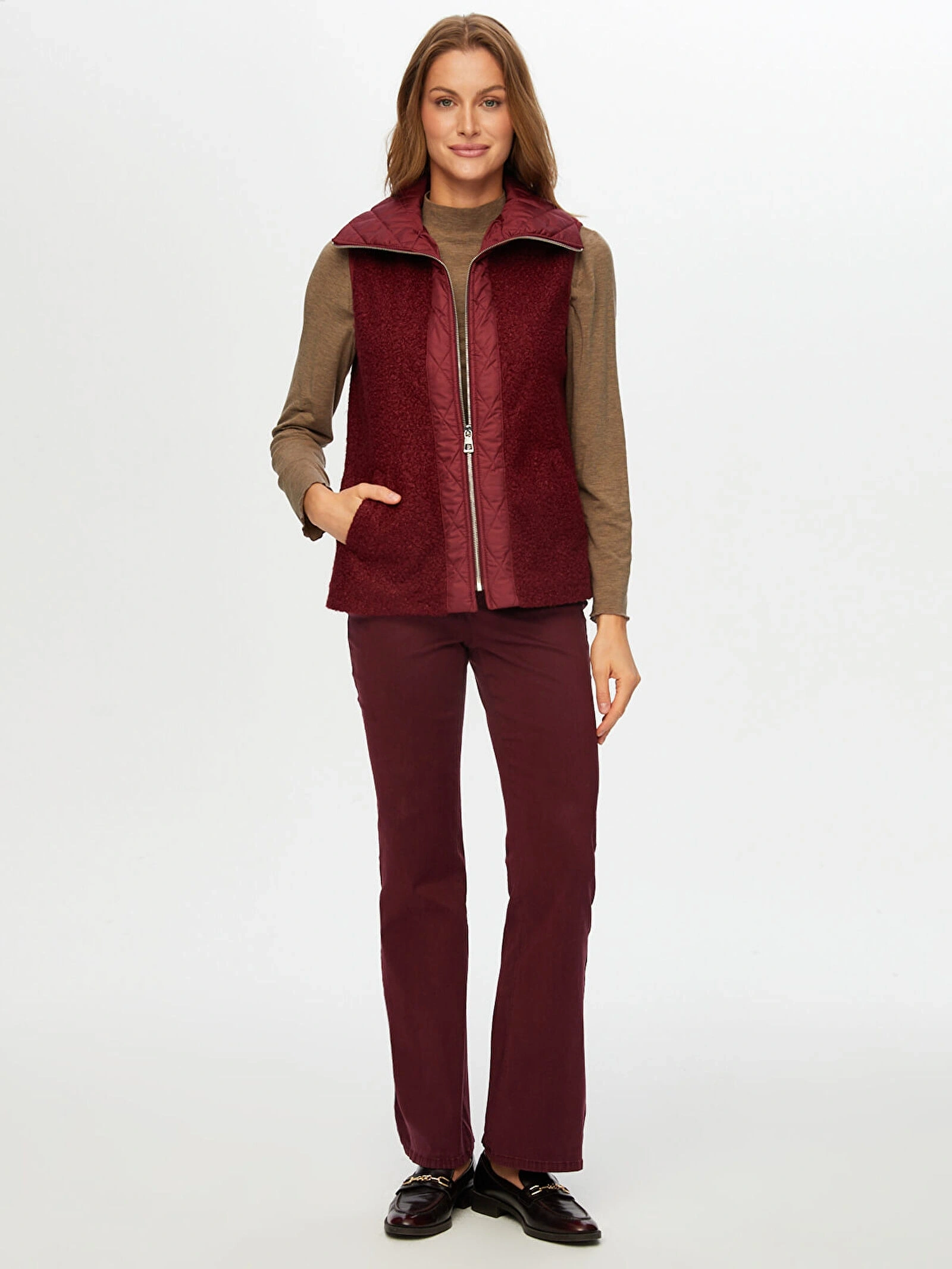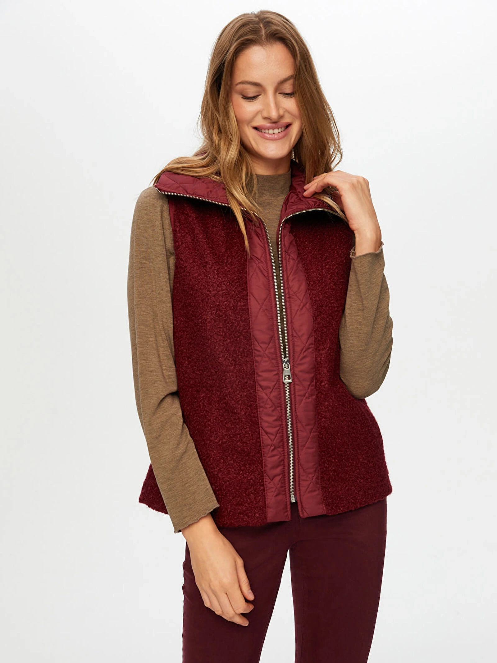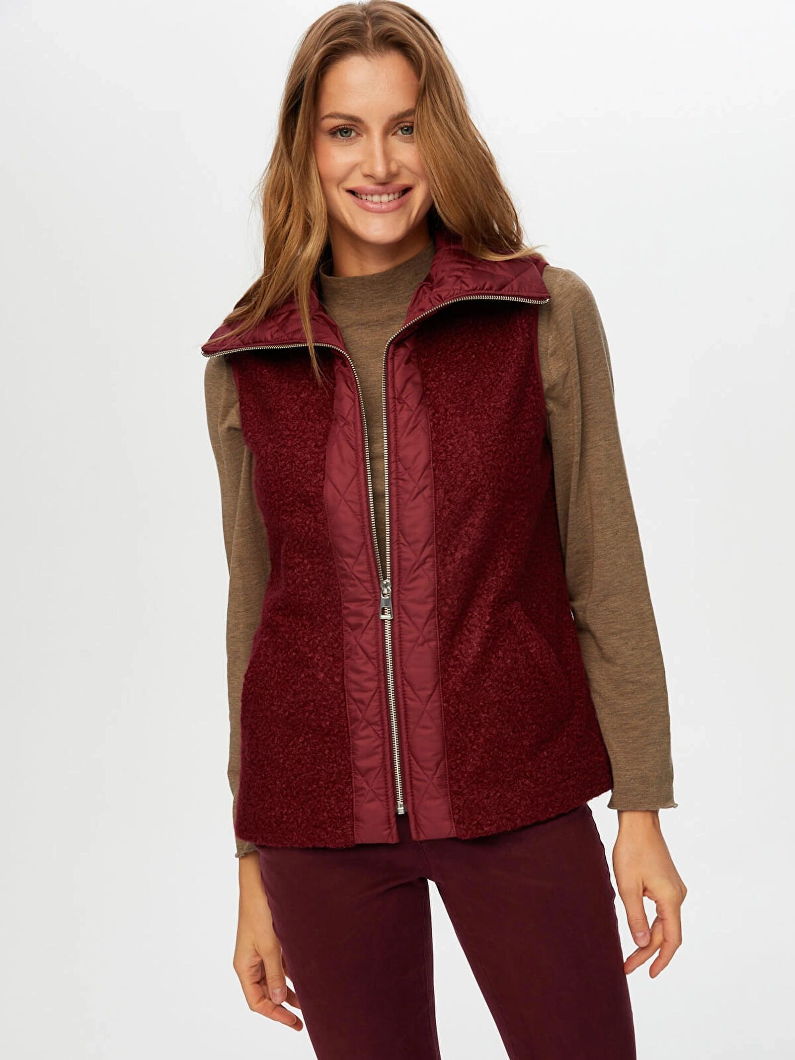 Faik Sönmez Kadın Kapitone Garnili Bürümcük Mürdüm Yelek UW26KYL005, özgün dokusu ve modern tasarımıyla stilinize dinamik bir dokunuş kazandırır. Kapitone garnili bürümcük formu, farklı doku geçişleriyle dikkat çekerken mürdüm rengi ile şık ve zarif bir görünüm sunar.