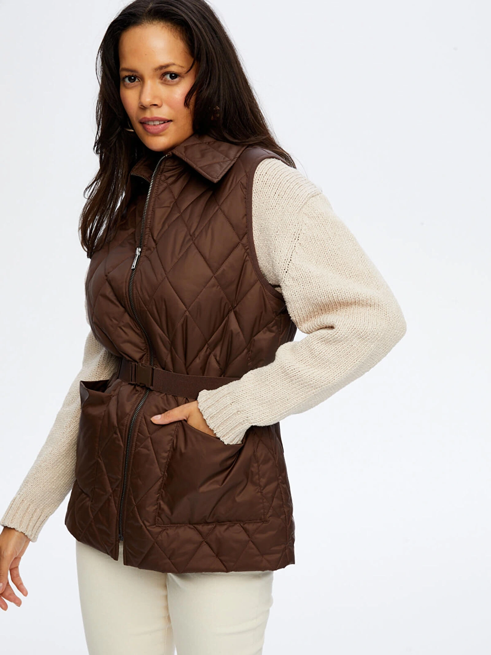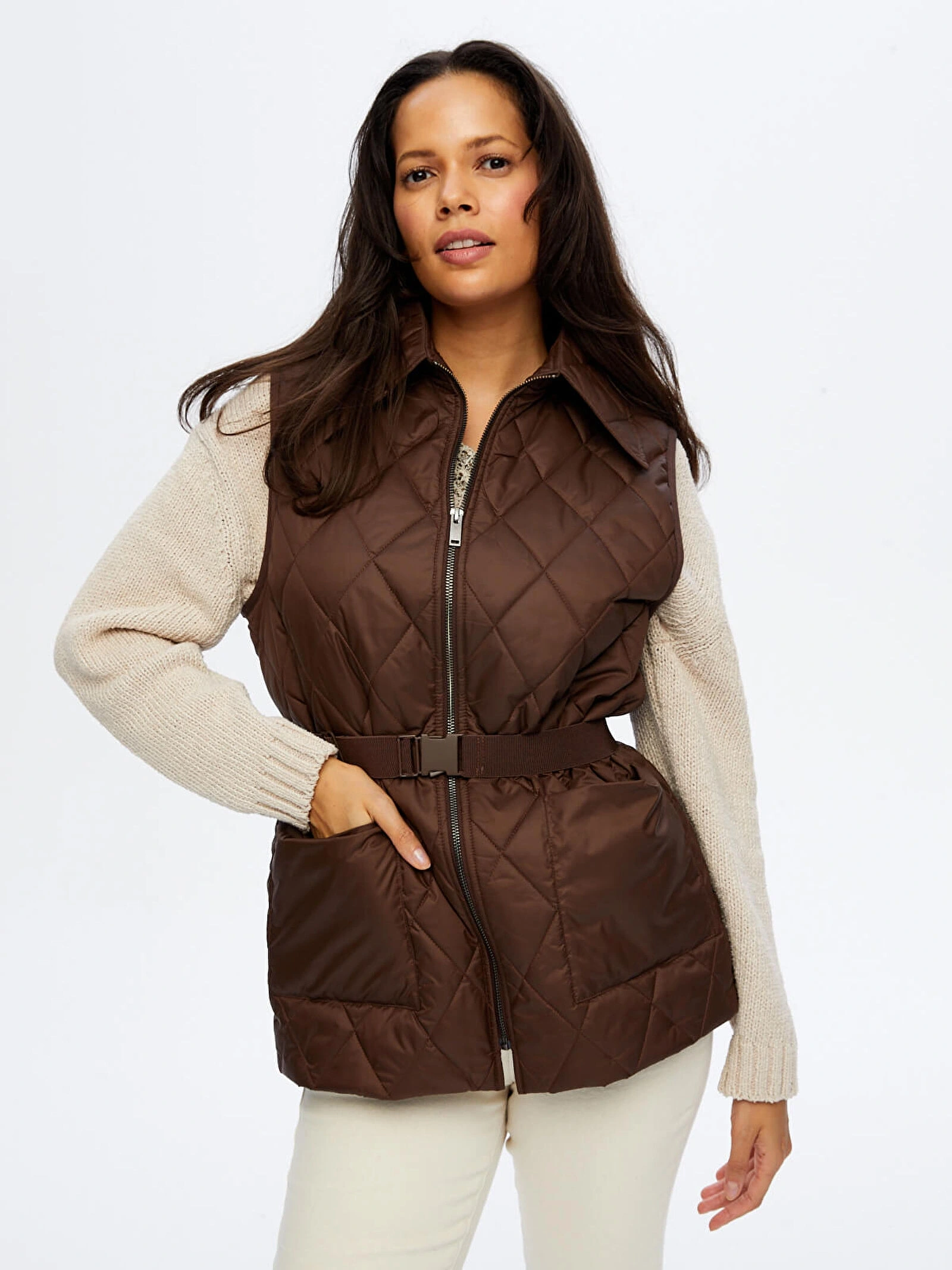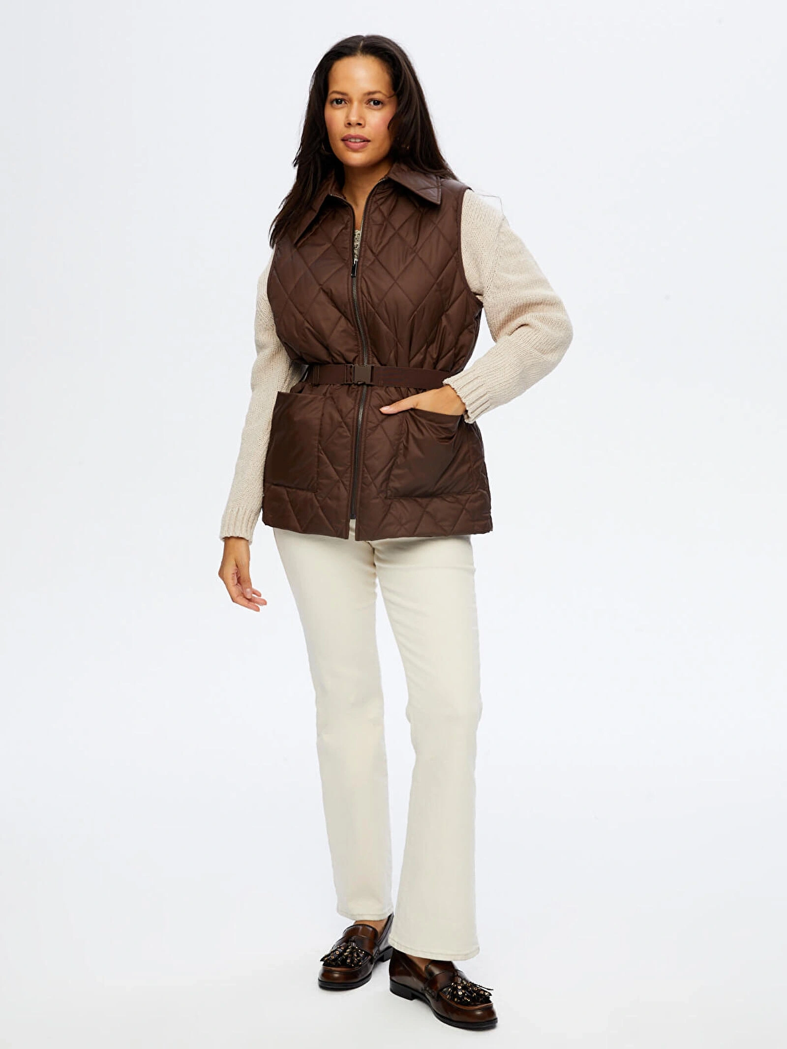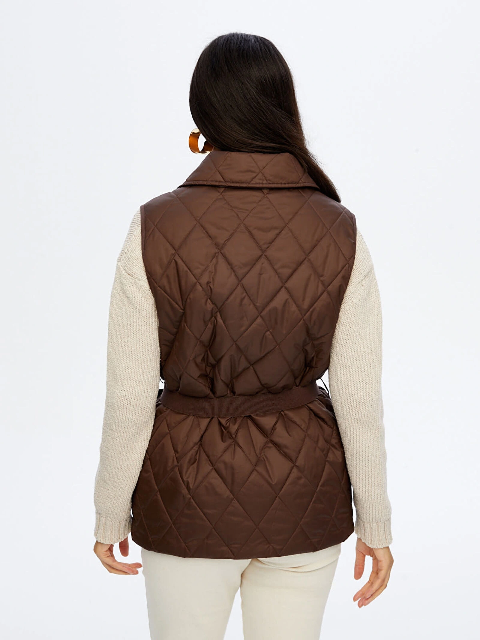Beli kemer detaylı uzun kapitone yelek tasarımı