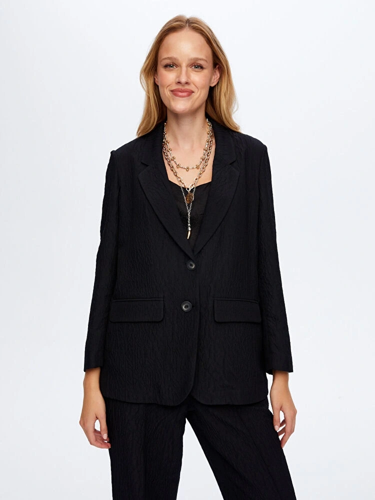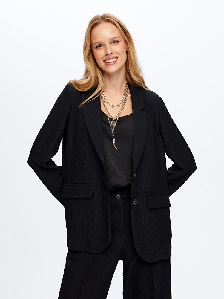 Bu ceket, kendinden dokulu ve astarsız tasarımı ile modern ve rahat bir stil sunar. Polyester, viskon ve elastan karışımı sayesinde esnek, hafif ve konforlu bir kullanım sağlar.