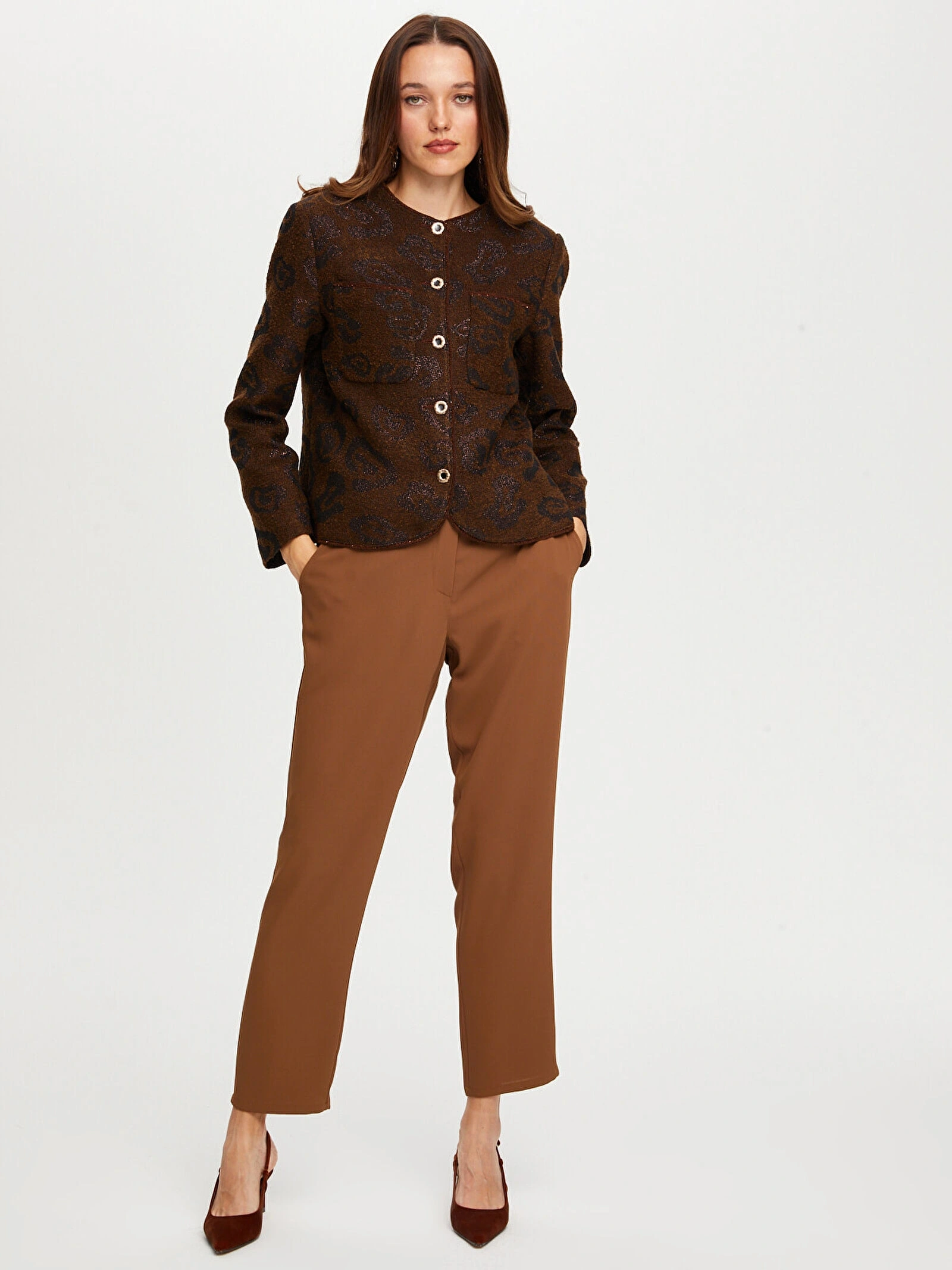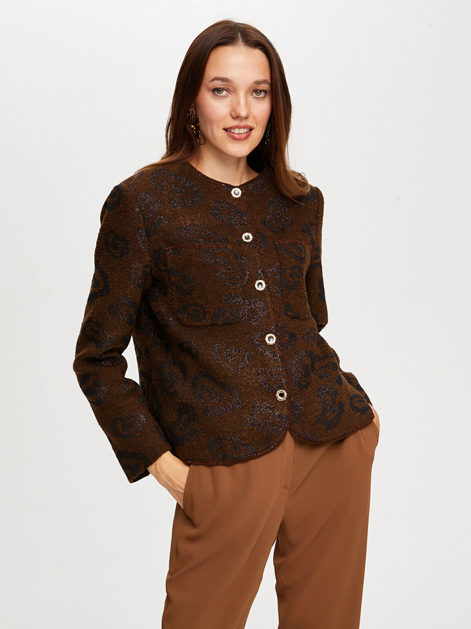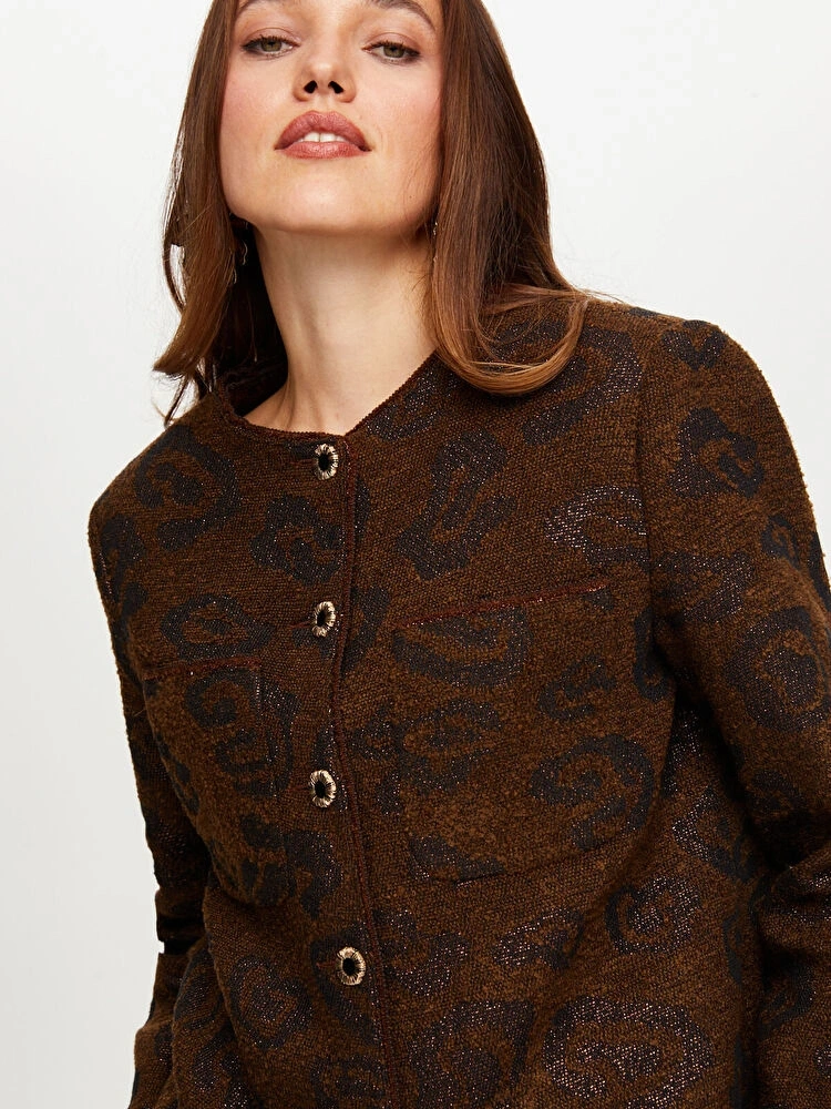 Bu kendinden jakarlı simli kahverengi ceket, şıklığı ve konforu bir arada sunarak kombinlerinize modern bir dokunuş katar.