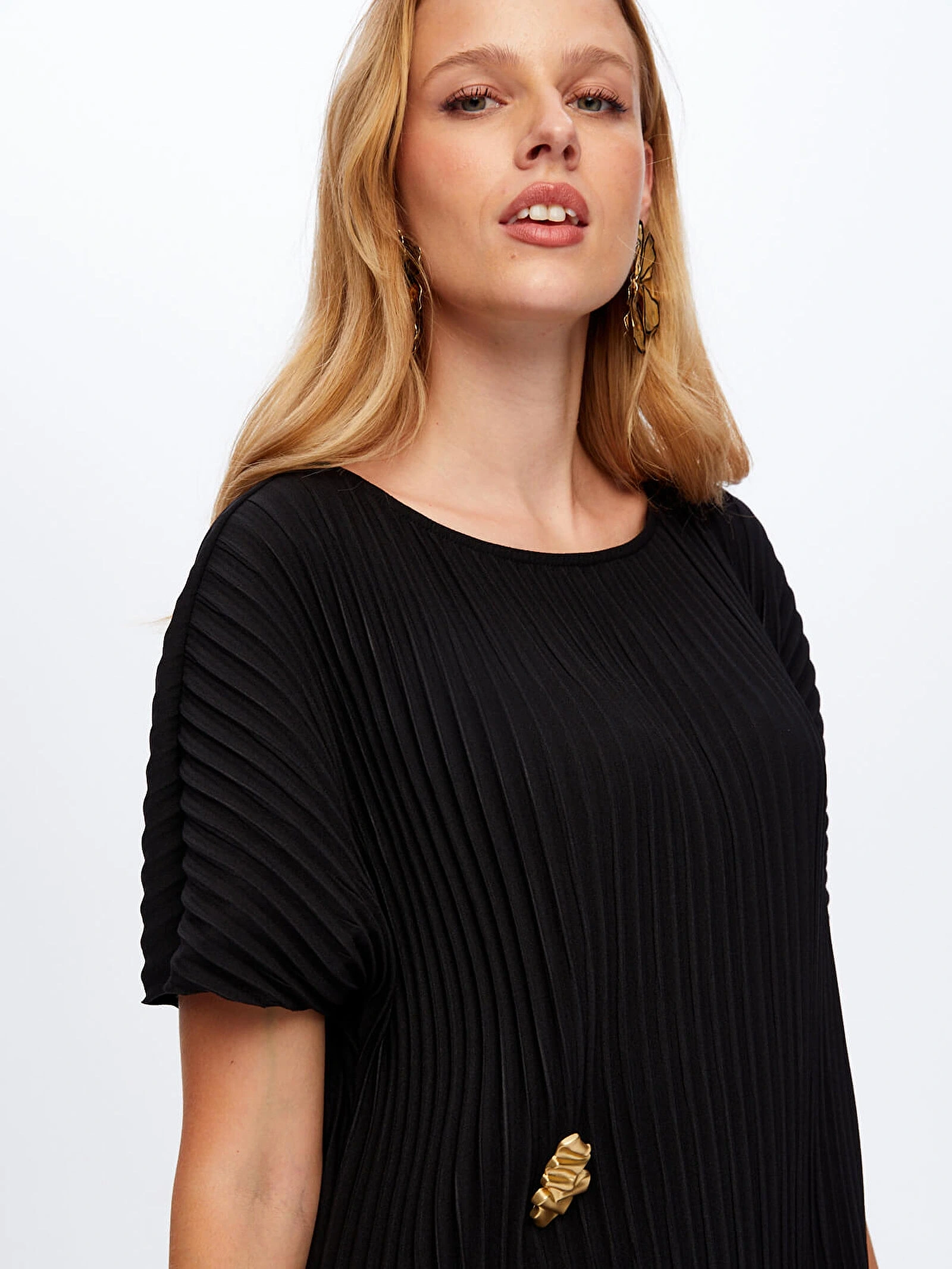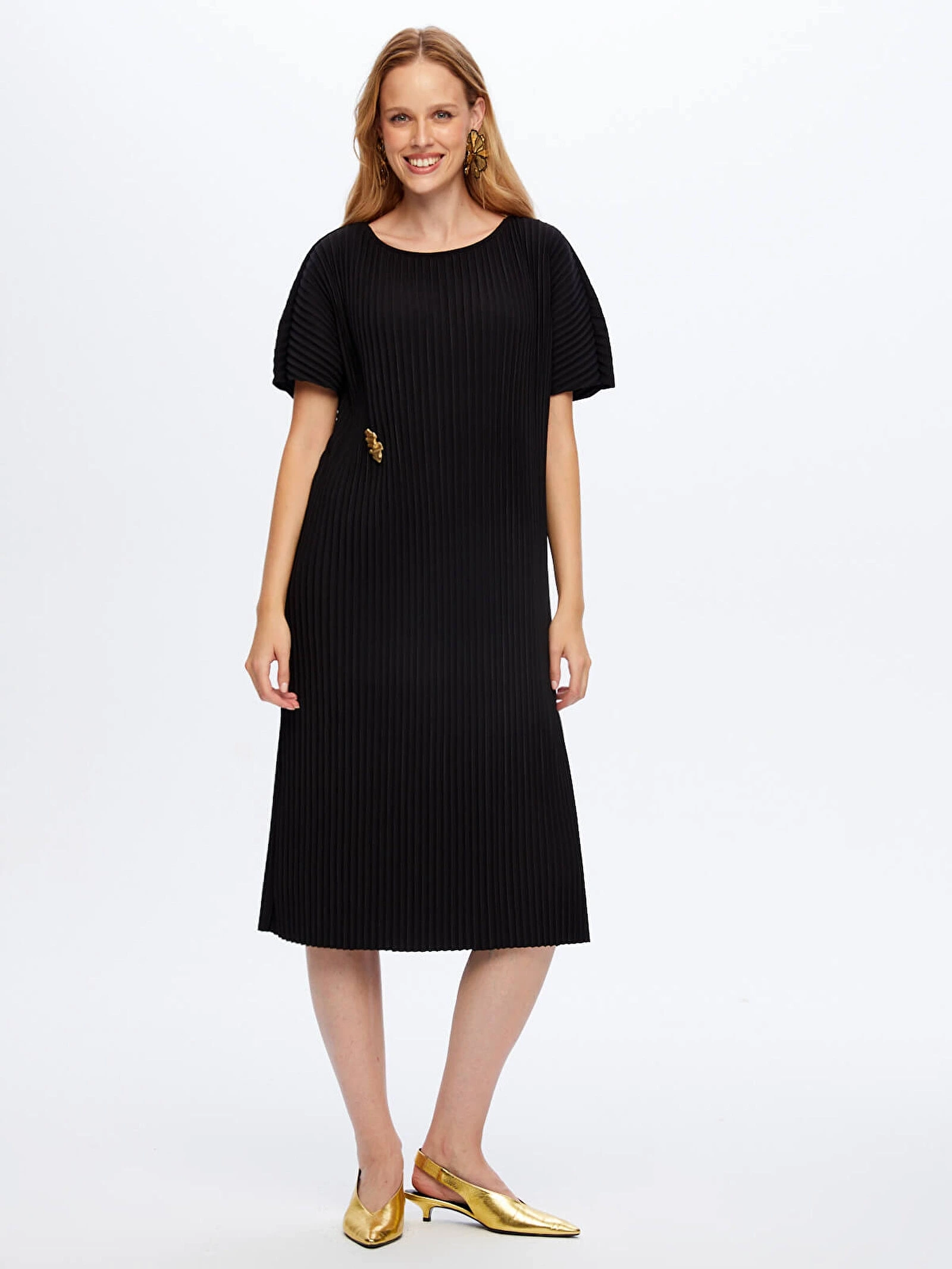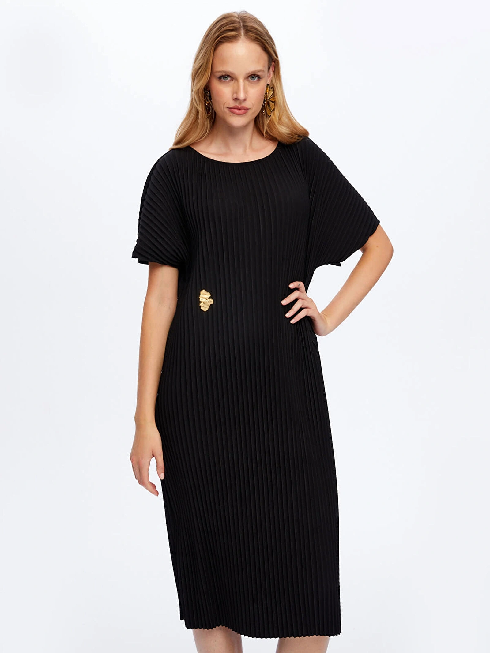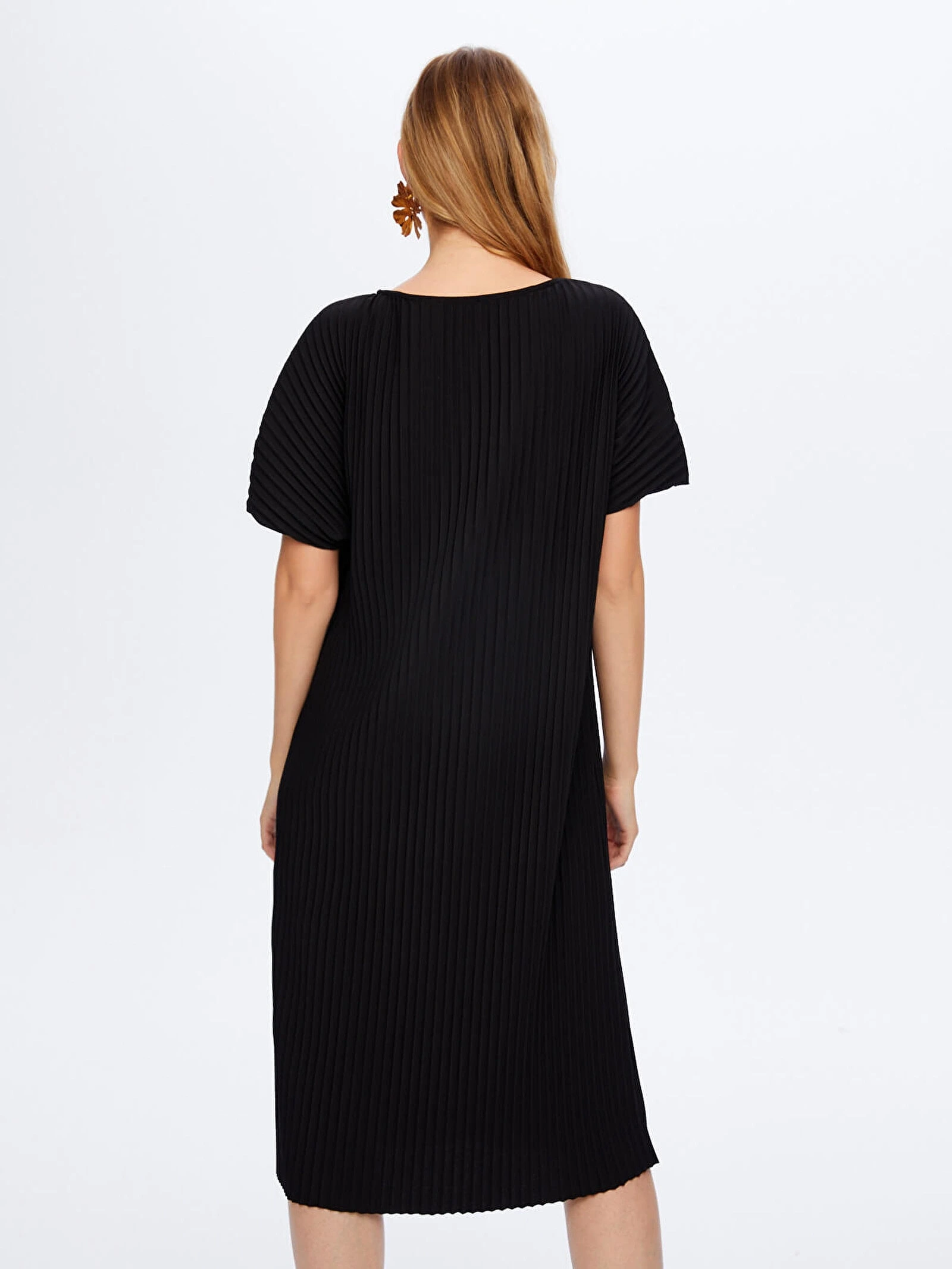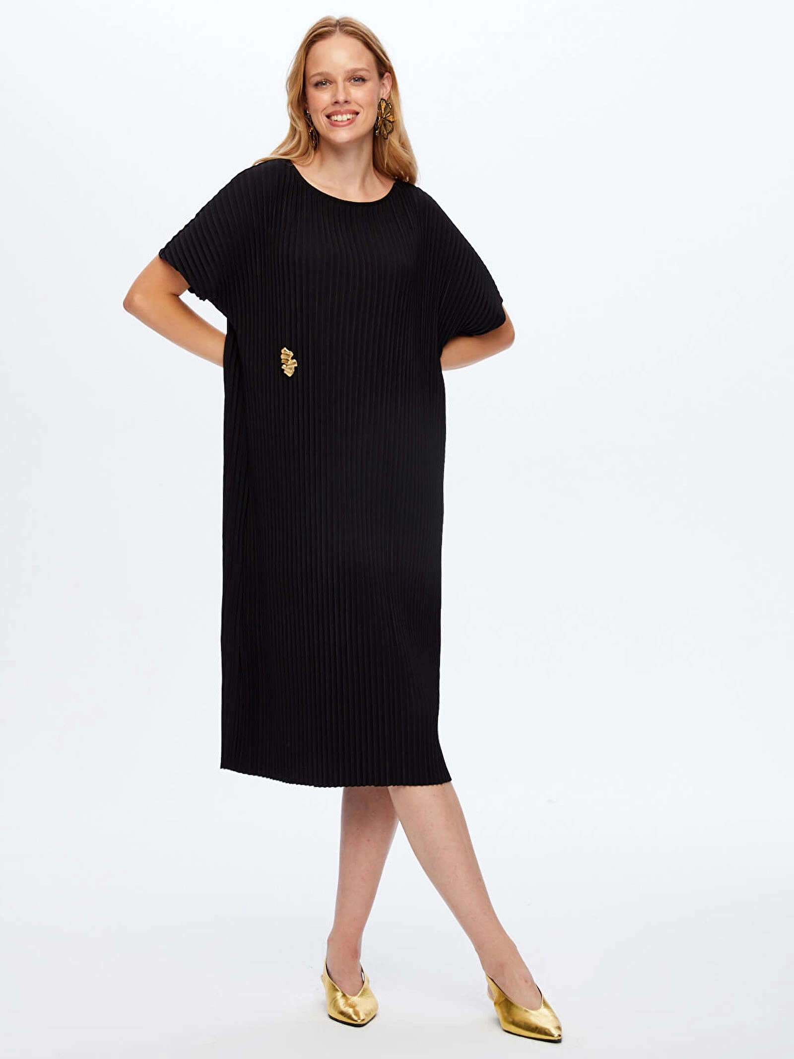 Faik Sönmez Kadın Kendinden Piliseli Örme Siyah Torba Elbise UW26ELB025, modern kesimi ve zarif dokusuyla stilinize sofistike bir dokunuş kazandırır. Kendinden piliseli örme torba formu, rahat bir siluet sunarken siyah rengi ile zamansız ve şık bir görünüm oluşturur.