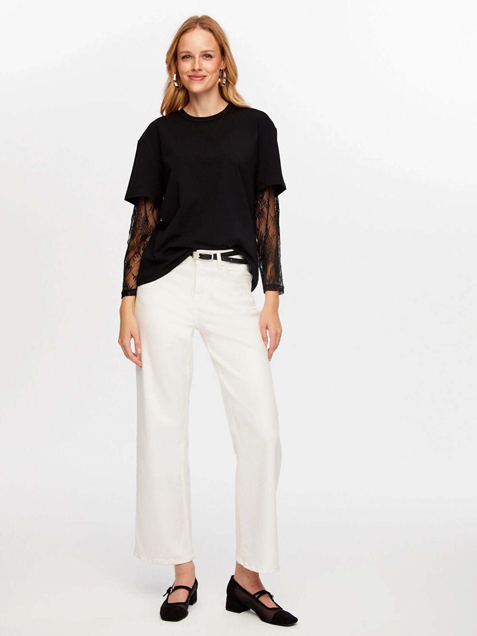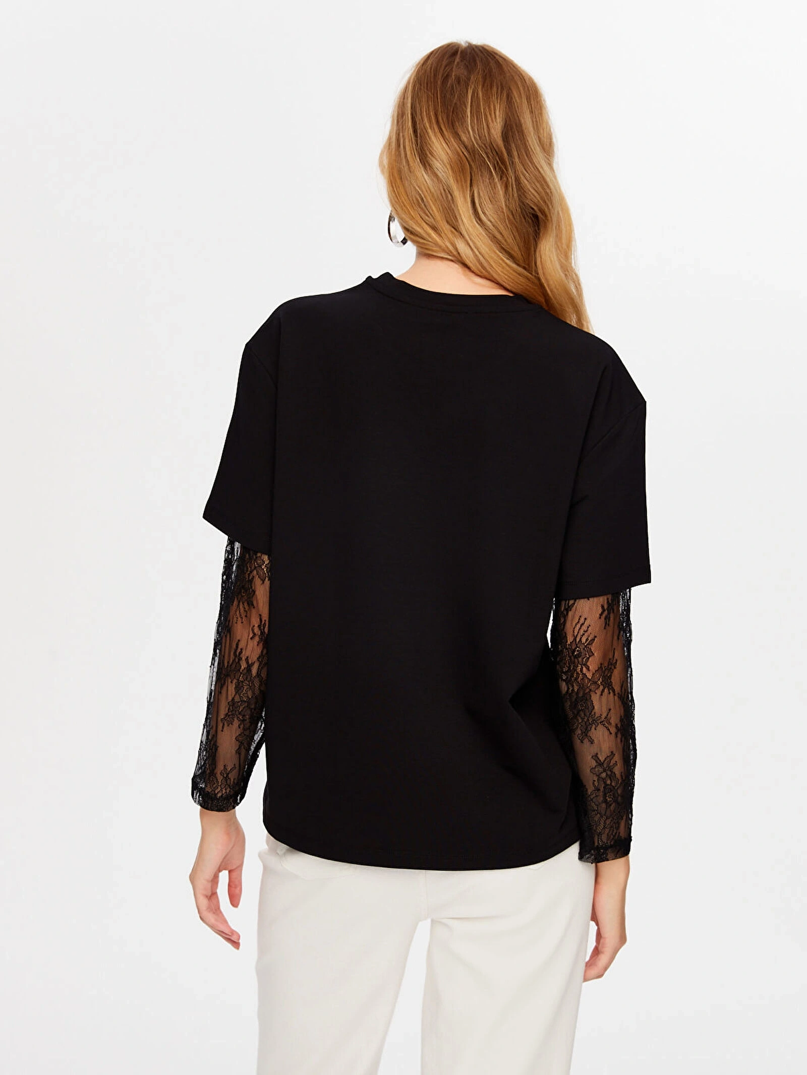 Bu kolları dantel garnili yuvarlak yaka t-shirt, günlük kombinlerinizde zarif ve rahat bir alternatif sunar.
