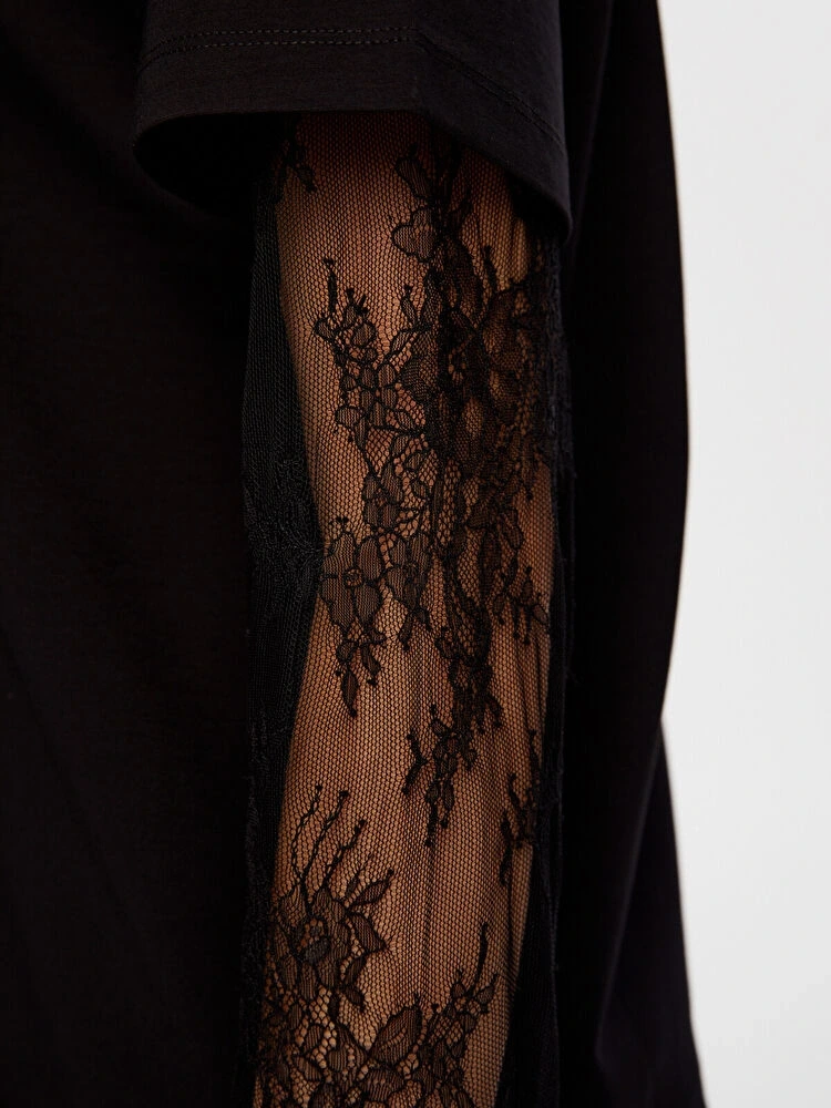 Faik Sönmez Kadın Kolları Dantel Garnili Yuvarlak Yaka Siyah T-Shirt W26TSH071