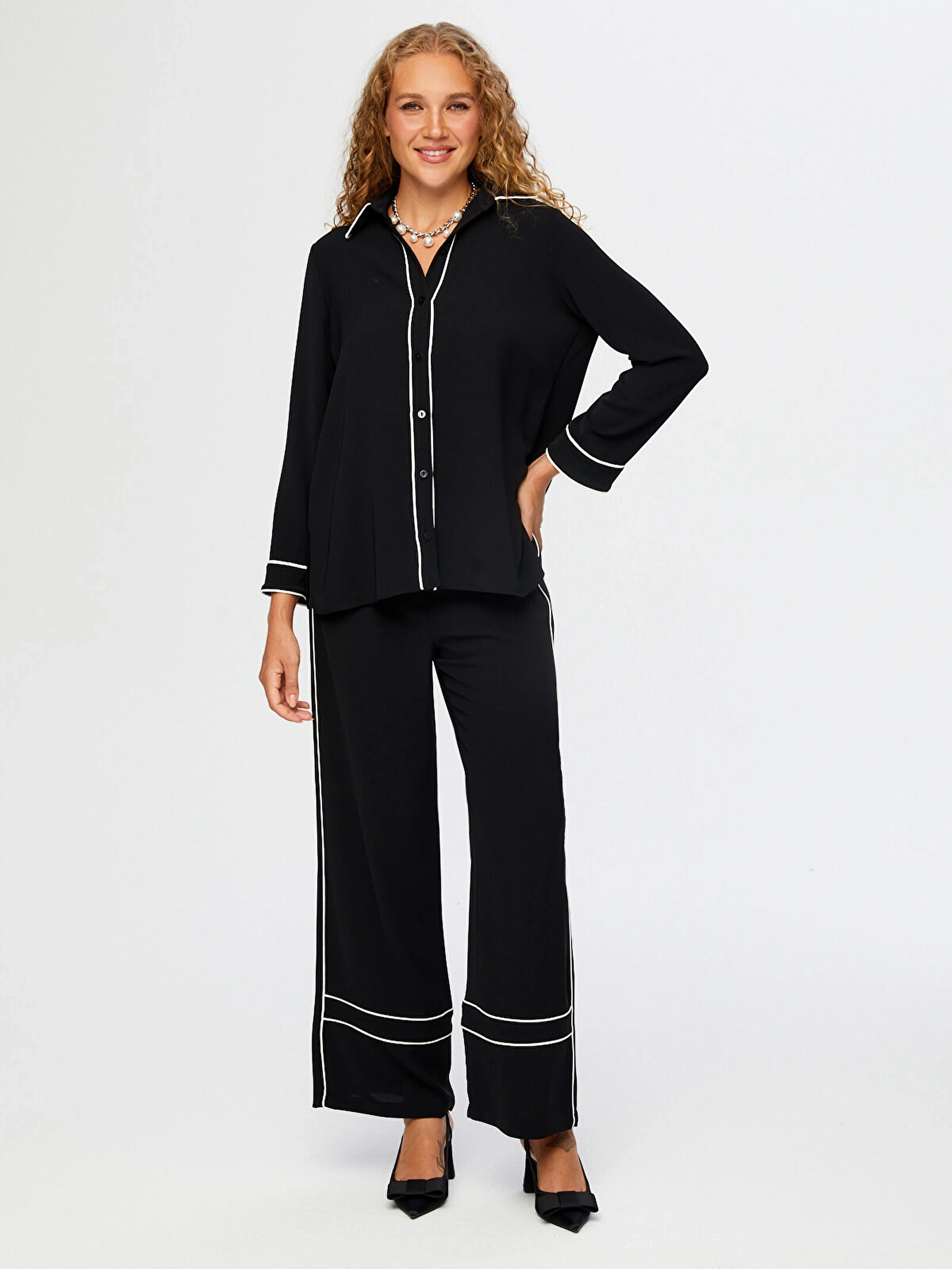 Faik Sönmez Kadın Kontrast Biye Detaylı Uzun Kol Siyah Tunik, zarif ve modern tasarımı ile günlük şıklığınızı tamamlayan özel bir parçadır. Kontrast biye detayları ile hareket kazanan tasarım, siyah rengin zamansız şıklığı ile birleşerek güçlü ve stil sahibi bir görünüm sunar. Uzun kollu yapısı sayesinde gün boyu konforlu kullanım sağlar.