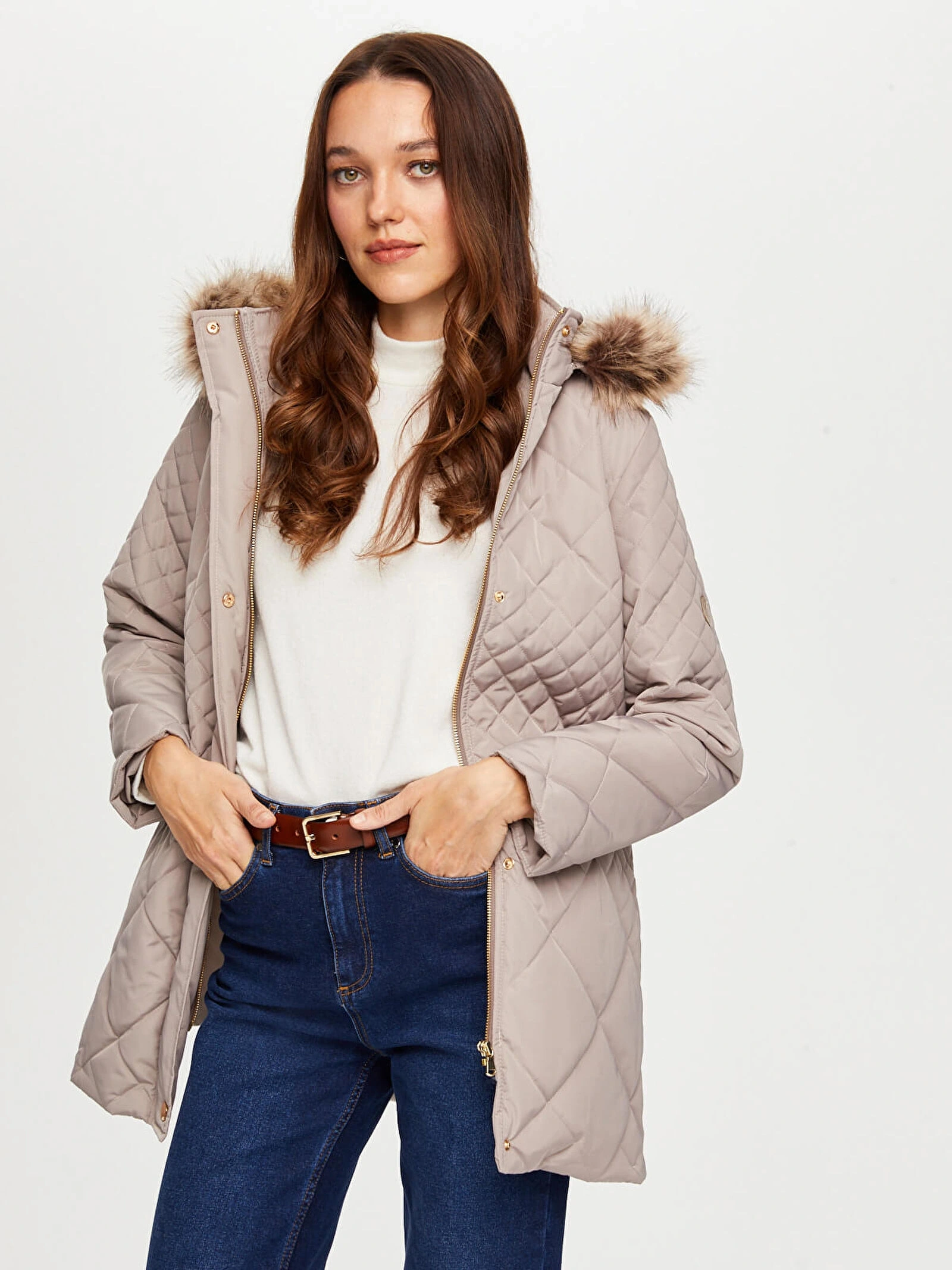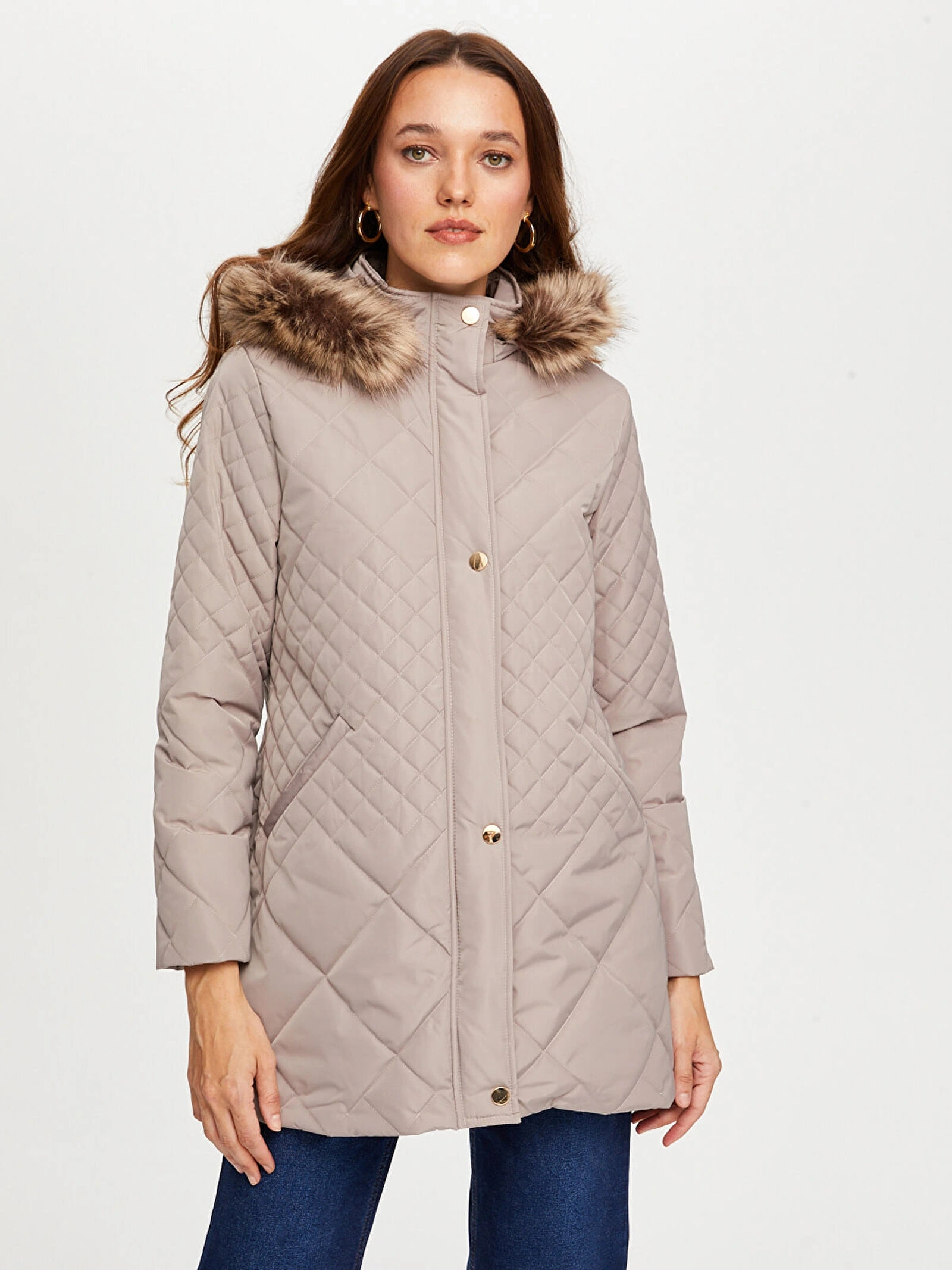 Faik Sönmez Kadın Kürk Kapüşonlu Kapitone Bej Kaban B00041