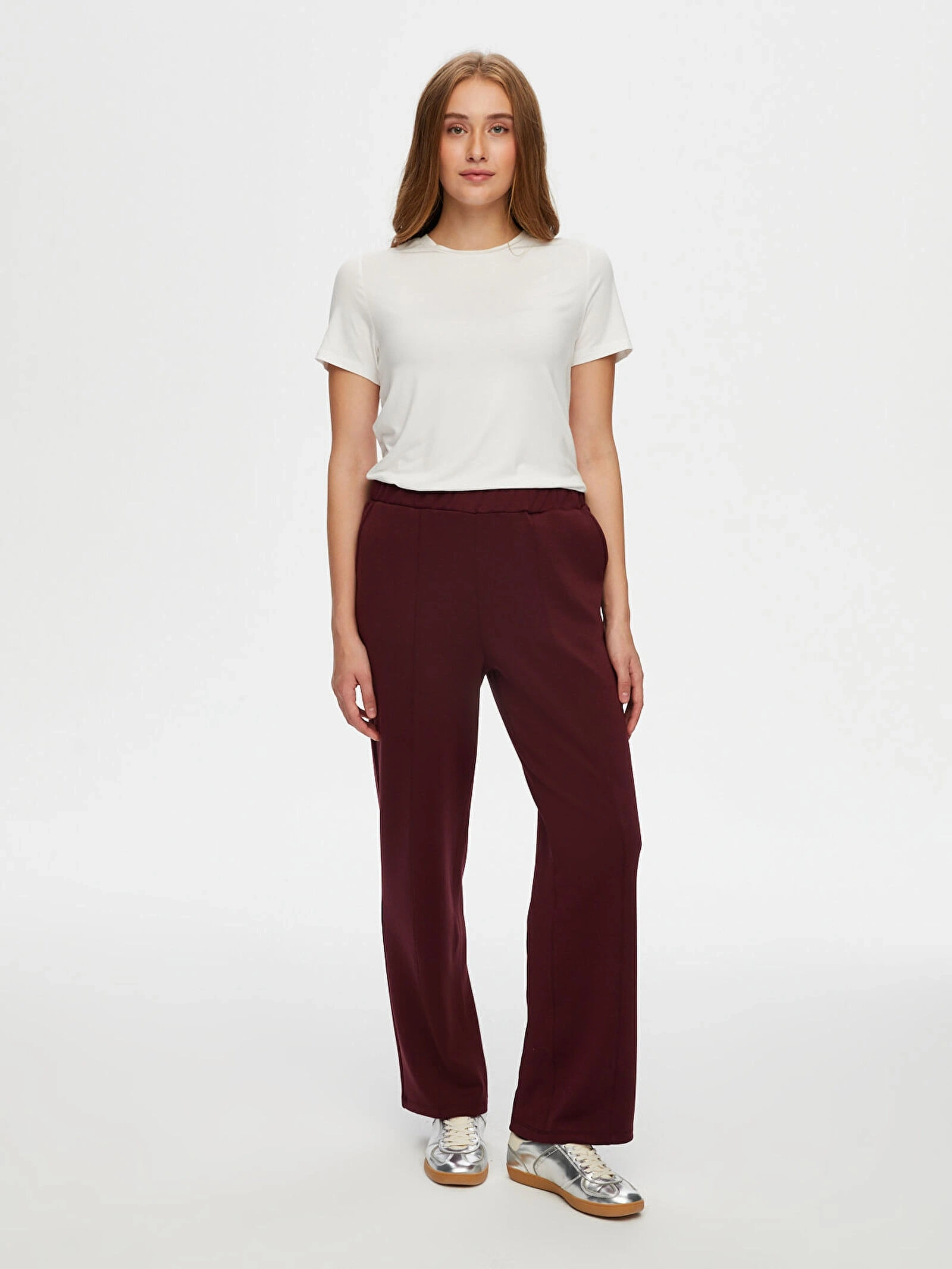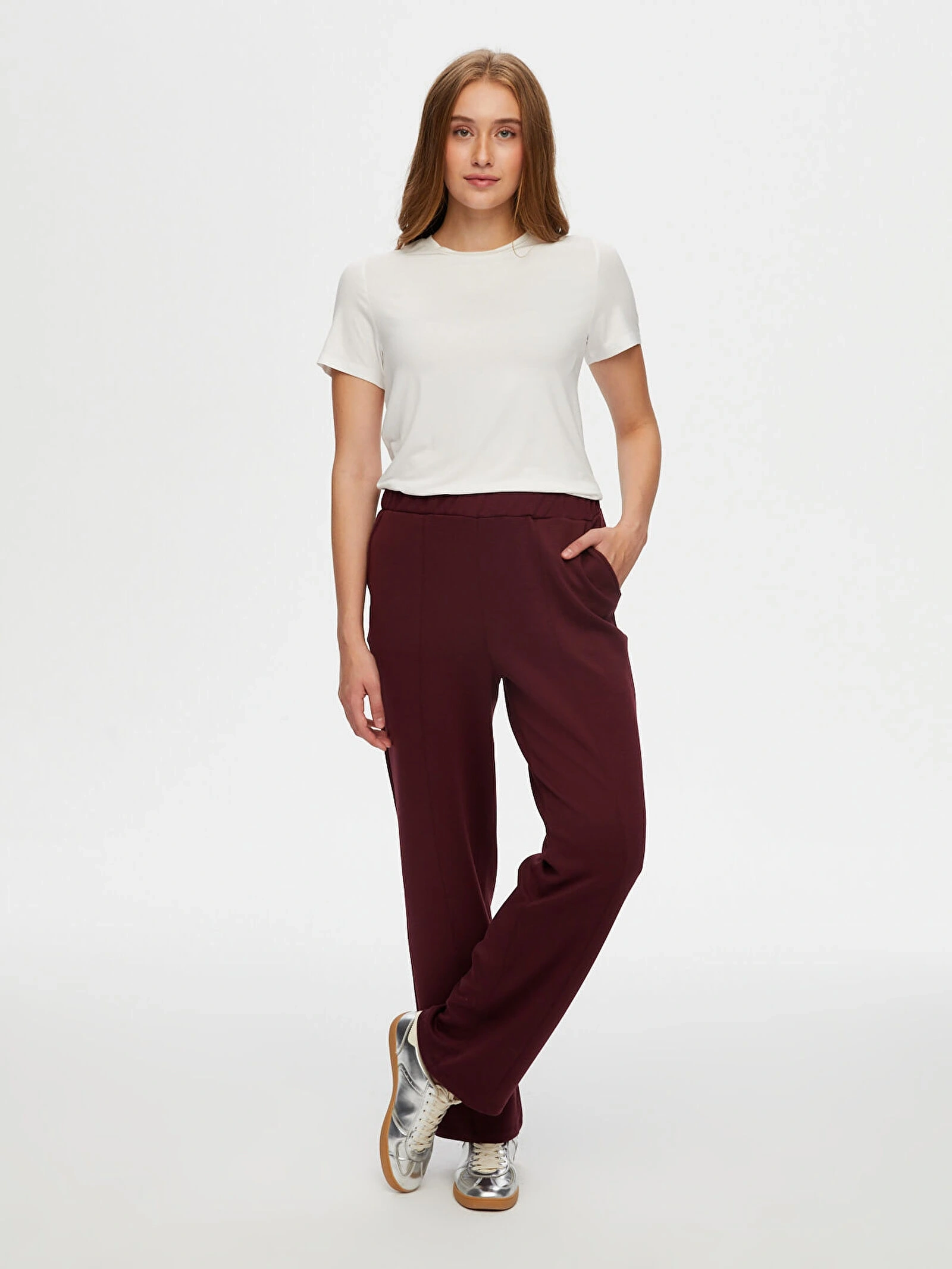 Faik Sönmez Kadın Önü Dikiş Detaylı Modallı Wide Leg Fit Mürdüm Eşofman Alt UW26ESA005, konforlu yapısı ve modern tasarım çizgileriyle günlük stilinize şıklık katar. Mürdüm renginin sofistike ve dikkat çekici görünümü, farklı üst parçalarla kolayca uyum sağlayarak kombinlerinize güçlü bir dokunuş sunar.