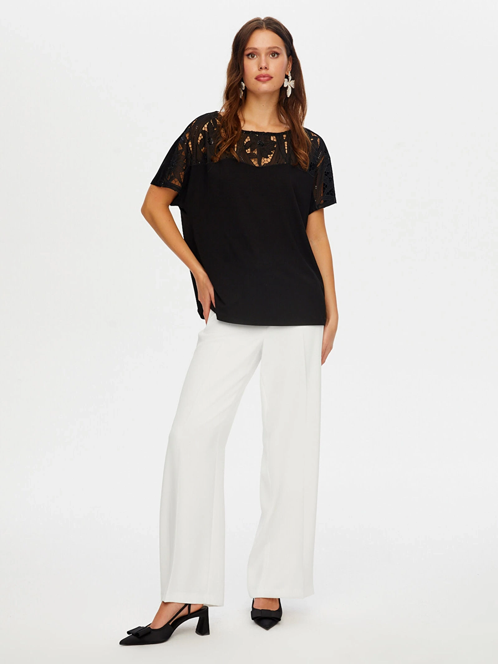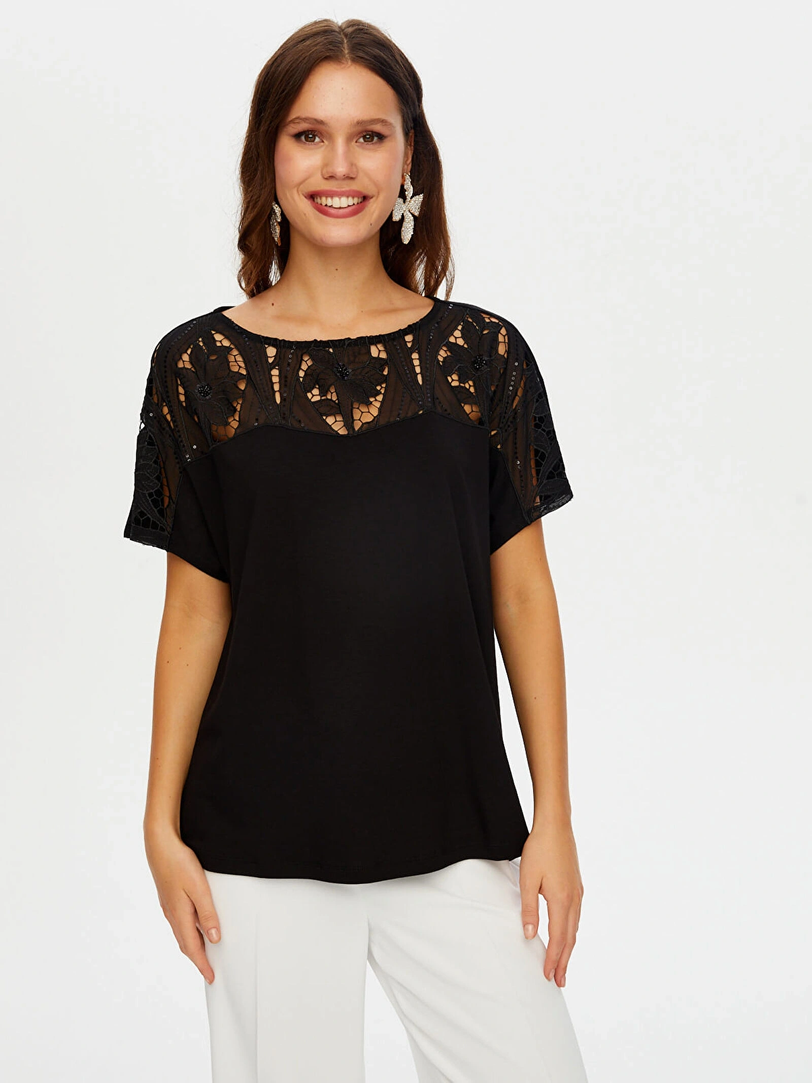 Faik Sönmez Kadın Payetli Dantel Garnili Kayık Yaka Kısa Kol Örme Siyah Bluz UW26BLZ027, zarif detayları ve şık tasarımıyla stilinize feminen bir dokunuş kazandırır. Payetli dantel garnili kayık yaka formu, göz alıcı ve sofistike bir görünüm sunarken siyah rengi ile zamansız bir şıklık yaratır.