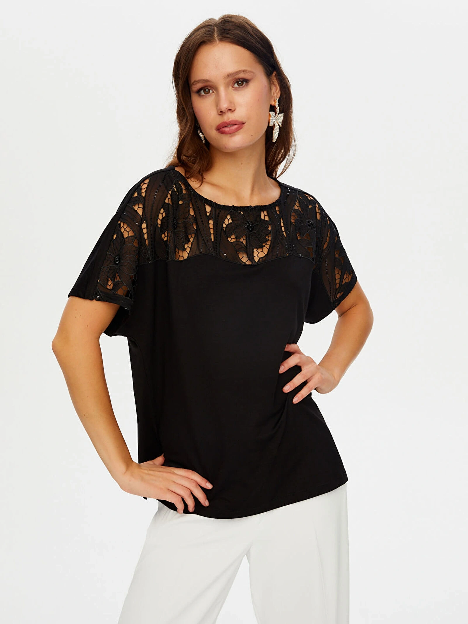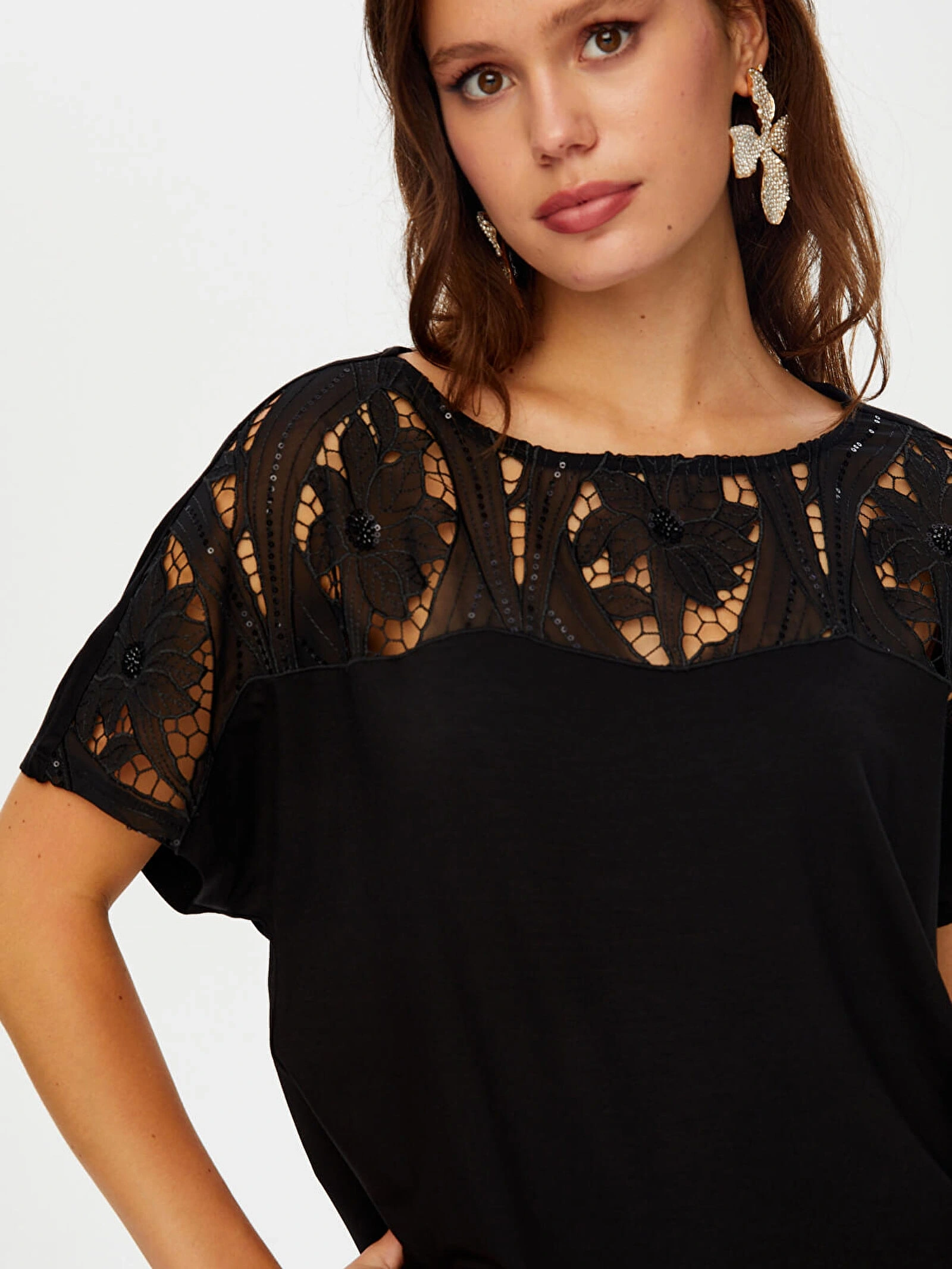 Payetli dantel garnili kayık yaka kısa kol örme bluz tasarımı