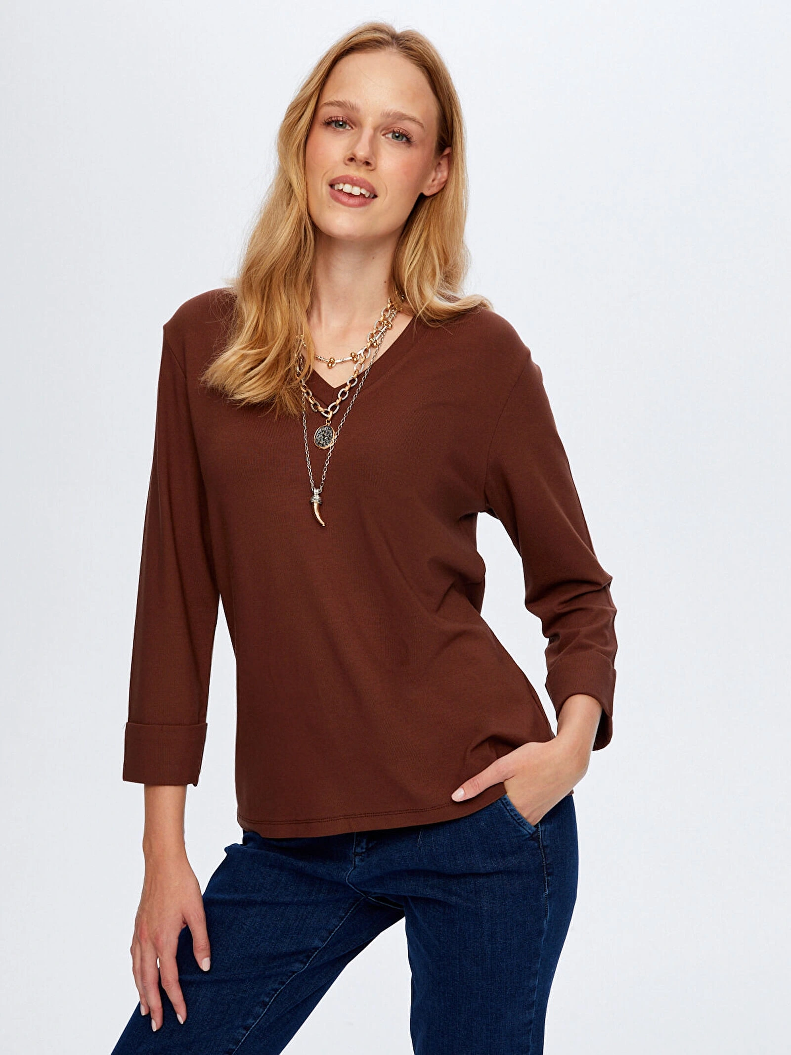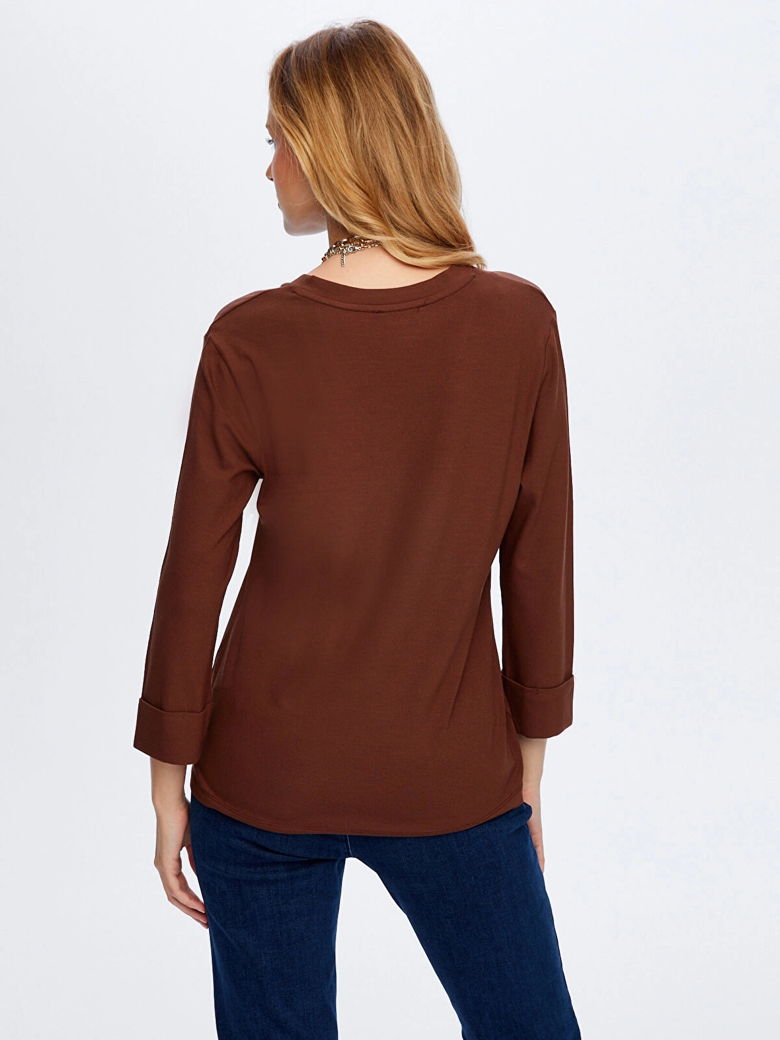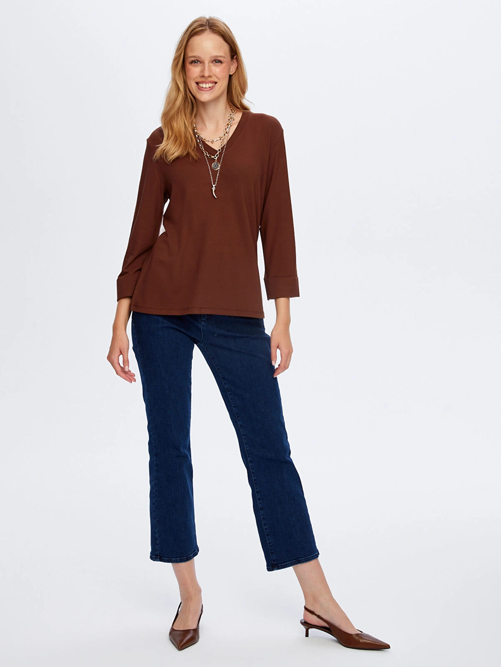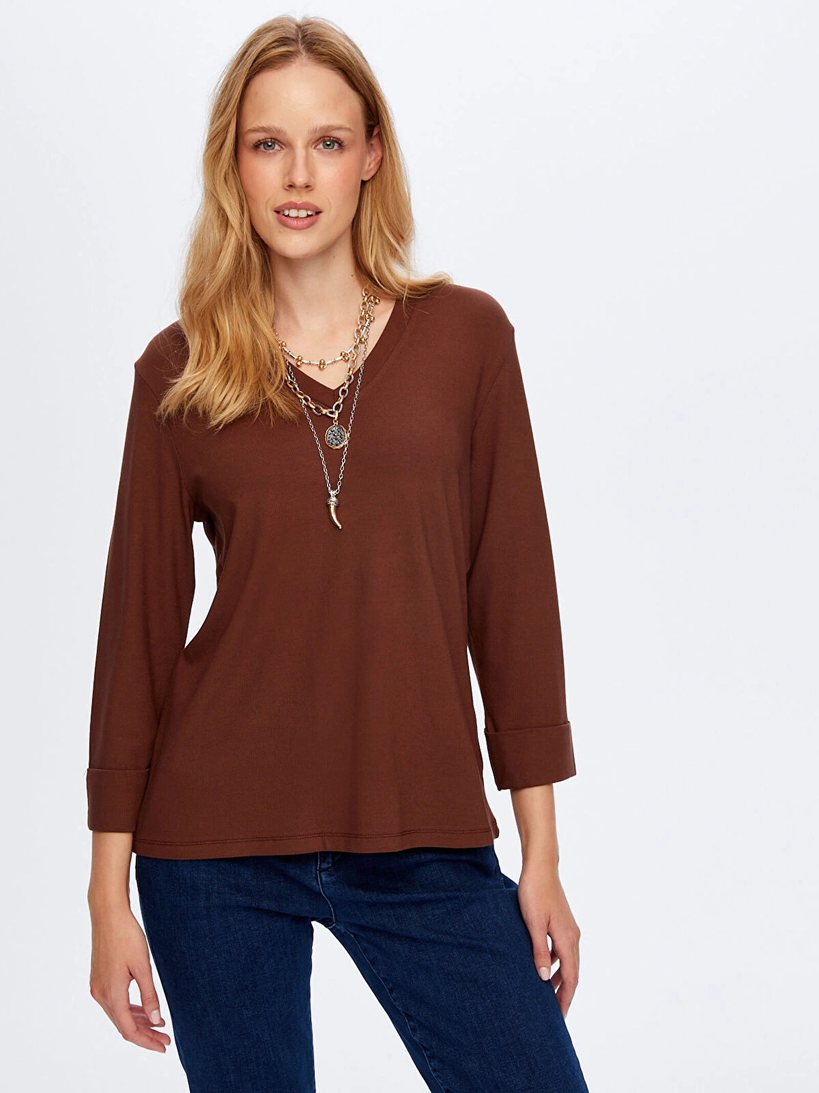 Faik Sönmez Kadın V Yaka Truvakar Kol Kahverengi T-Shirt UW26TSH002, sade tasarımına modern bir dokunuş katan şık ve konforlu bir parçadır. Kahverengi tonunun sıcak ve doğal görünümü, günlük kombinlere zarif bir uyum sağlarken farklı parçalarla kolayca eşleşerek çok yönlü bir kullanım sunar.