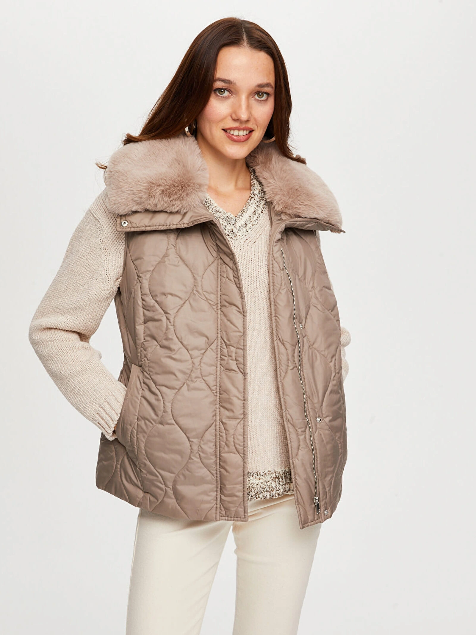 Faik Sönmez Kadın Yakası Suni Kürk Detaylı Kapitone Vizon Yelek W26KYL008