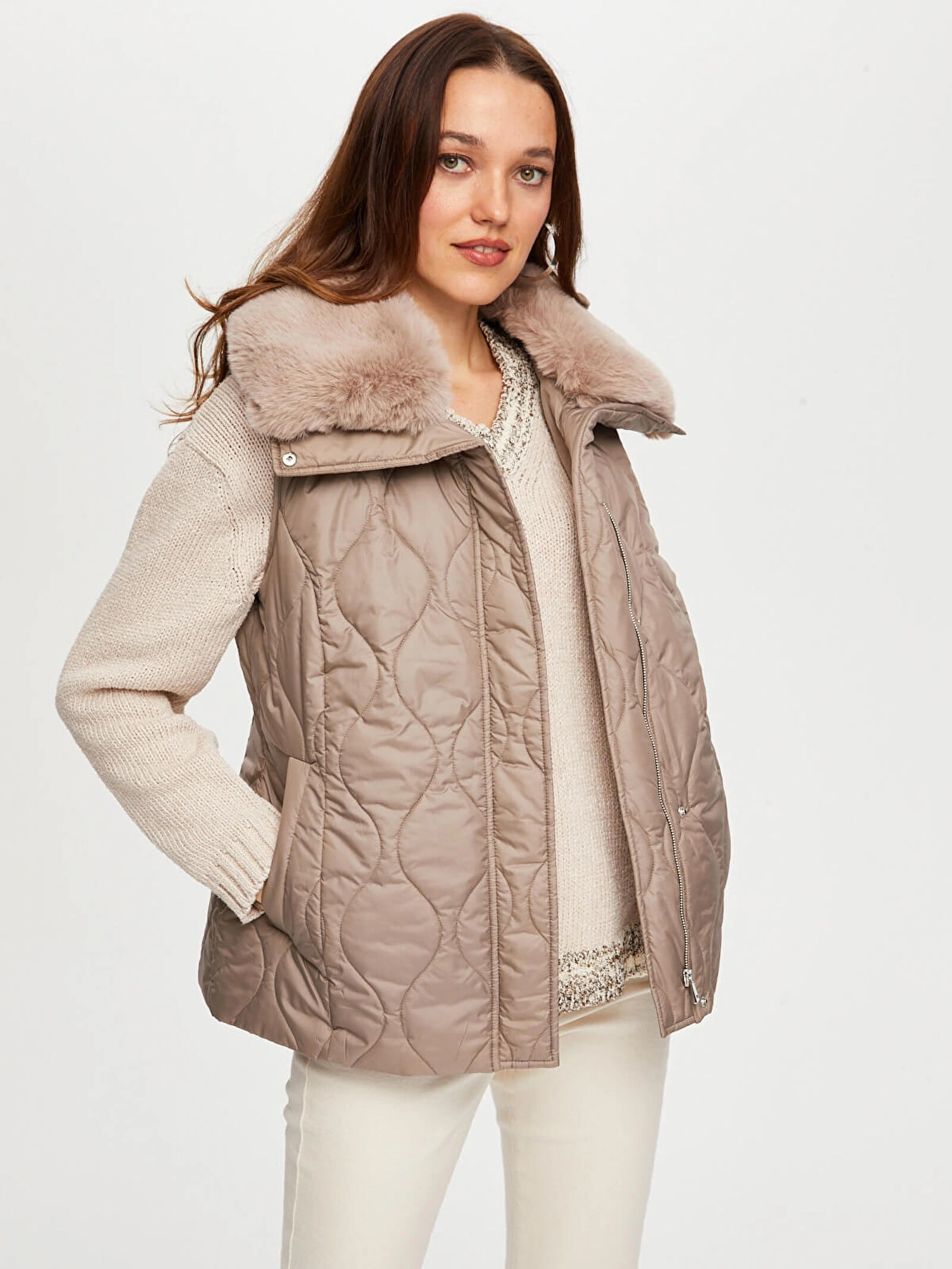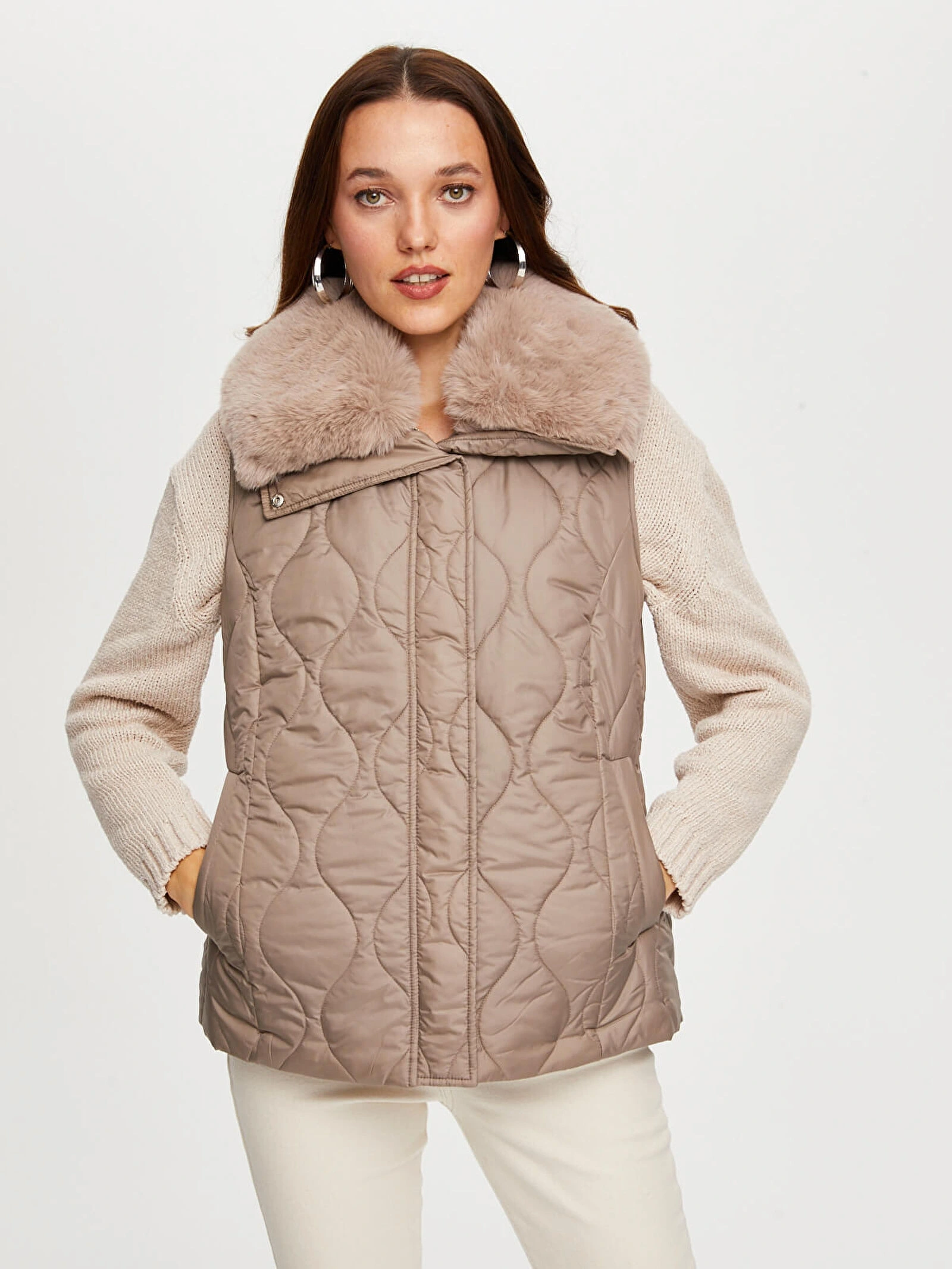 Bu yakası suni kürk detaylı kapitone yelek, soğuk havalarda stilinizi tamamlayan şık ve konforlu bir alternatiftir.
