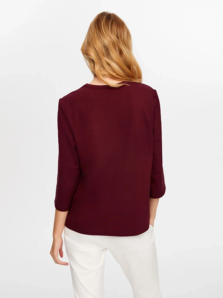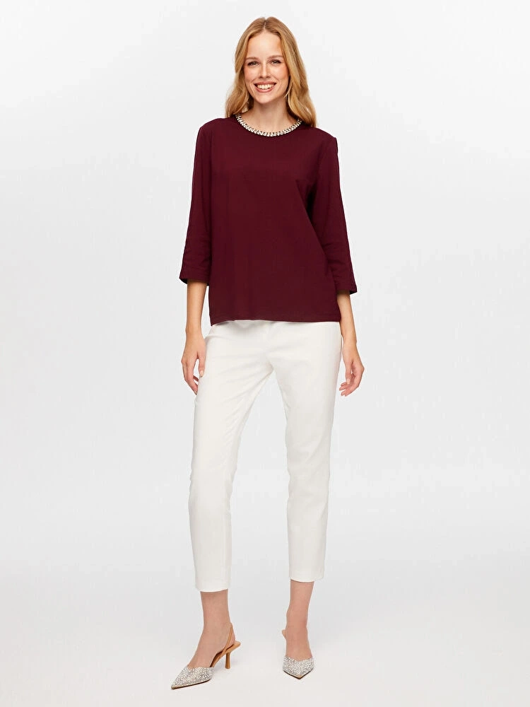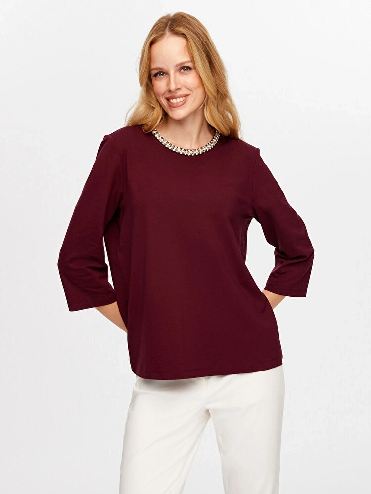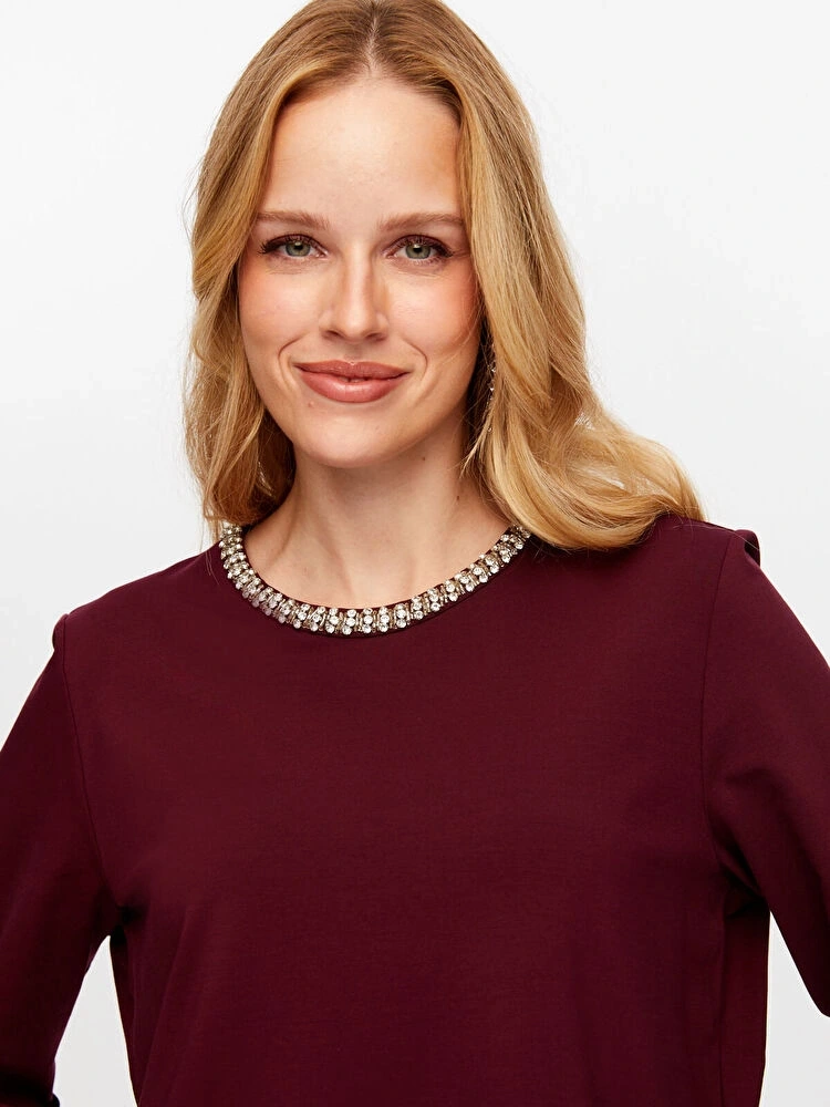 Faik Sönmez Kadın Yakası Taşlı Yuvarlak Yaka Mürdüm T-Shirt W26TSH072