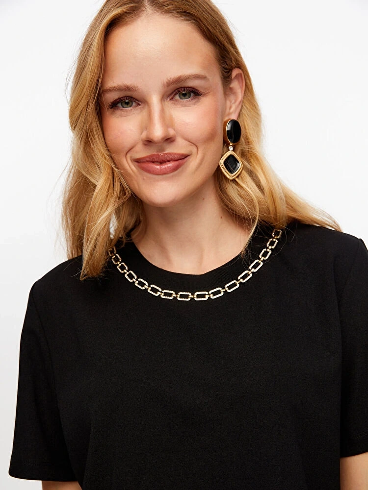 • Ürün Adı: Yakası Zincir Şerit Detaylı Yuvarlak Yaka Kısa Kol T-Shirt W26TSH062
