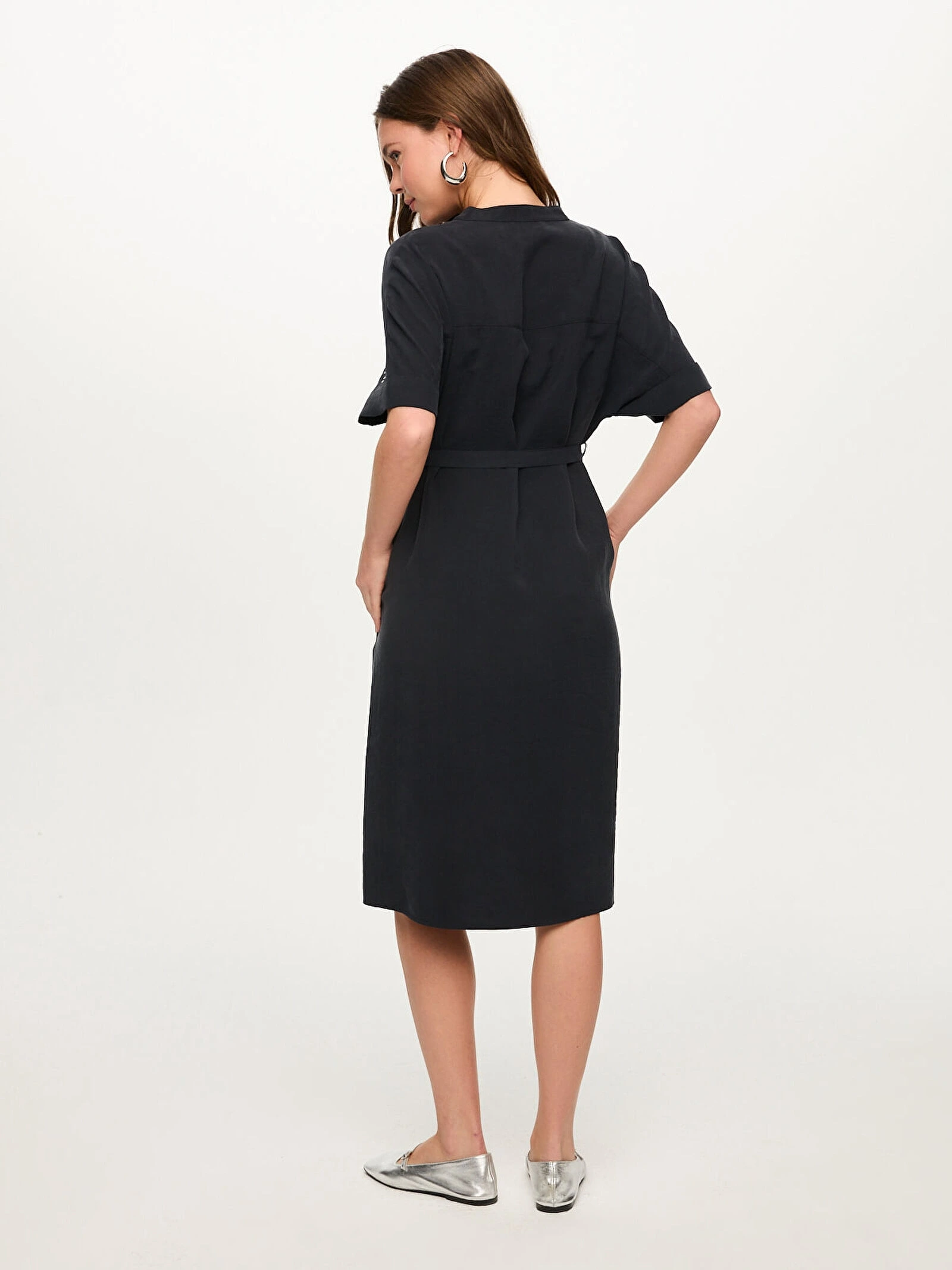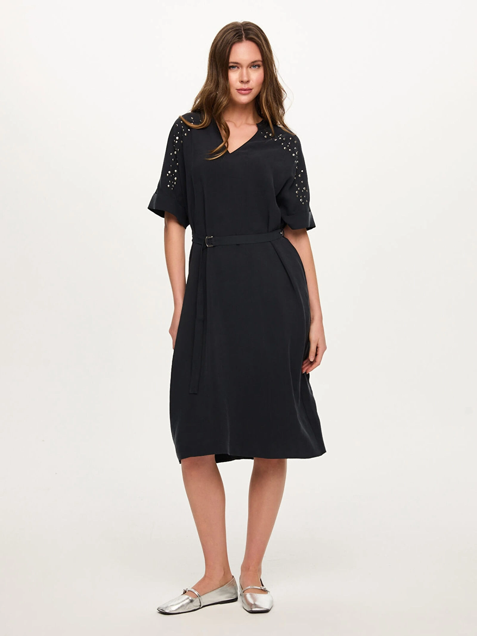 Faik Sönmez Omuzu Trok Taş Detaylı Beli Kemerli Elbise US26ELB039