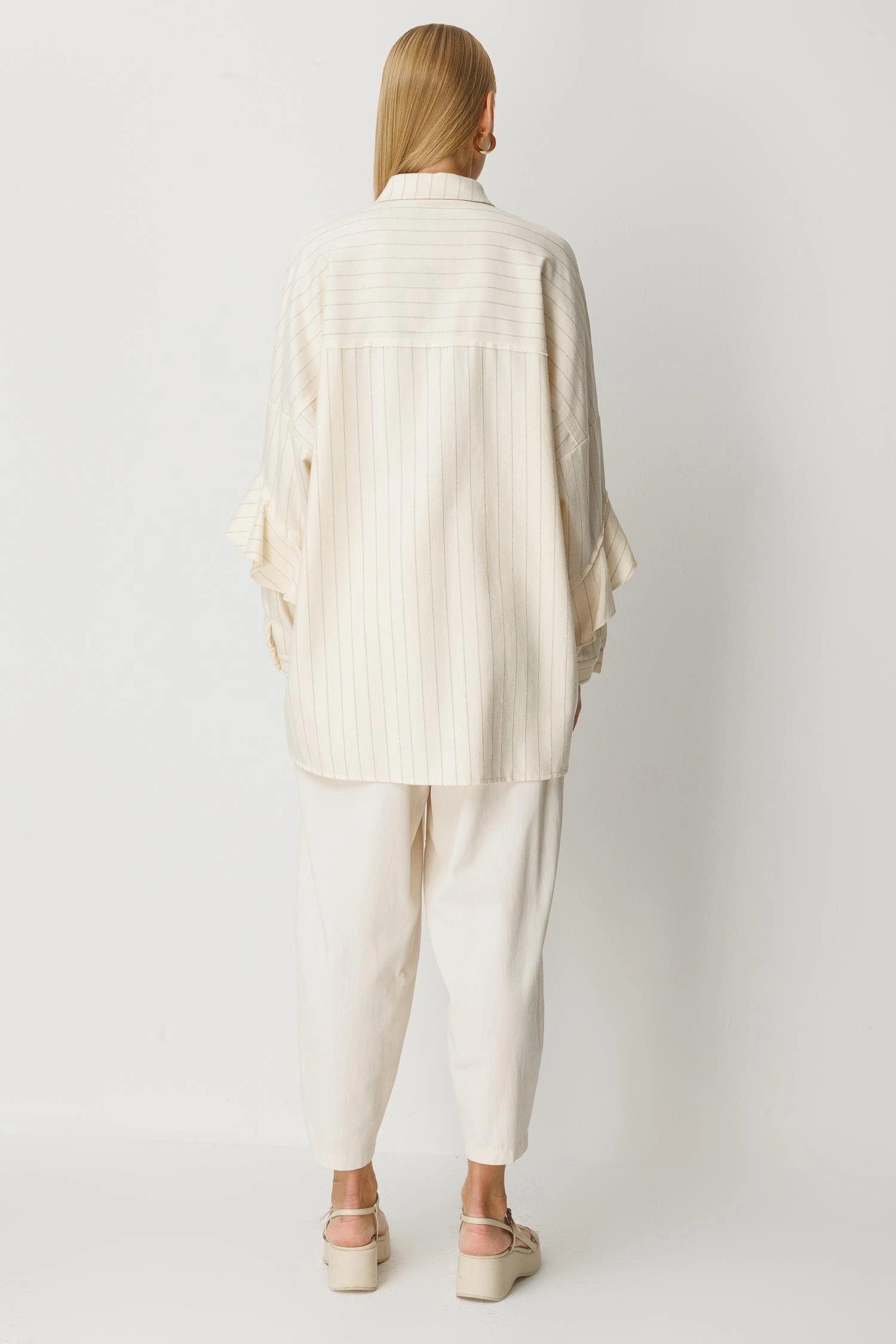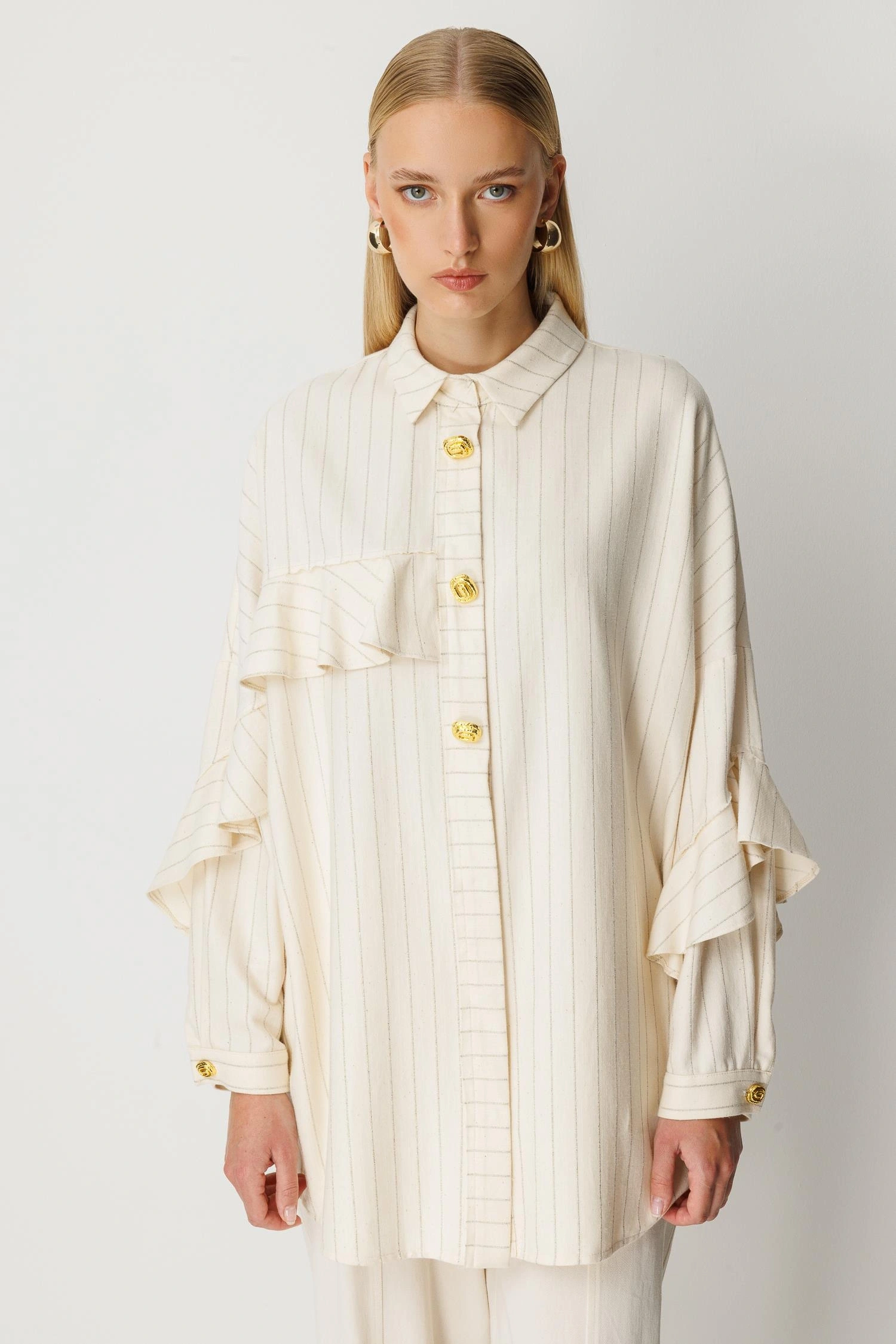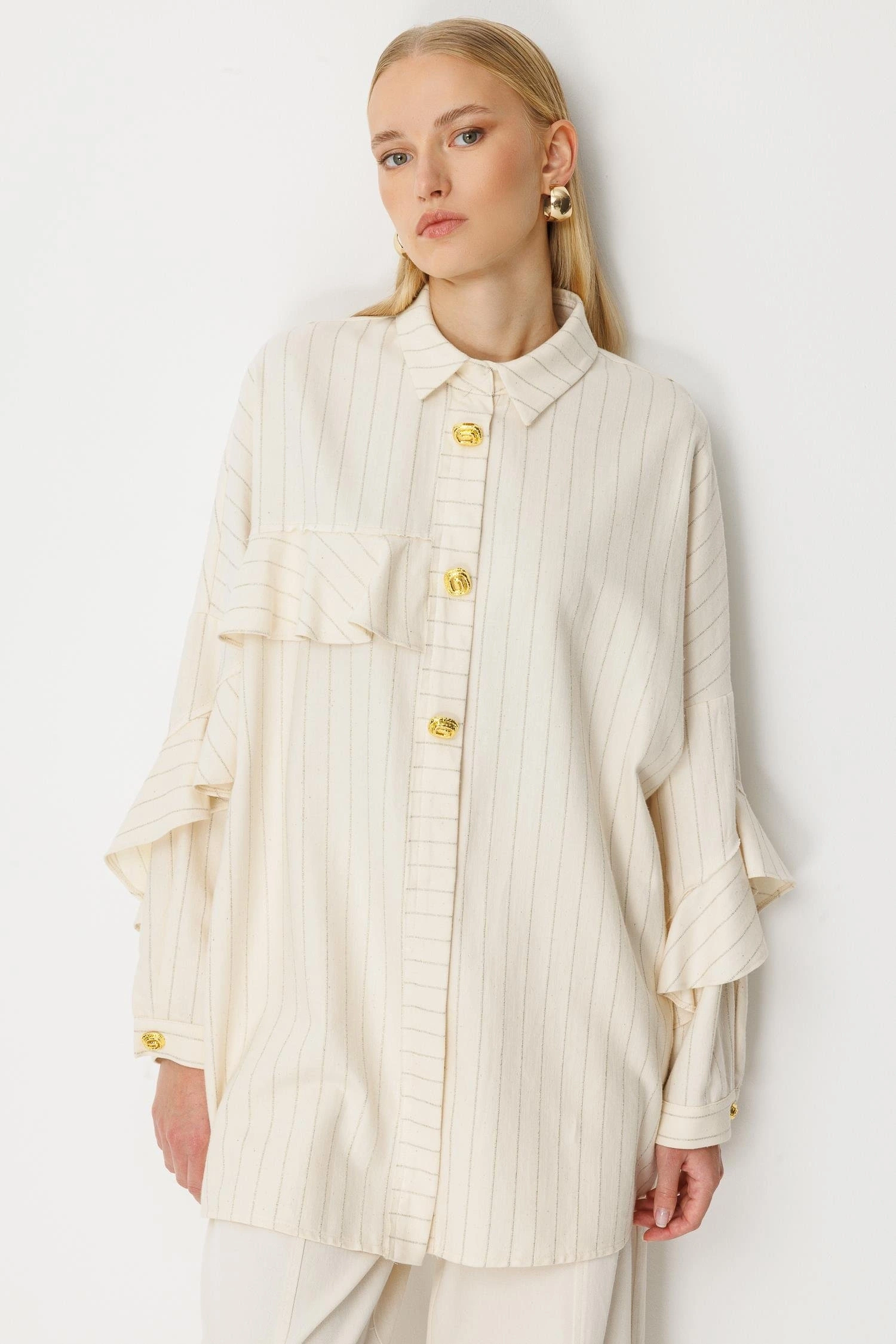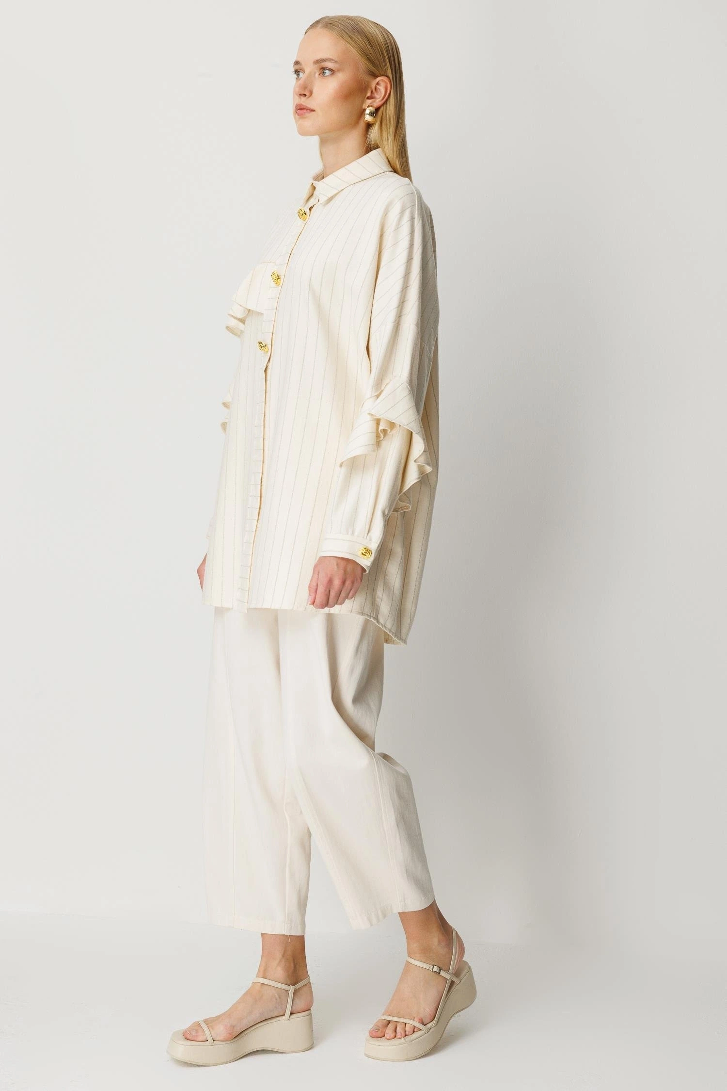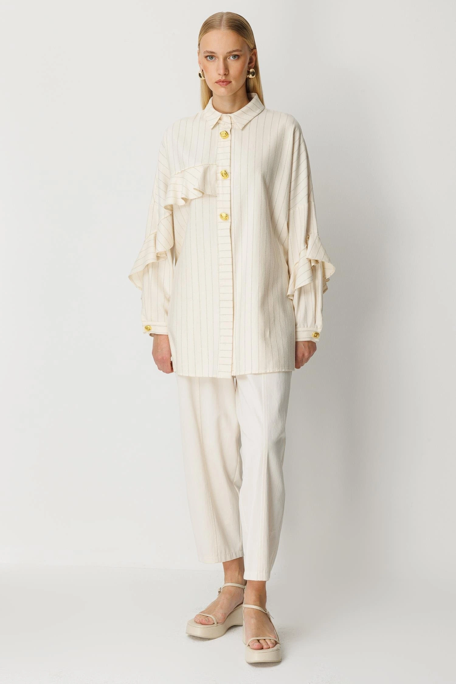 Ghisa Kadın Çizgili Düğme Detaylı Ekru Takım 25YGSTKM4975, şık çizgili tasarımı ve zarif detayları ile İlkbahar/Yaz sezonu için tasarlanmış modern bir tunik pantolon takımıdır. Gömlek yaka formu ve düğme kapama detayı, takıma klasik ve güçlü bir duruş kazandırırken kolları fırfırlı ve manşetli tasarımı ile feminen bir görünüm sunar. Uzun tunik form, pantolon ile uyumlu bir siluet oluşturur. Pantolon beli lastikli yapısı ise gün boyu rahat bir kullanım sağlar.