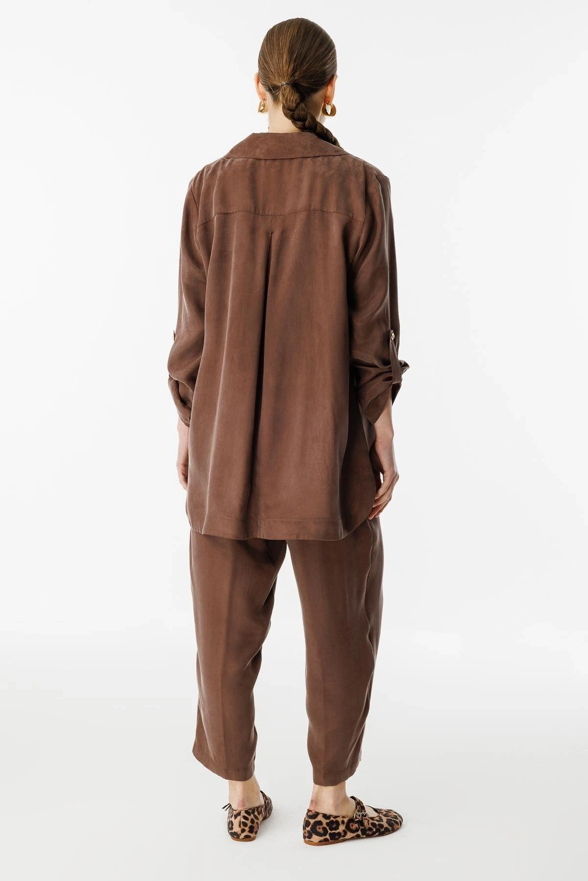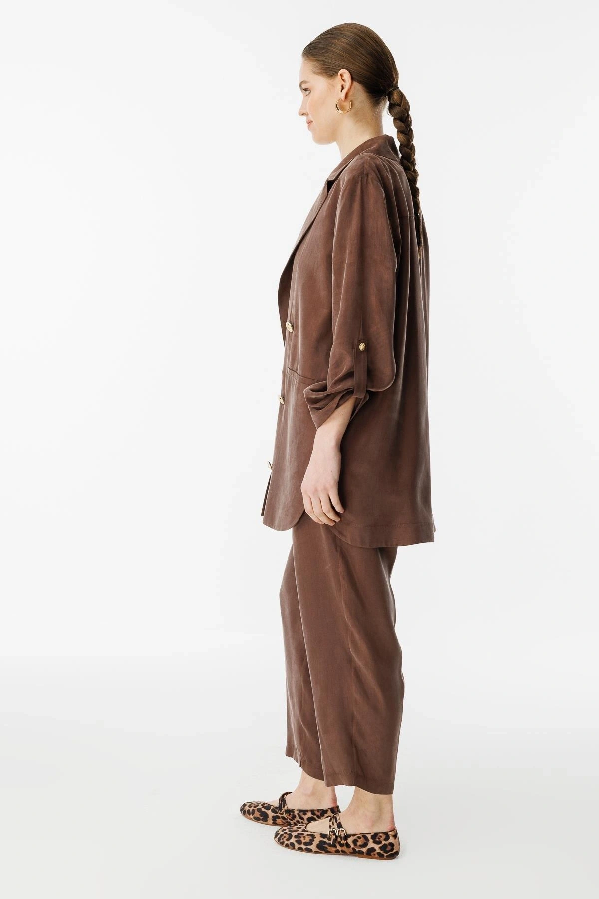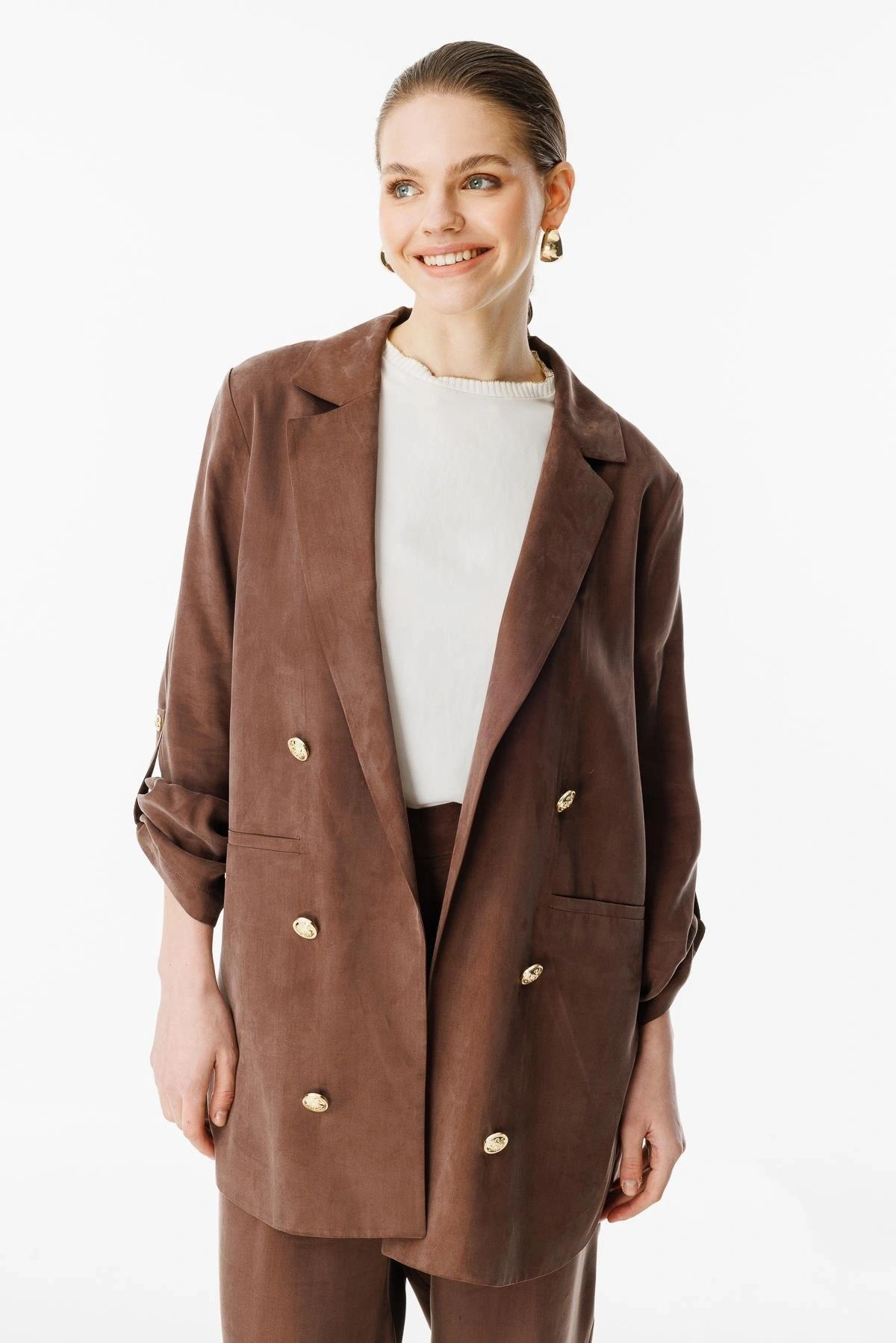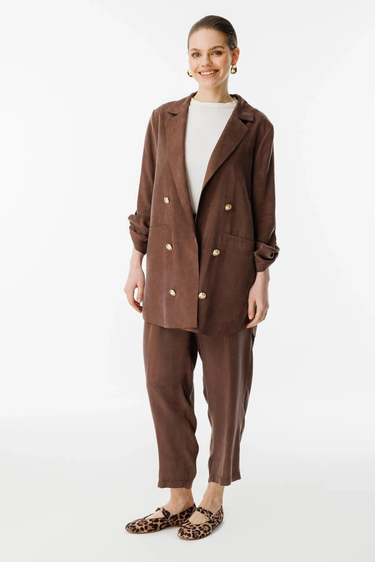 Dokuma kumaş grubuna sahip olan takım, %60 liosel ve %40 viskon içeriği sayesinde yumuşak dokulu ve hafif bir yapı sunar. Kahverengi rengi, doğal ve zamansız bir stil oluşturarak sezon kombinlerinde kolaylıkla tercih edilebilir. Ürün, görselde yer alan manken ölçüleri ile sunulmaktadır.