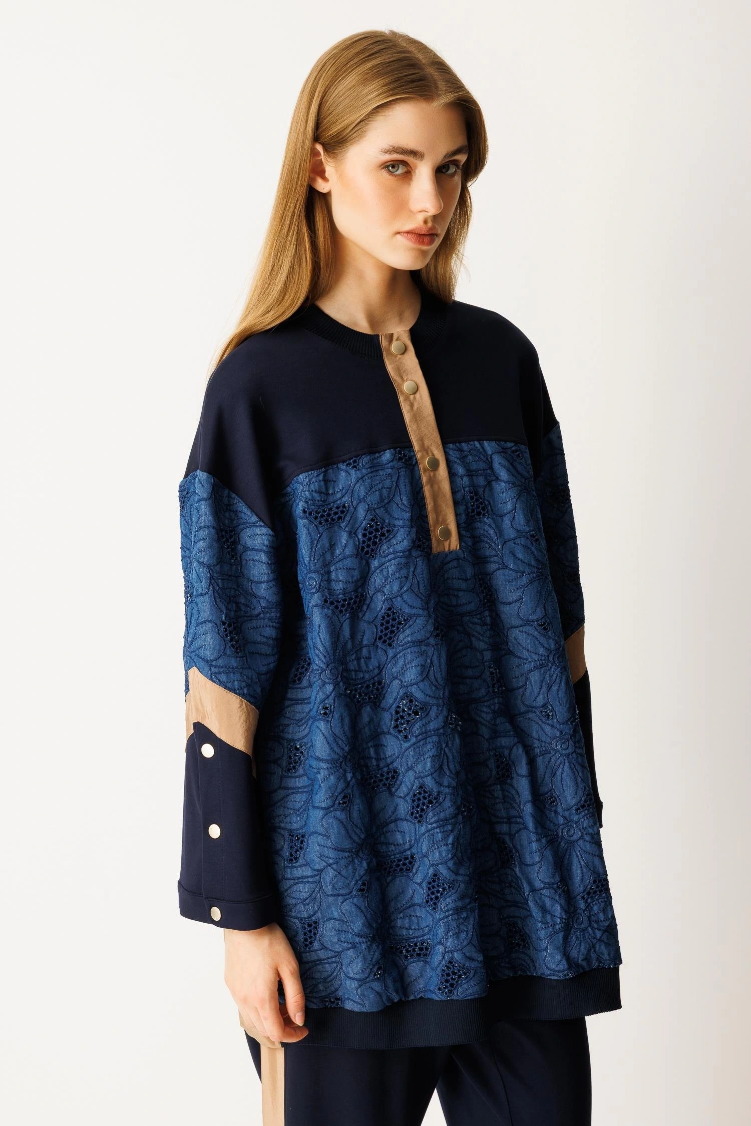 Ghisa Kuş İşlemeli Taşlı Düğmeli İkili Kot Takım 25YGSTKM3951 Mavi