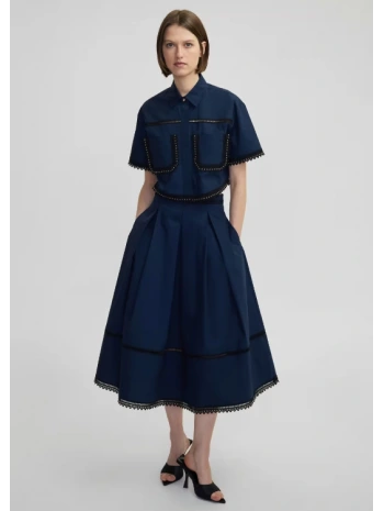 Yün içerikli dokusu üzerine uygulanan eskitme efektleri, midi eteğe güçlü ve modern bir karakter kazandırır. Düz kesimi ve arkadan yırtmaç detayı, akıcı ve zarif bir silüet oluştururken, ribanalı elastik bel yapısı konforlu bir kullanım sunar. Takım ceketiyle birlikte kullanıldığında, feminen ve çağdaş stil kodlarını eklektik bir bütünlük içinde yeniden yorumlar.