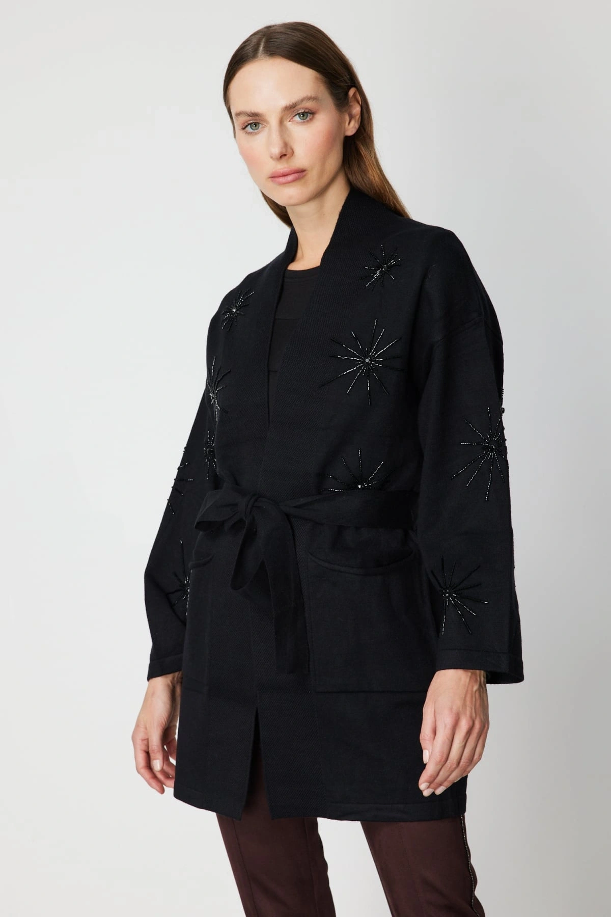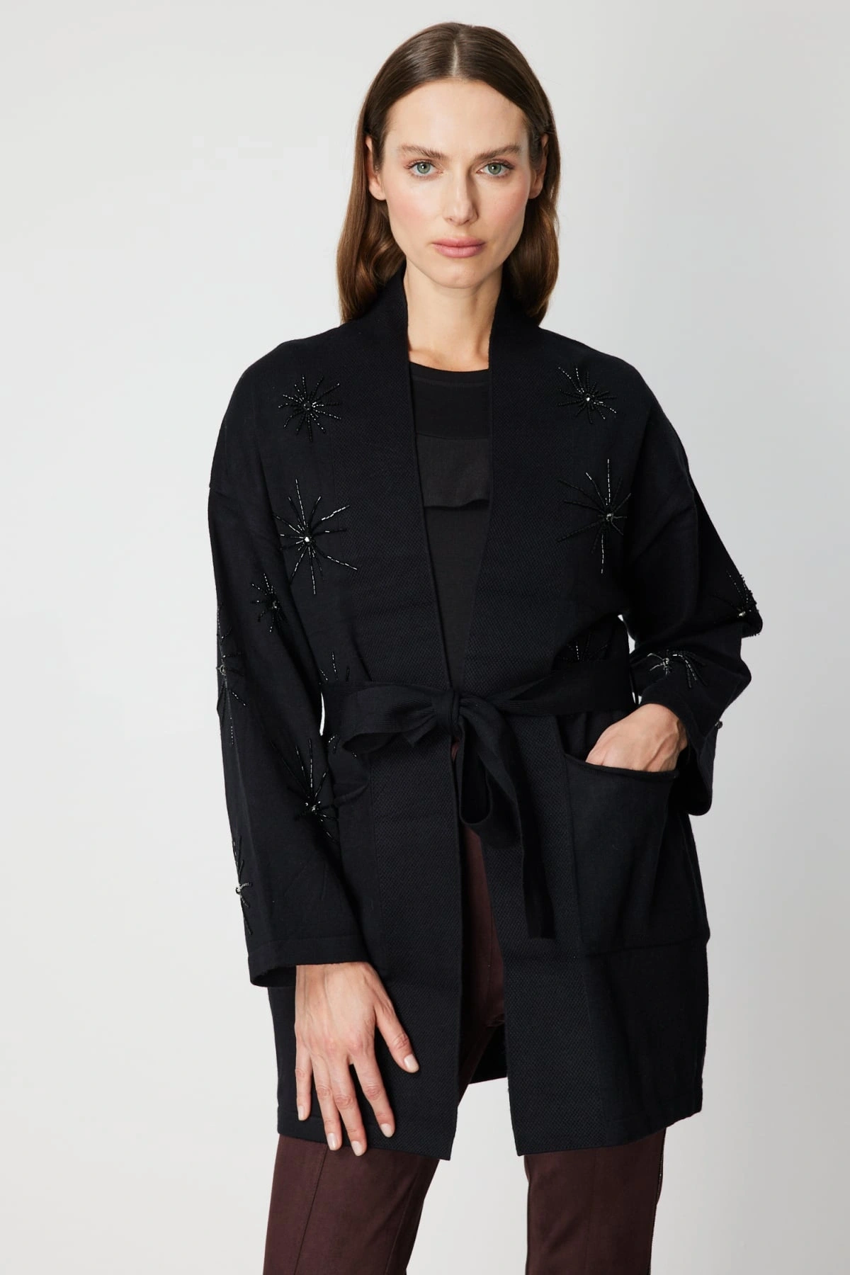 Orta kalınlıktaki triko kumaşı, kış aylarında ideal bir sıcaklık sağlarken astarsız yapısı ile hafif ve rahat bir kullanım sunar. %50 viskon, %25 polyester ve %25 polyamid içeriğe sahip kumaşı, yumuşak dokusu ve dayanıklı yapısıyla öne çıkar. Siyah rengi, taş işlemeleriyle birleşerek zamansız ve sofistike bir stil oluşturur. Ürün, görselde yer alan manken ölçüleri ile sunulmaktadır.