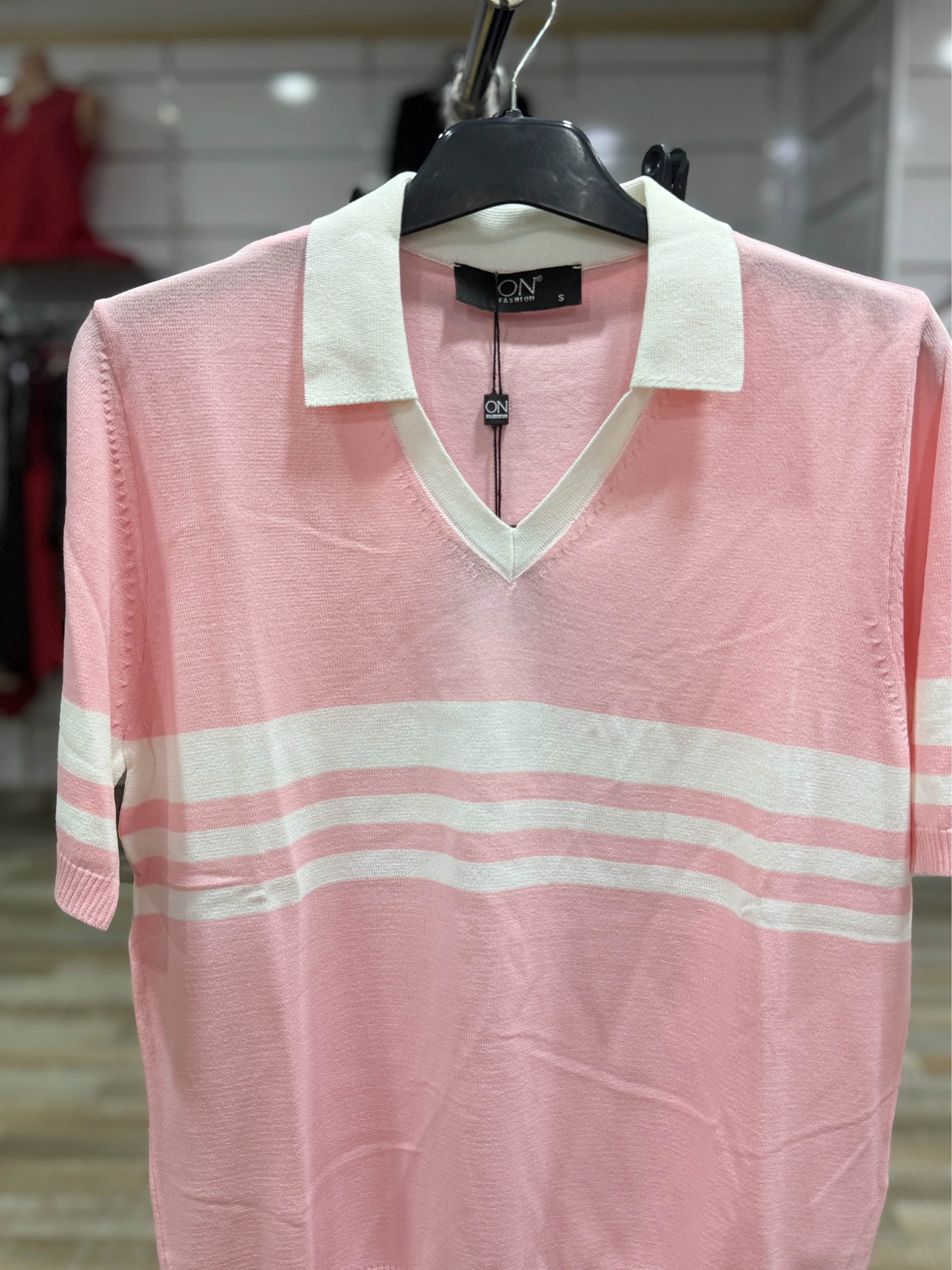 On Fashion Çizgi Detaylı Polo Yaka Kısa Kol Bluz 53300