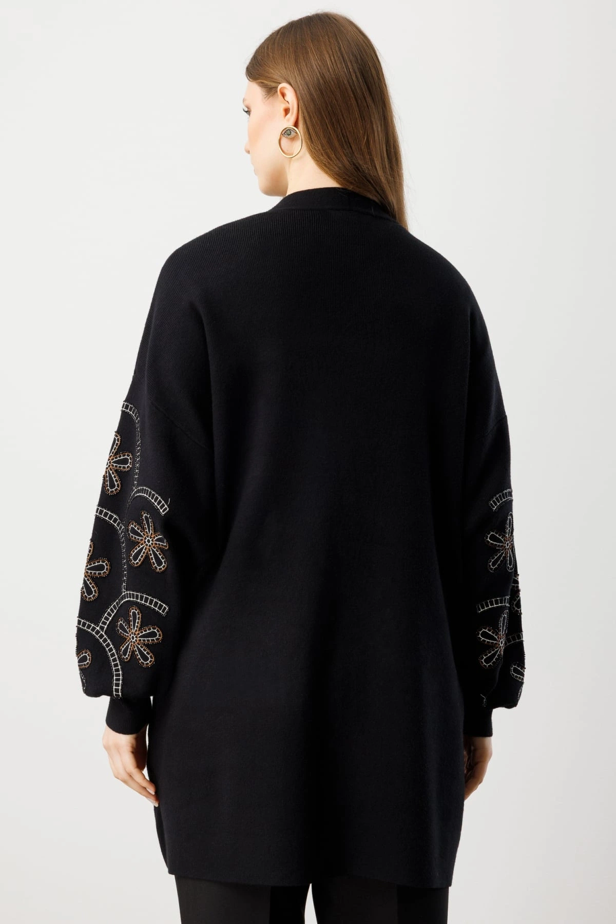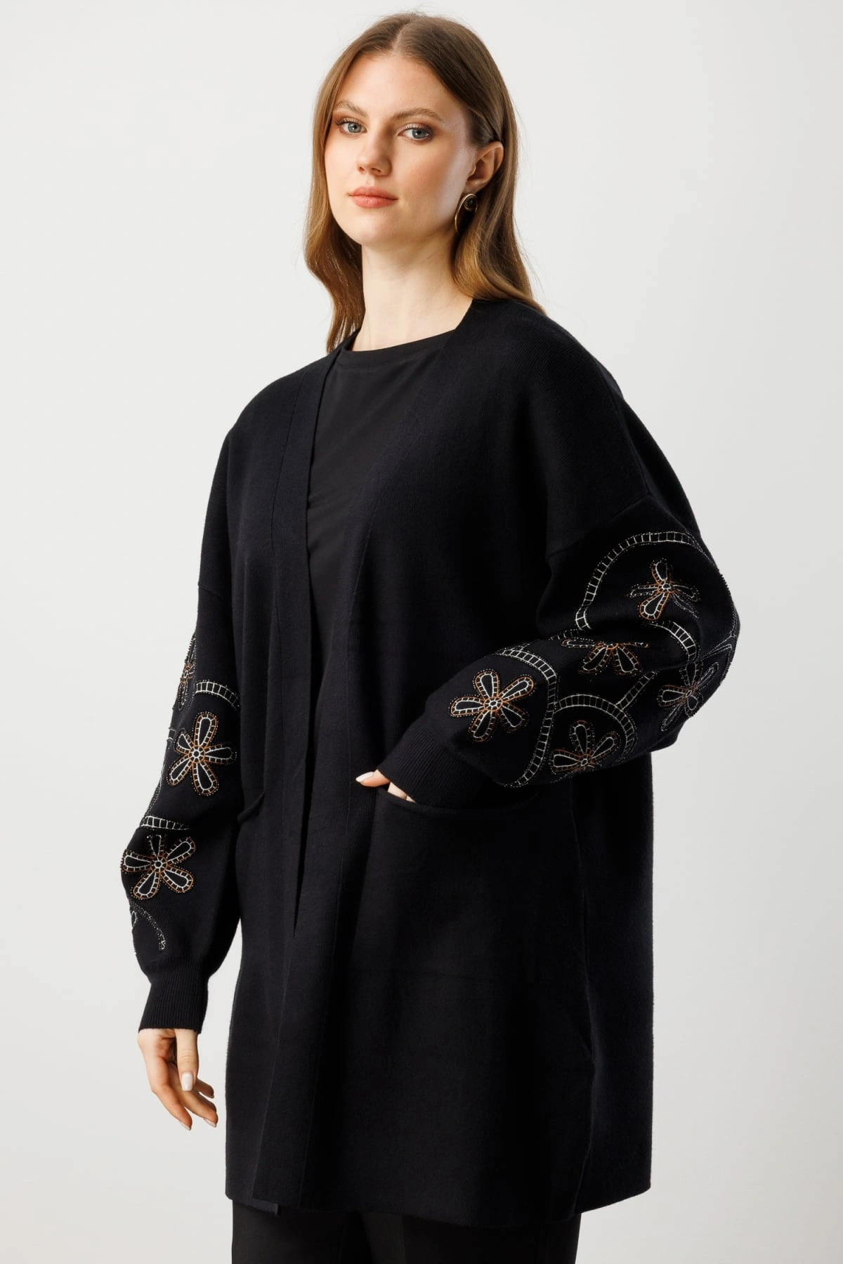 Orta kalınlıktaki triko kumaşı, kış aylarında ideal bir sıcaklık sağlarken astarsız yapısı ile hafif ve konforlu bir kullanım sunar. %50 viskon, %25 polyester ve %25 polyamid içeriğe sahip kumaşı, yumuşak dokusu ve dayanıklı yapısıyla öne çıkar. Çiçek işlemeleri, sade siyah zemin üzerinde zarif bir hareketlilik yaratırken zamansız ve kolay kombinlenebilir bir stil oluşturur. Ürün, görselde yer alan manken ölçüleri ile sunulmaktadır.
