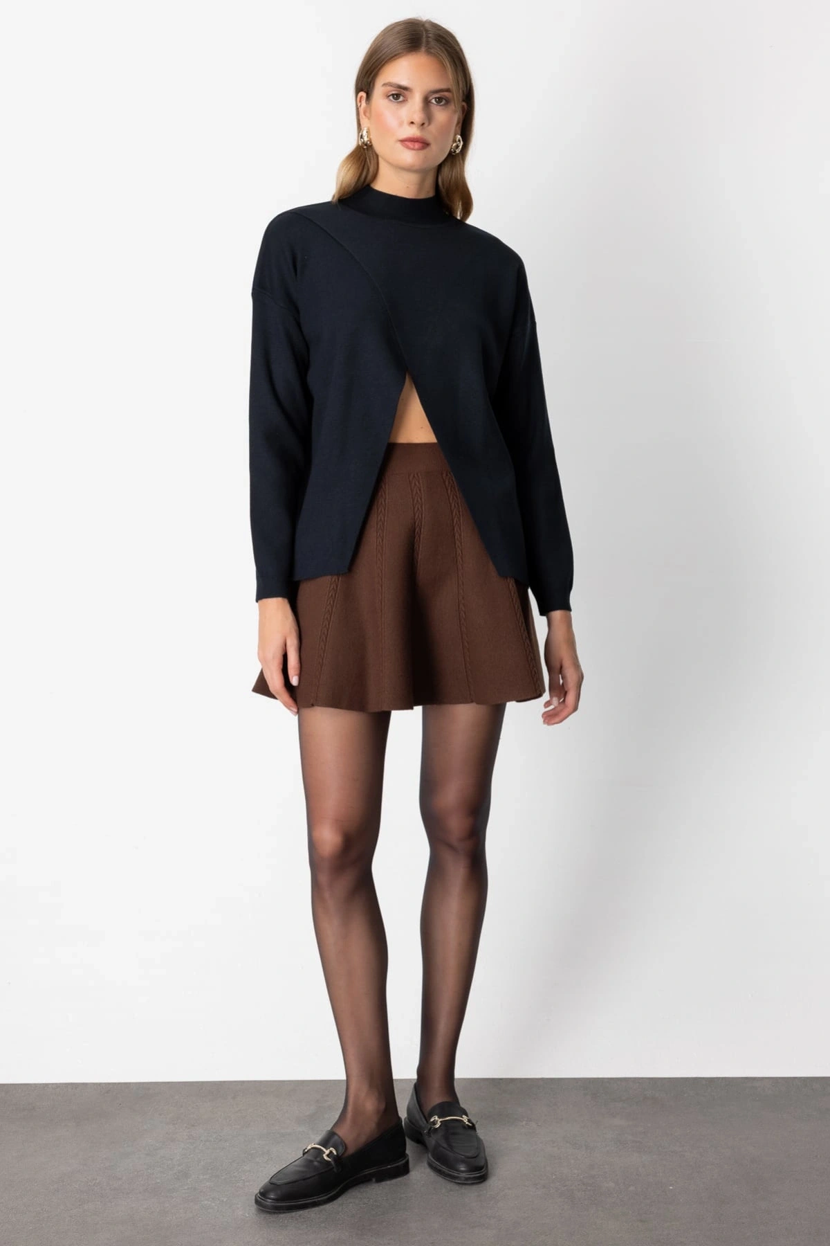 On Fashion Kadın Dik Yaka Çapraz Siyah Kazak 65343, modern ve iddialı tasarımıyla 2026 Kış sezonunun dikkat çeken triko modellerinden biridir. Asimetrik kalıbı sayesinde klasik kazak formunun dışına çıkarak özgün bir siluet sunar. 65 cm ürün boyu, dengeli ve akışkan bir görünüm oluşturur.