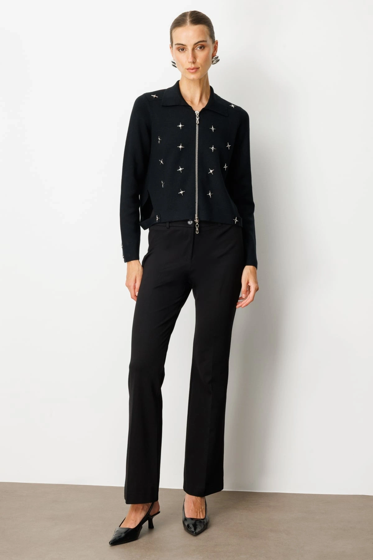 On Fashion Kadın Polo Yaka Zımbalı Fermuarlı Siyah Hırka 65905, modern zımbalı detayları ve şık polo yaka tasarımı ile 2026 Kış sezonu için tasarlanmış dinamik ve kullanışlı bir hırkadır. Regular kalıbı, vücuda dengeli ve rahat bir oturuş sunarken 52 cm ürün boyu, modern ve sportif bir siluet oluşturur. Polo yaka formu, hırkaya klasik bir duruş kazandırırken fermuarlı kapama şekli, pratik ve konforlu bir kullanım imkânı sağlar.
