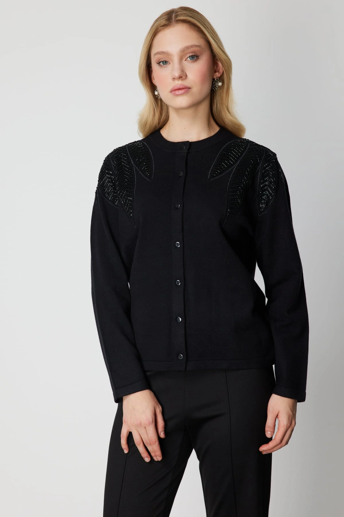 On Fashion Kadın Taş Detaylı Siyah Hırka 60908, zarif taş detayları ve zamansız tasarımı ile 2026 Kış sezonu için tasarlanmış şık ve kullanışlı bir hırkadır. Regular kalıbı, vücuda dengeli ve rahat bir oturuş sağlarken 60 cm ürün boyu, günlük ve klasik kombinler için ideal bir siluet sunar. Sıfır yaka tasarımı, sade ve modern bir görünüm kazandırırken düğmeli kapama şekli, pratik ve düzenli bir kullanım imkânı sağlar.
