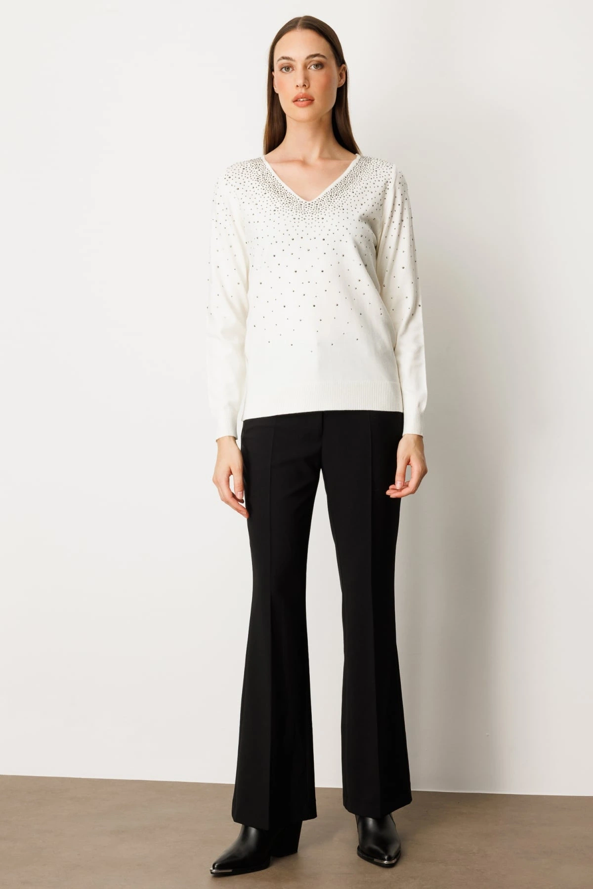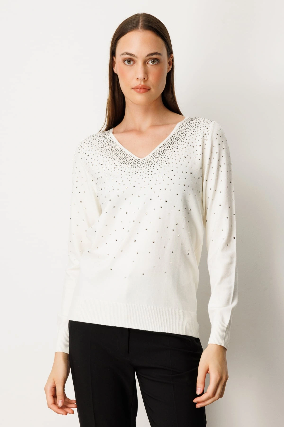 Ürün Adı: On Fashion Kadın V Yaka Önü Taşlı Ekru Kazak 65315