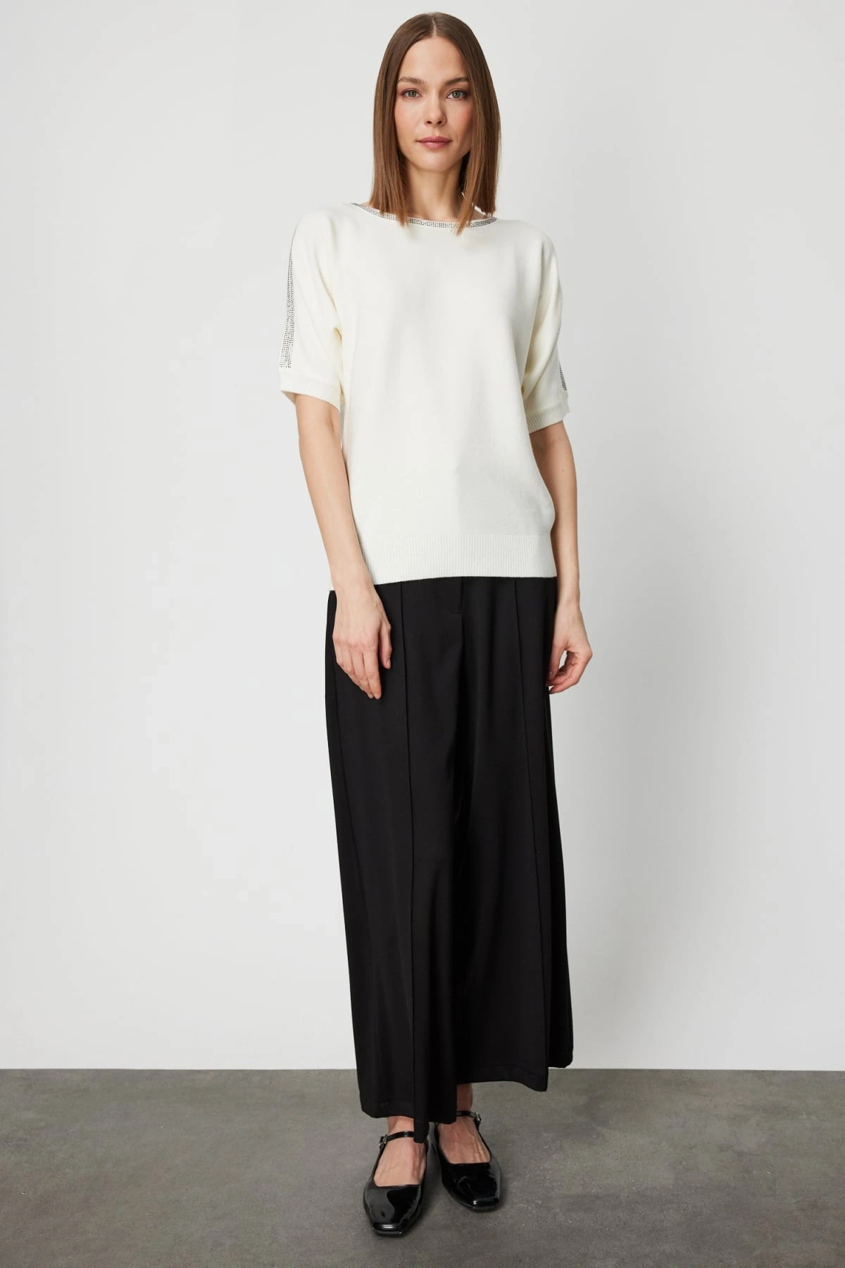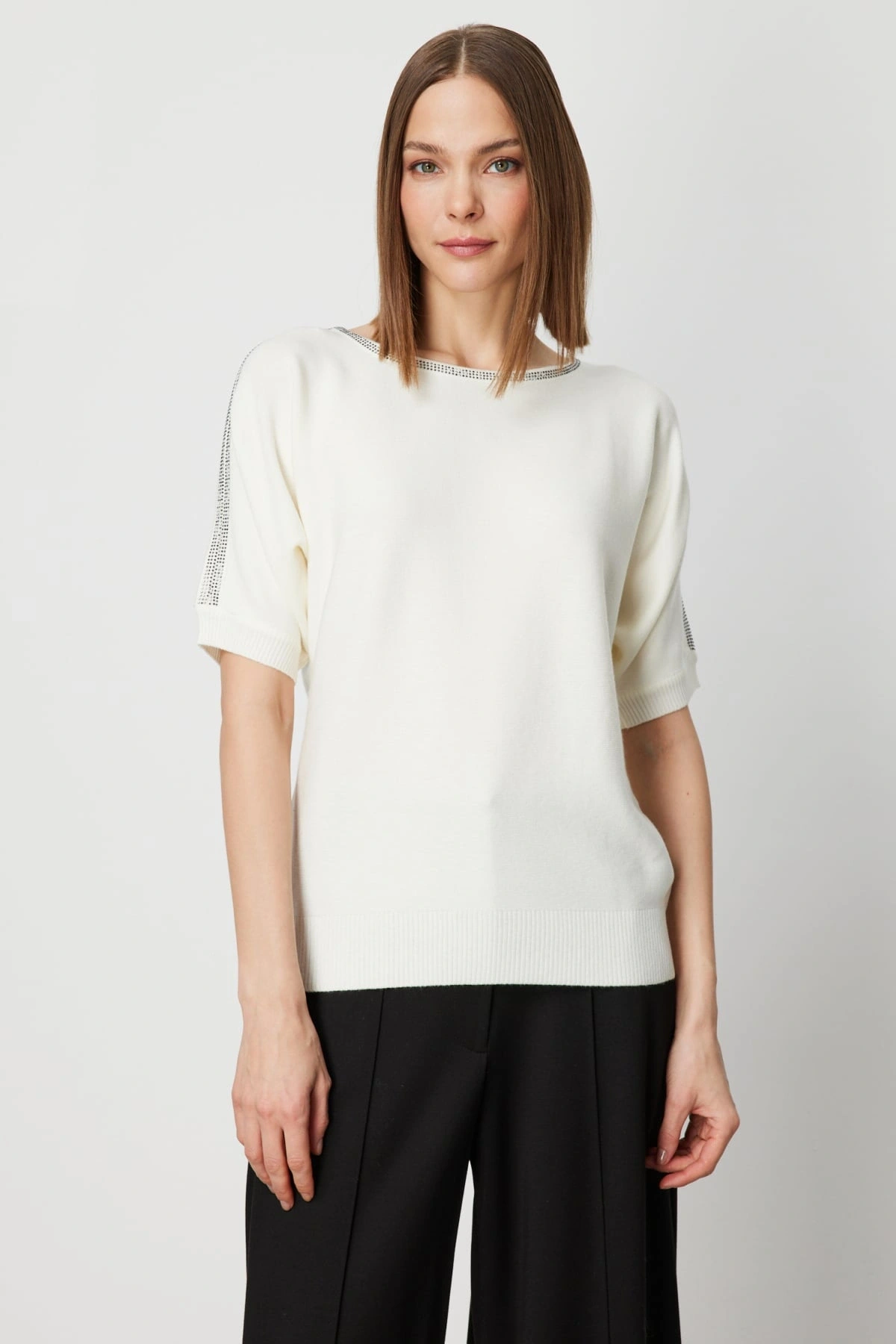 On Fashion Kadın Yakası ve Kolları Taşlı Ekru Yarım Kol Kazak, 2026 kış sezonu için tasarlanan zarif ve modern bir triko üründür. Yaka ve kol bölümlerinde yer alan taş detayları, sade tasarıma şık ve dikkat çekici bir ışıltı kazandırır. Regular kalıbı, vücuda rahat oturan dengeli bir duruş sunarken orta kalınlıktaki triko kumaşı serin havalarda ideal konfor sağlar. Sıfır yaka formu modern bir görünüm sunarken düşük ve kısa kol tasarımı, klasik kazak stiline farklı ve özgün bir yorum katar. Astarsız yapısı, hafif ve doğal bir kullanım deneyimi sağlar.