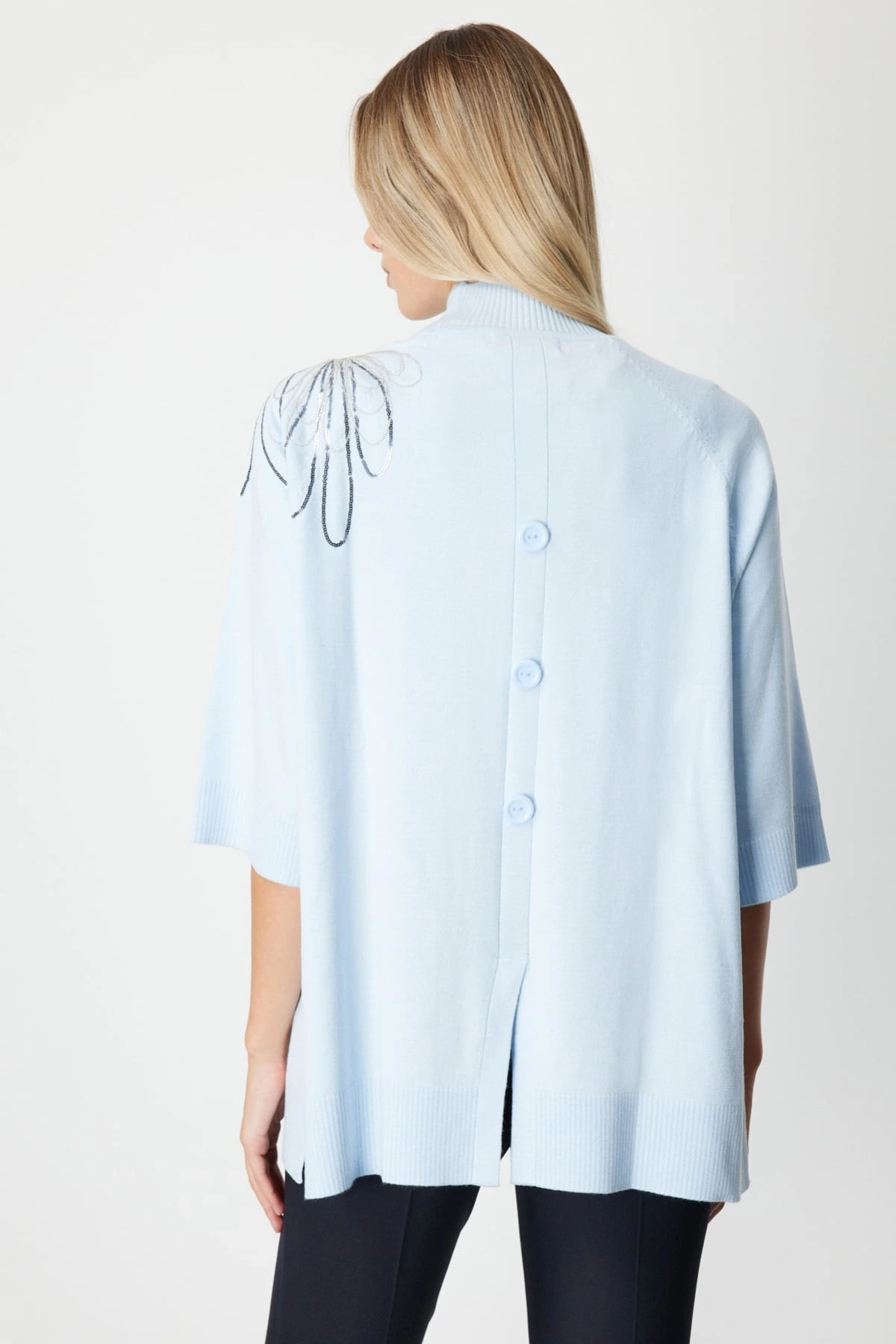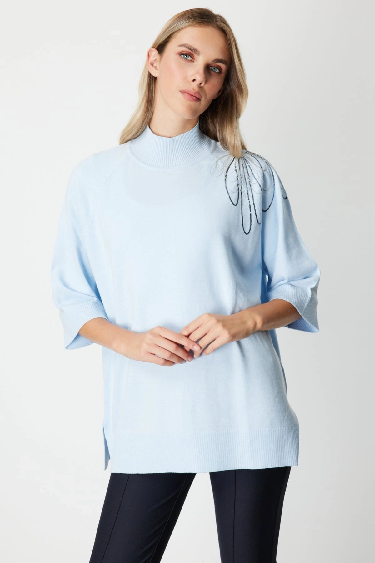 Dik yaka tasarımı, modern ve net bir siluet oluştururken, yarım kol – truvakar kol formu ürüne özgün bir stil kazandırır. 70 cm ürün boyu, hem pantolon hem etek kombinleriyle uyumlu bir görünüm sunar. Ürün çekimlerinde yer alan manken 1.76 cm boyunda olup en küçük bedeni giymektedir, kalıp yapısı hakkında referans sağlar.