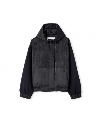 Çift parça görünümlü ve kumaş mixli tasarımı, bomber montu modern ve dinamik bir stile taşır. Büzgü detayları, tasarıma hareket kazandırırken rahat kesimi gün boyu konforlu bir kullanım sağlar. Kapüşonlu yapısı ve fermuar kapaması, fonksiyonelliği artırarak günlük kombinler için güçlü bir alternatif sunar.